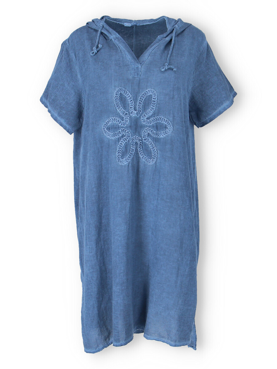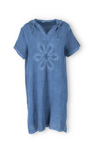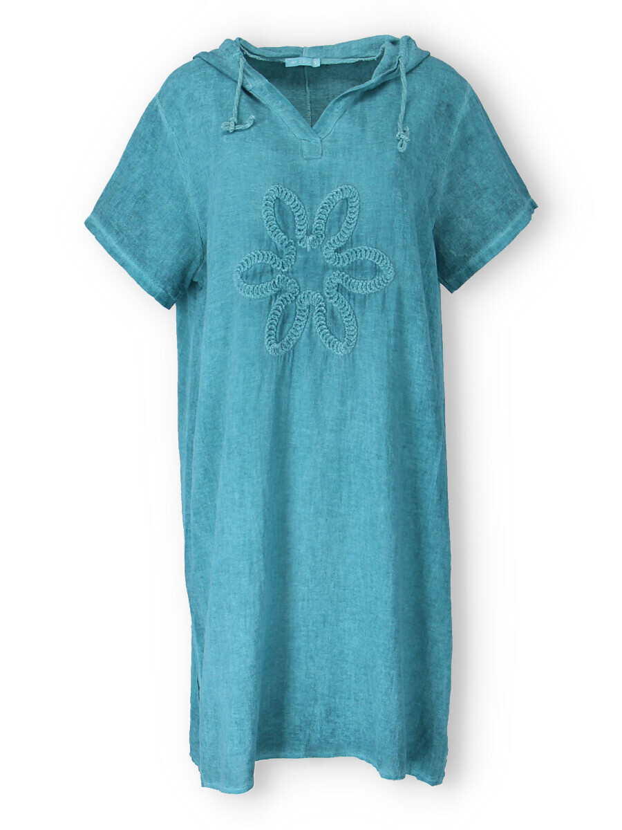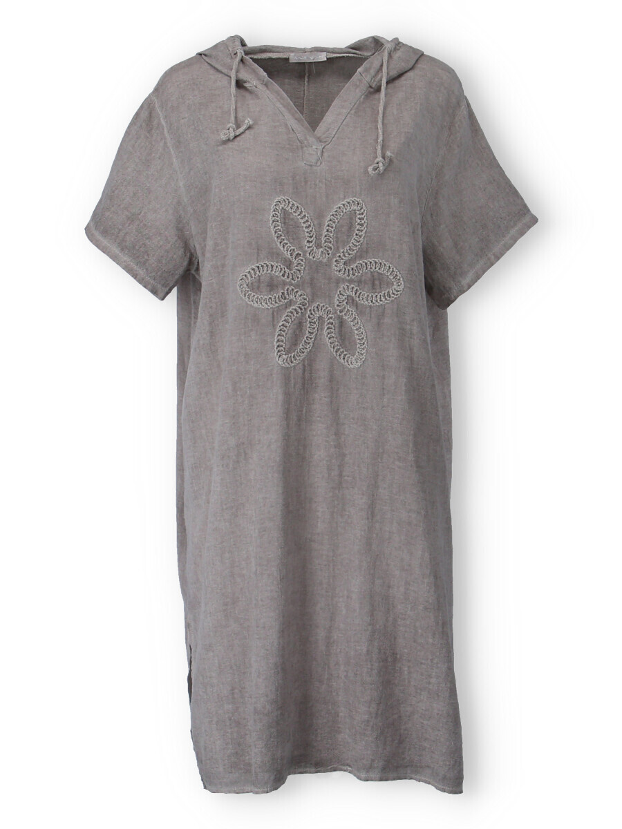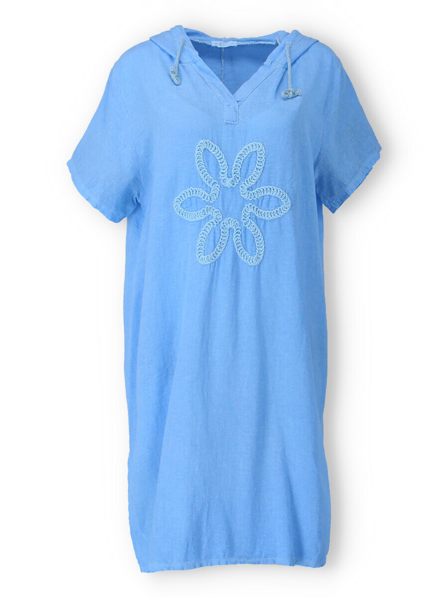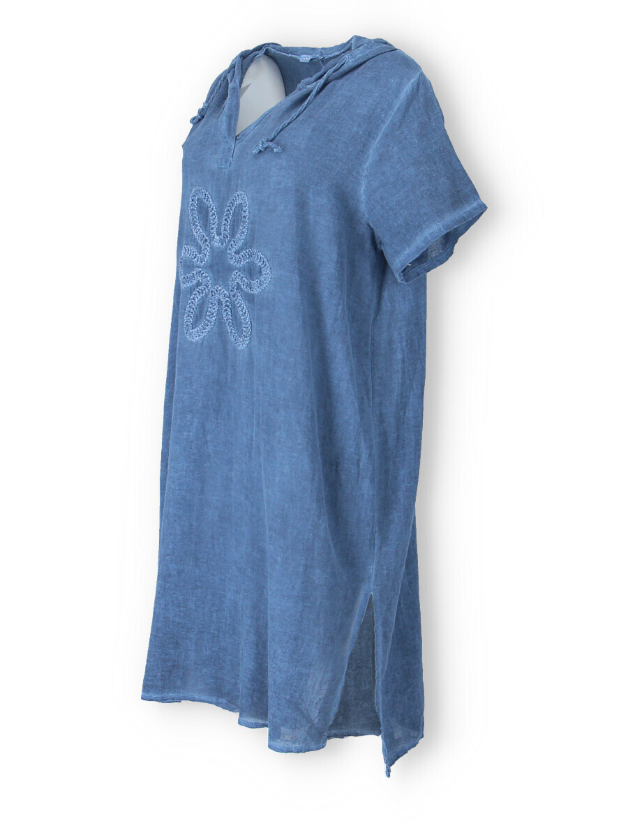 Šatovka s kapucí s krátkým rukávem. Šatovka má prodlouženou zadní, kapuci, výstřih do V a na přední straně aplikaci květu.