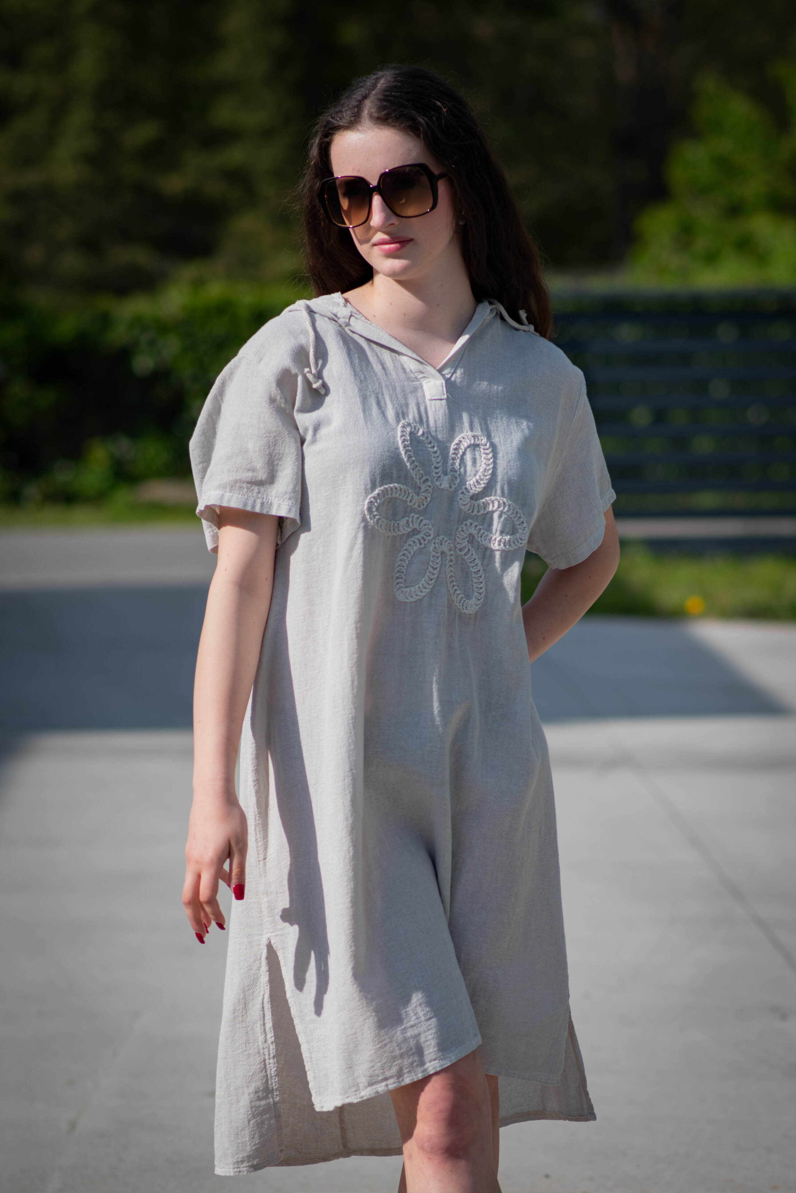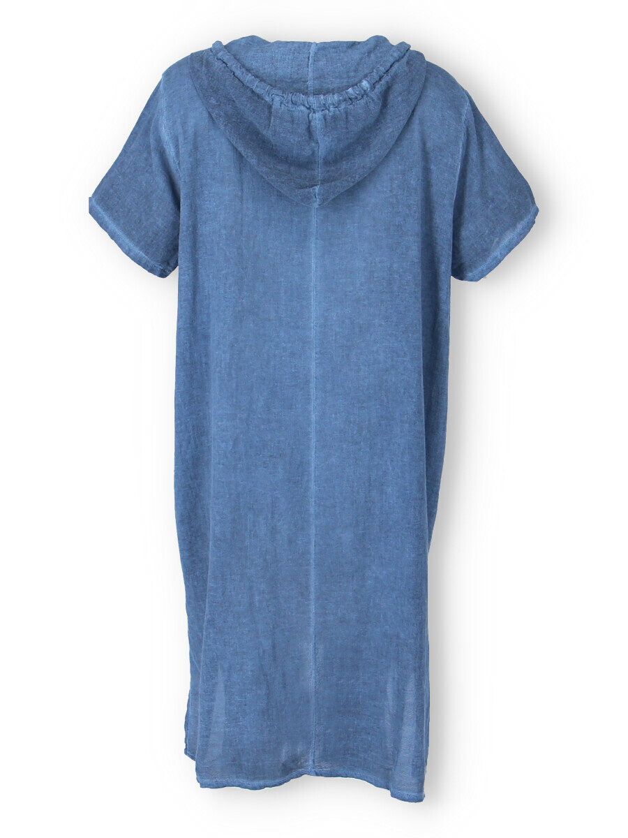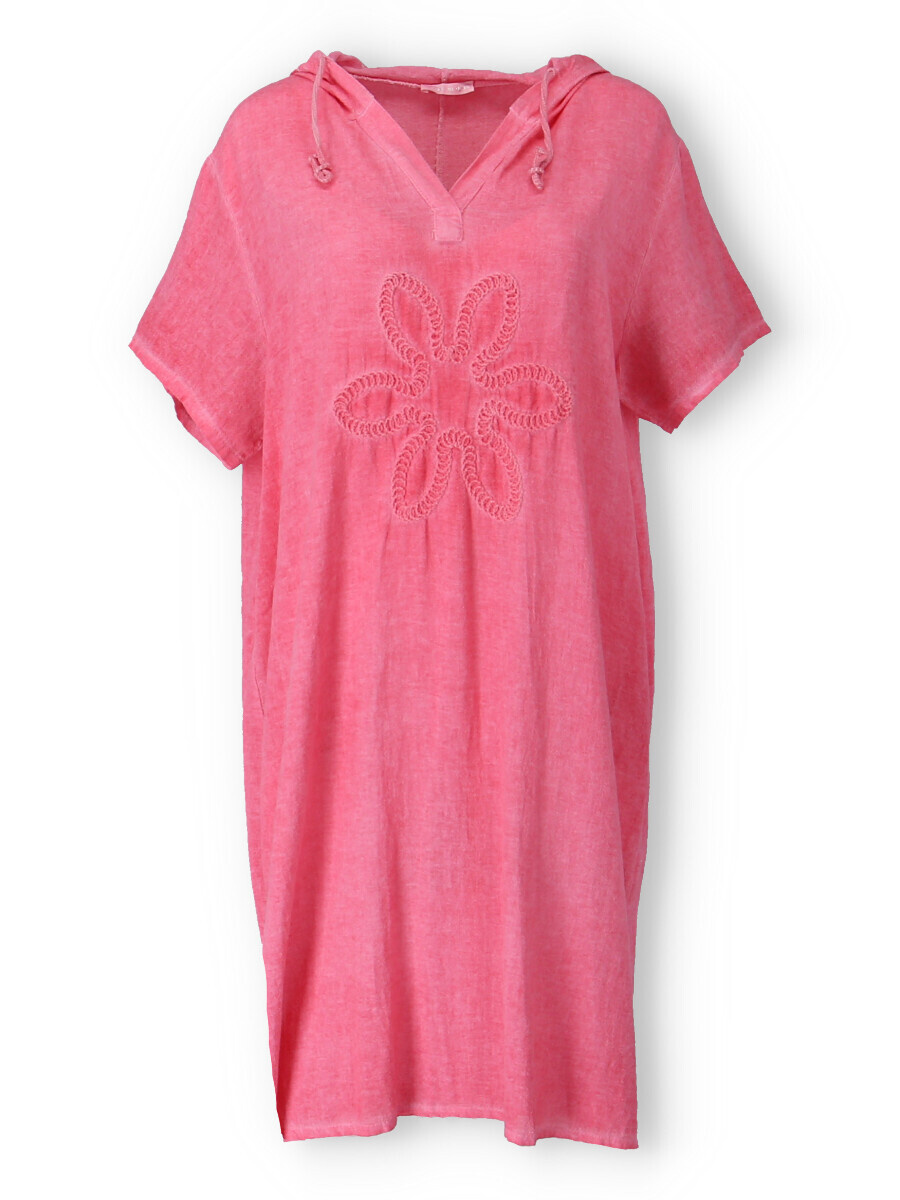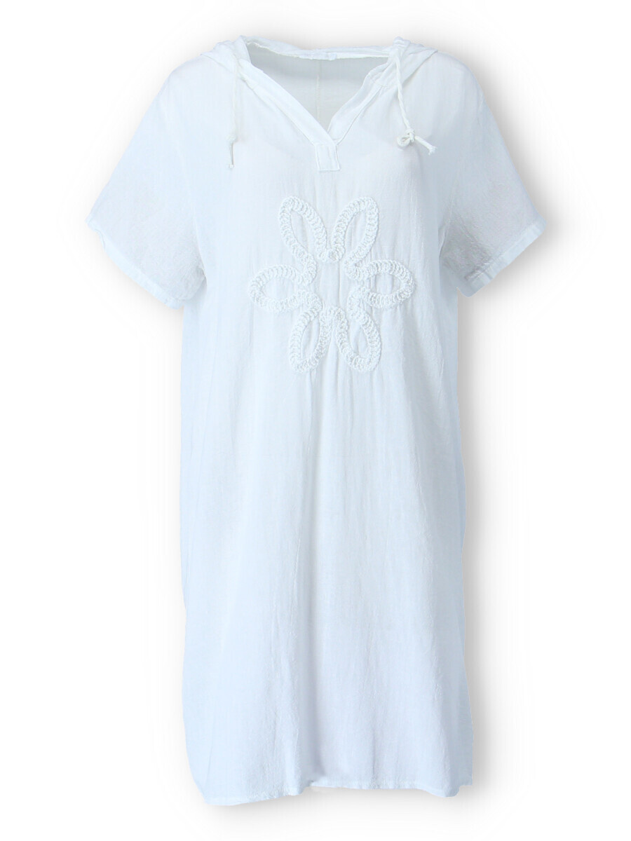 Šatovka s kapucí s krátkým rukávem. Šatovka má prodlouženou zadní, kapuci, výstřih do V a na přední straně aplikaci květu.