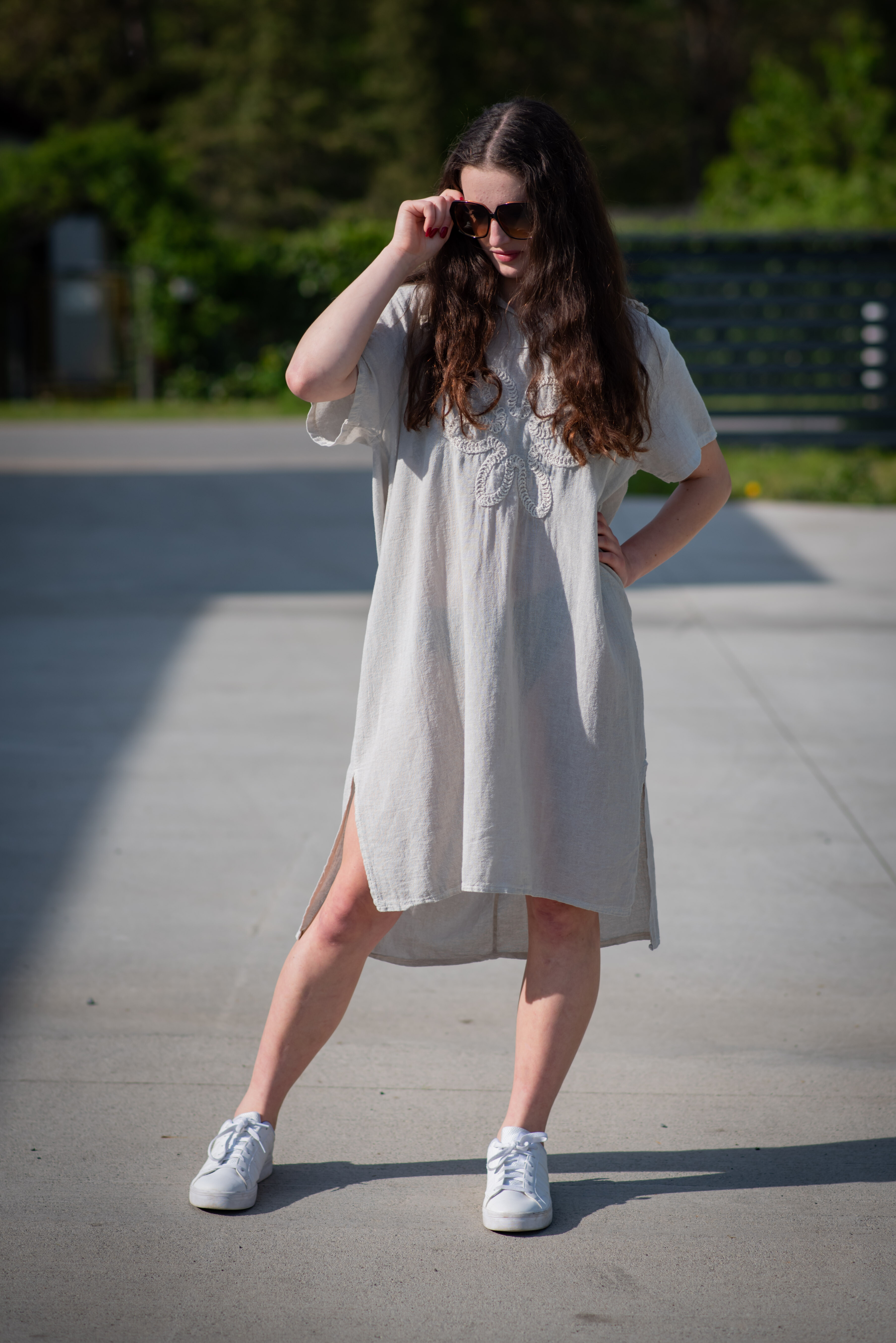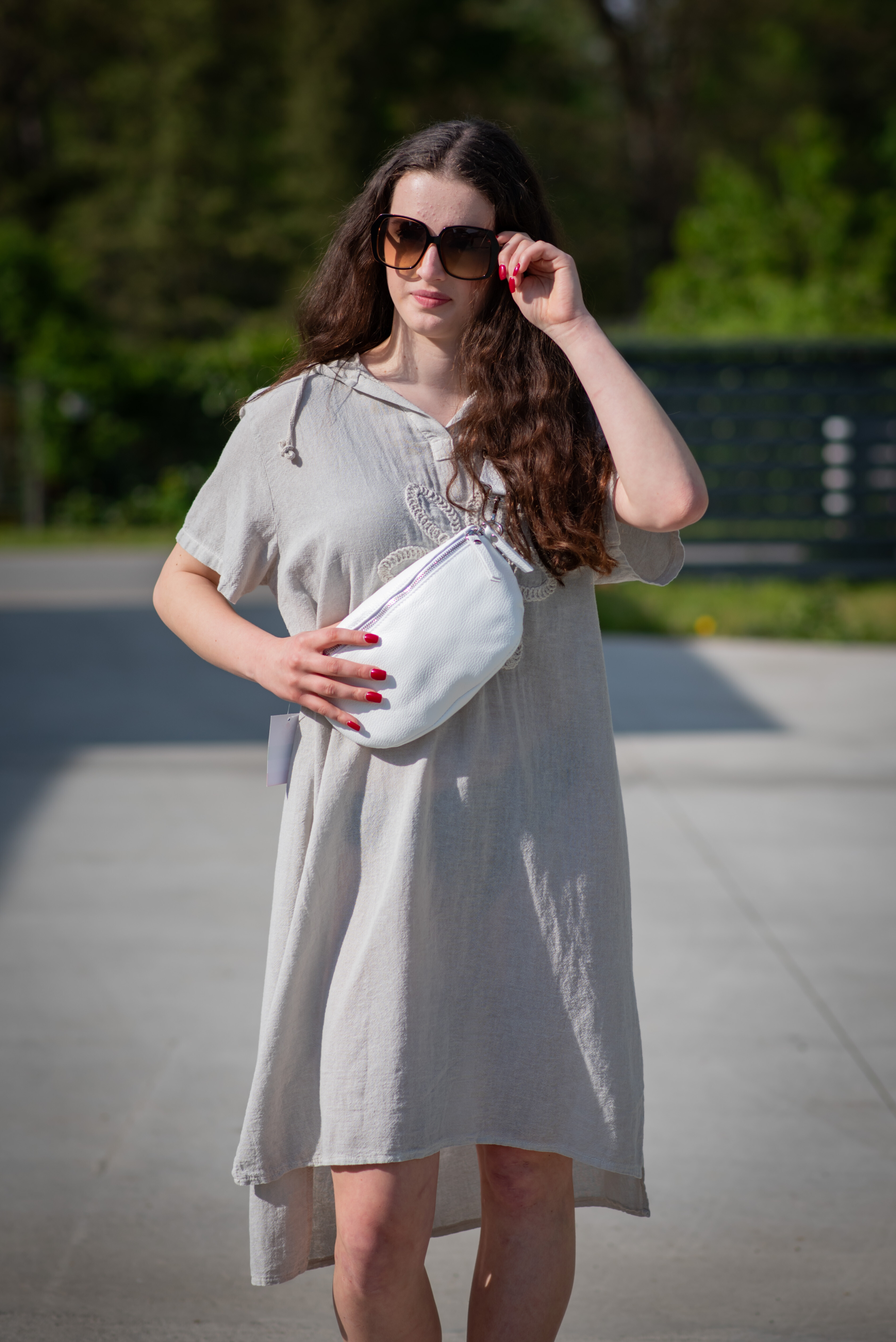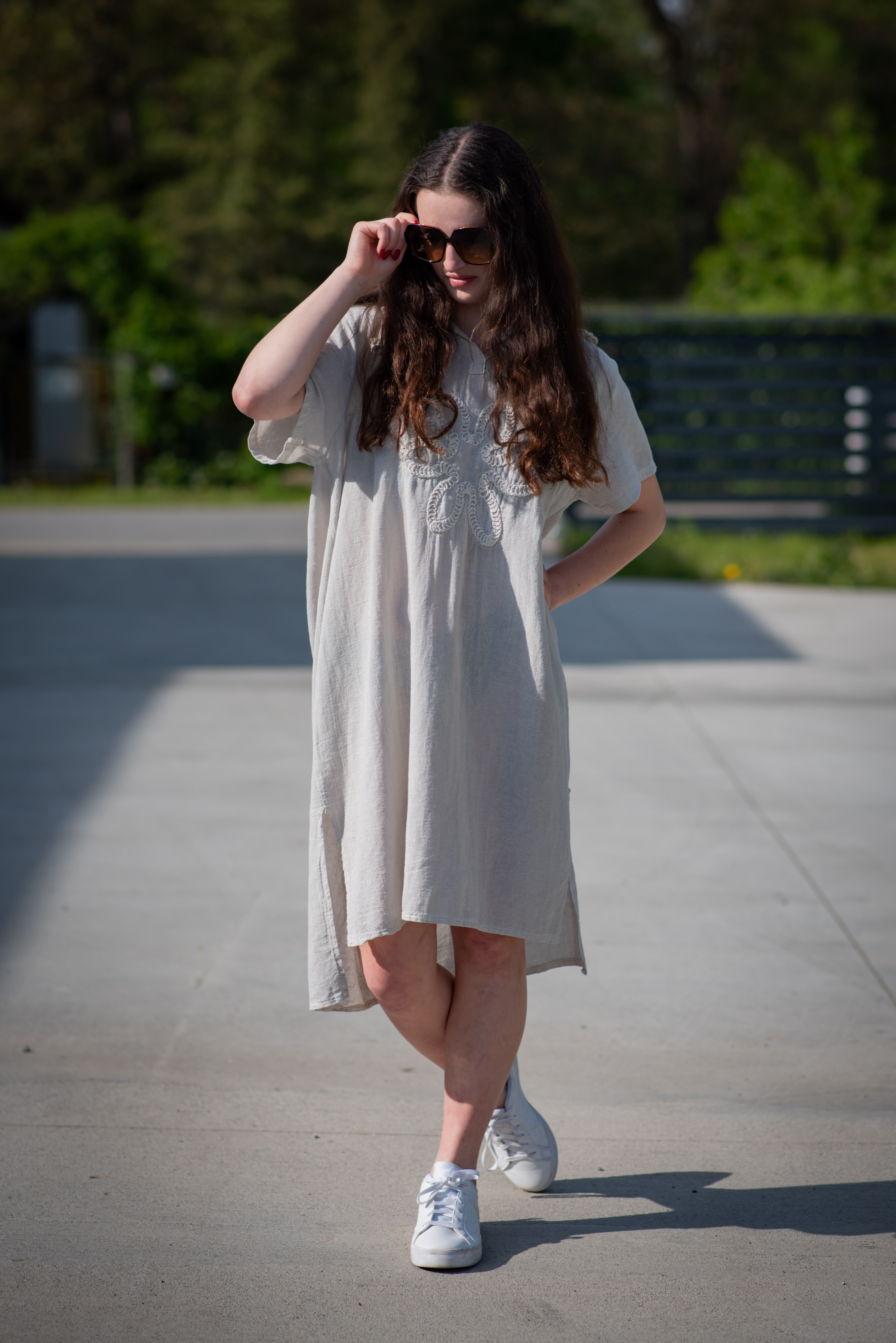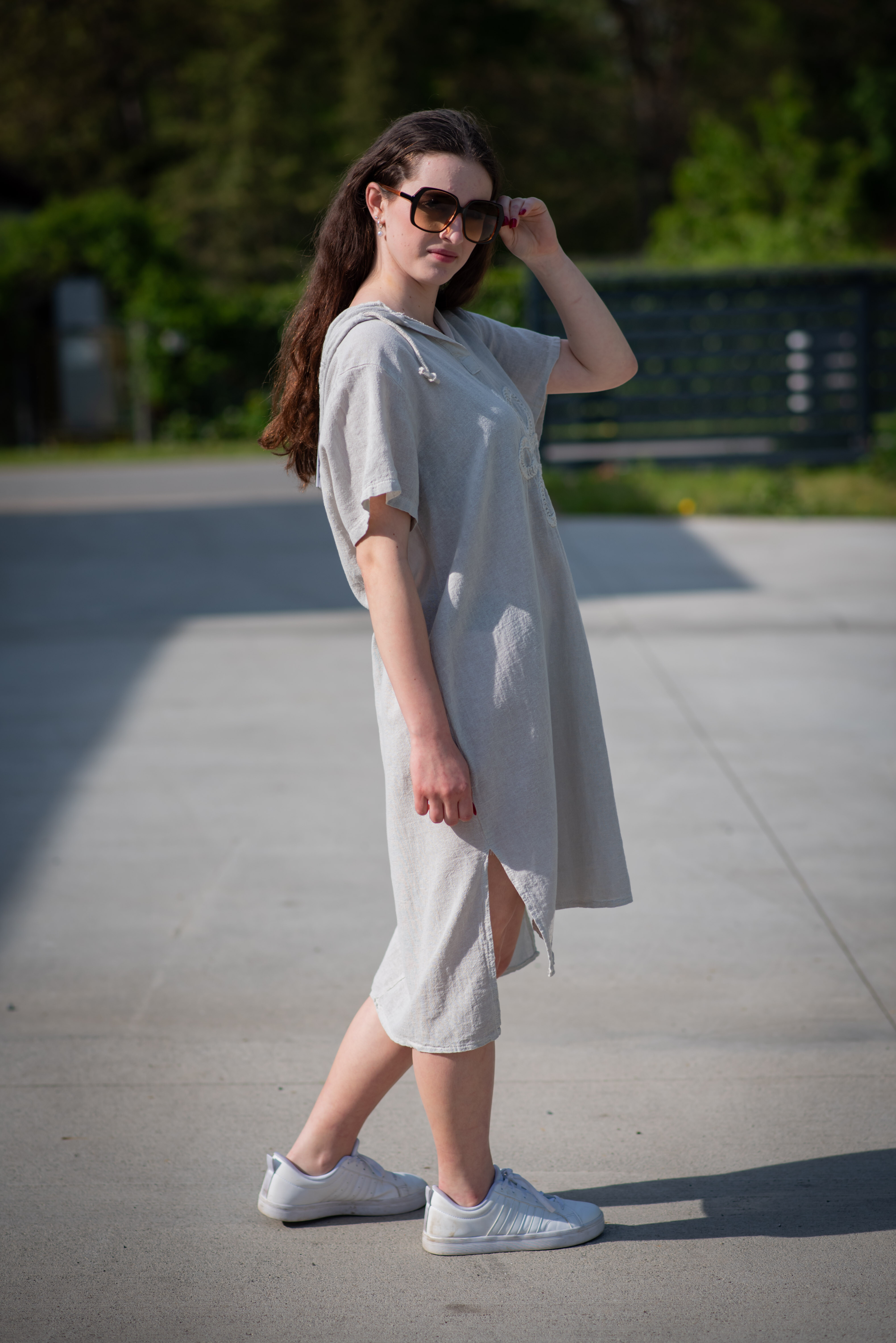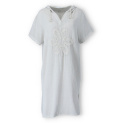 Šatovka s kapucí s krátkým rukávem. Šatovka má prodlouženou zadní, kapuci, výstřih do V a na přední straně aplikaci květu.
