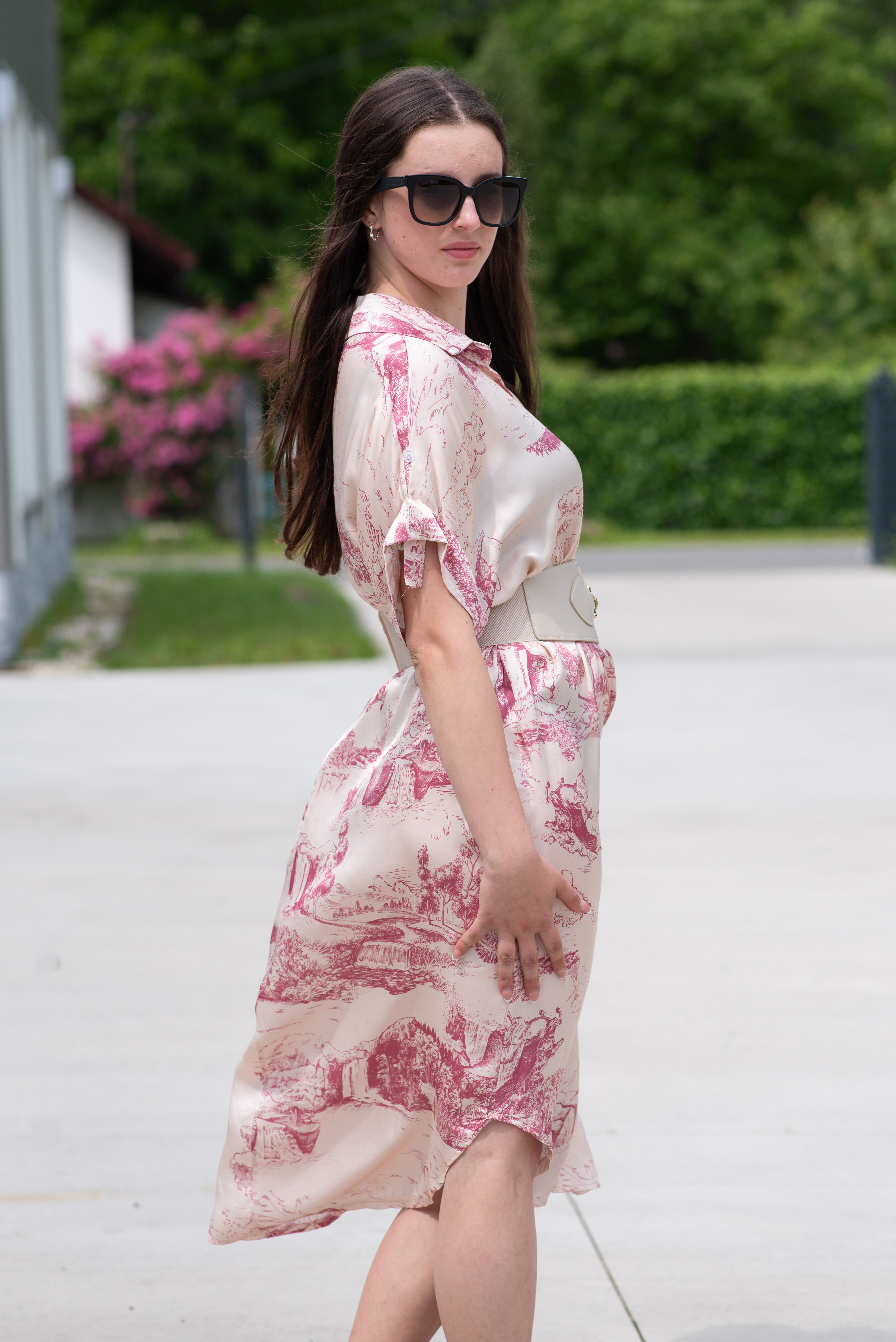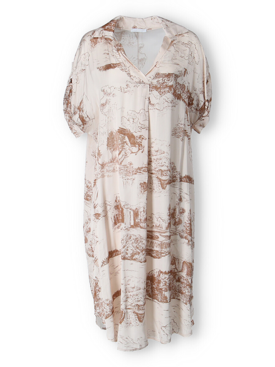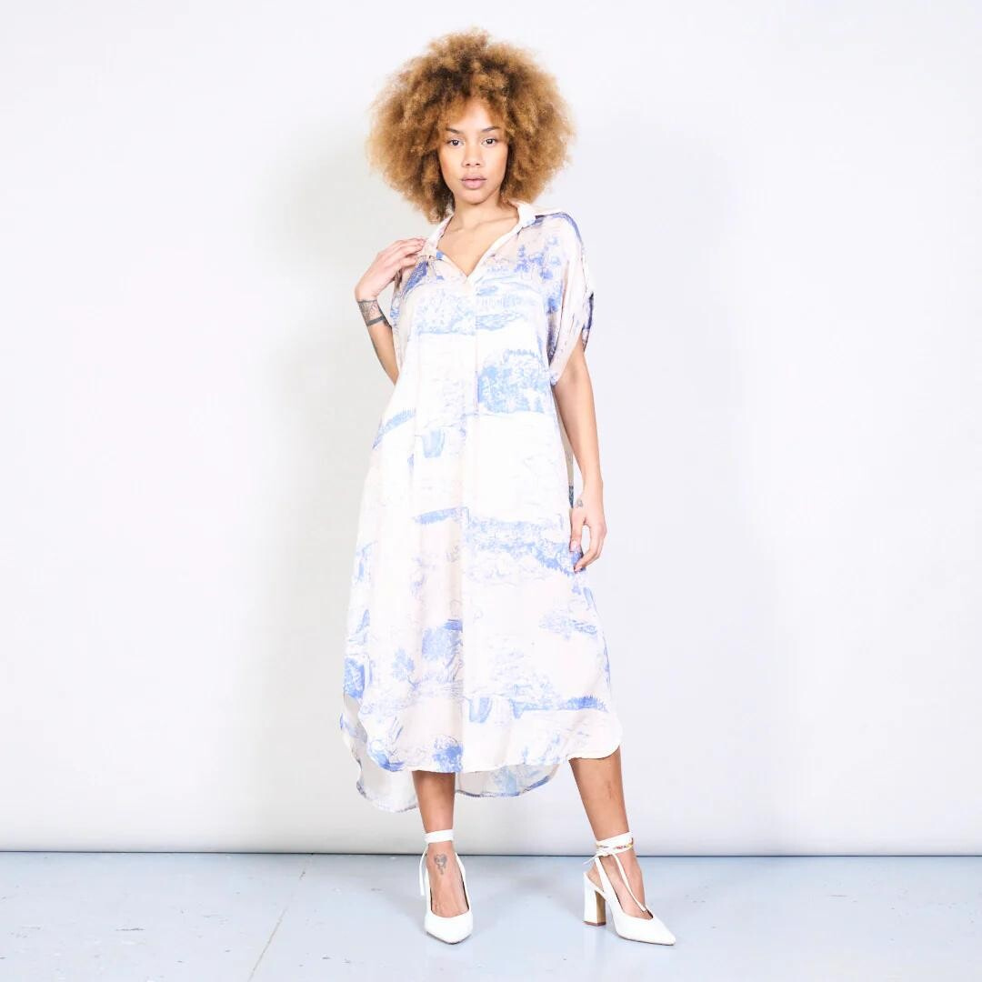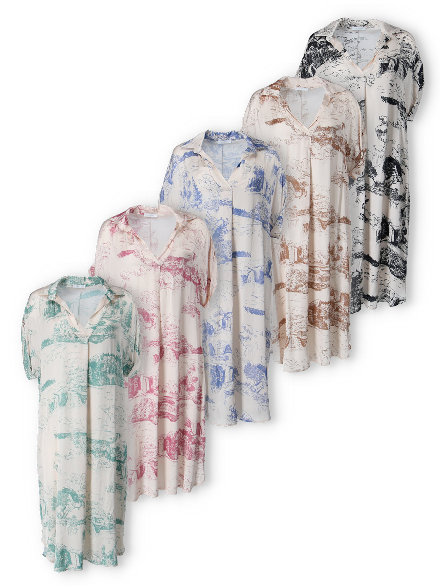 Módní dlouhá košilová šatovka s límečkem. Šatovka má krátký rukáv a výstřih do V.