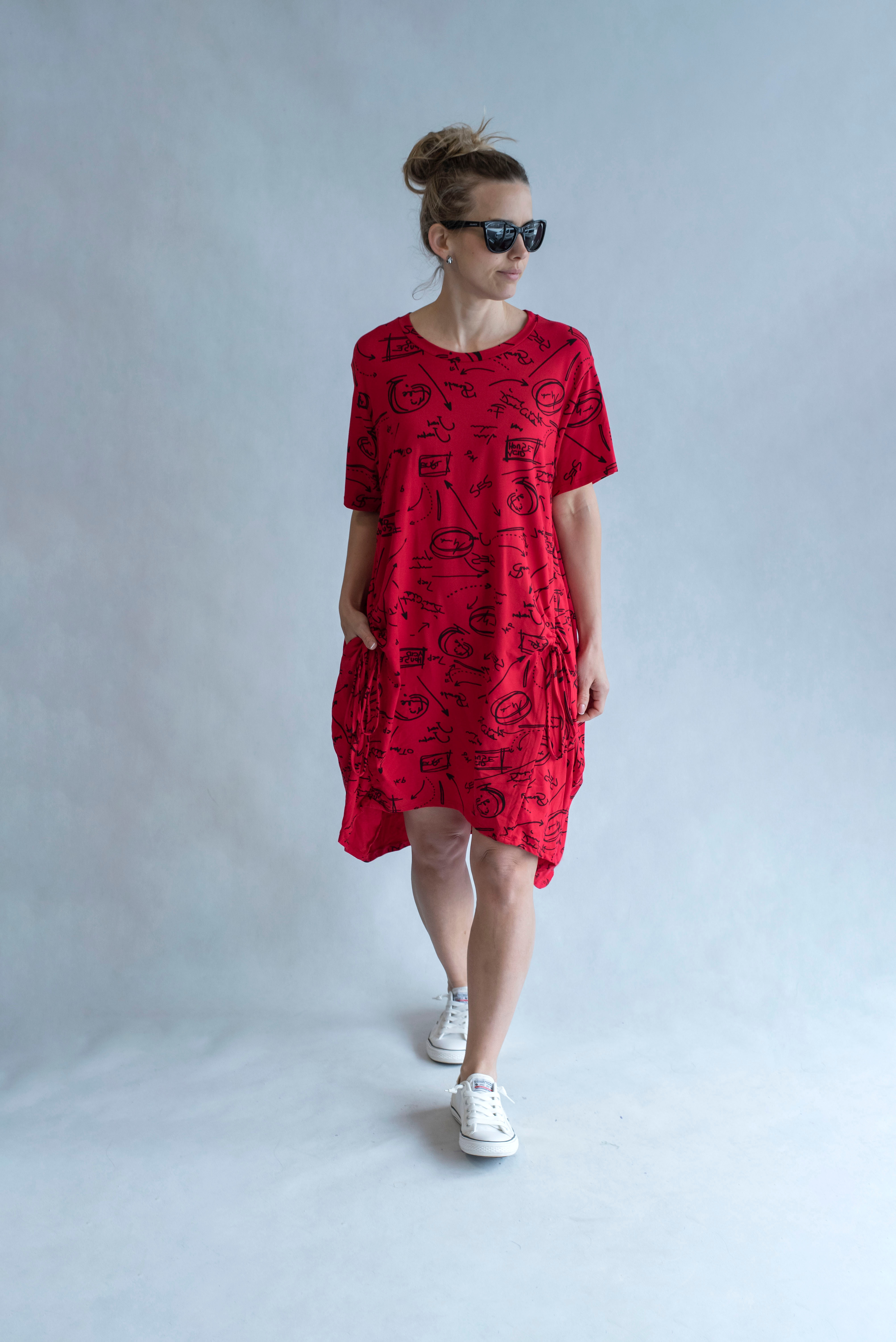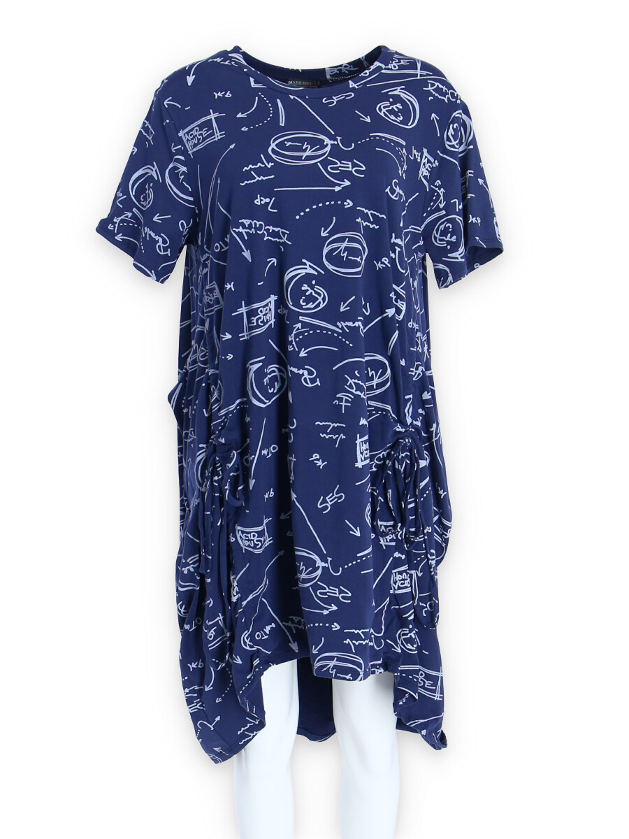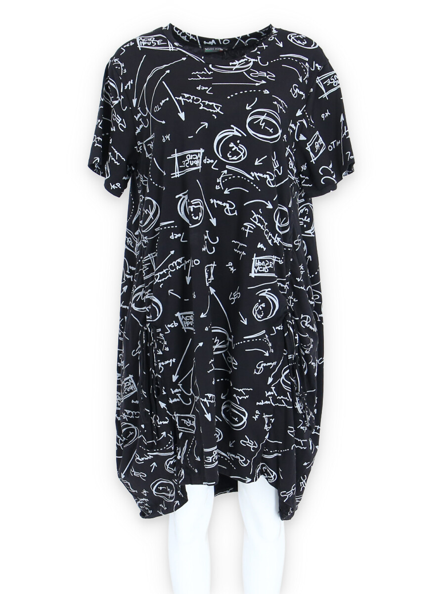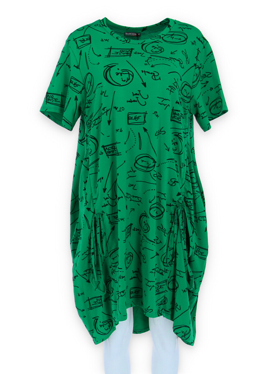 Dámská šatovka denní nošení s potiskem, všité kapsy po stranách, balonový střih, krátký rukáv, vyrobeno v Italii