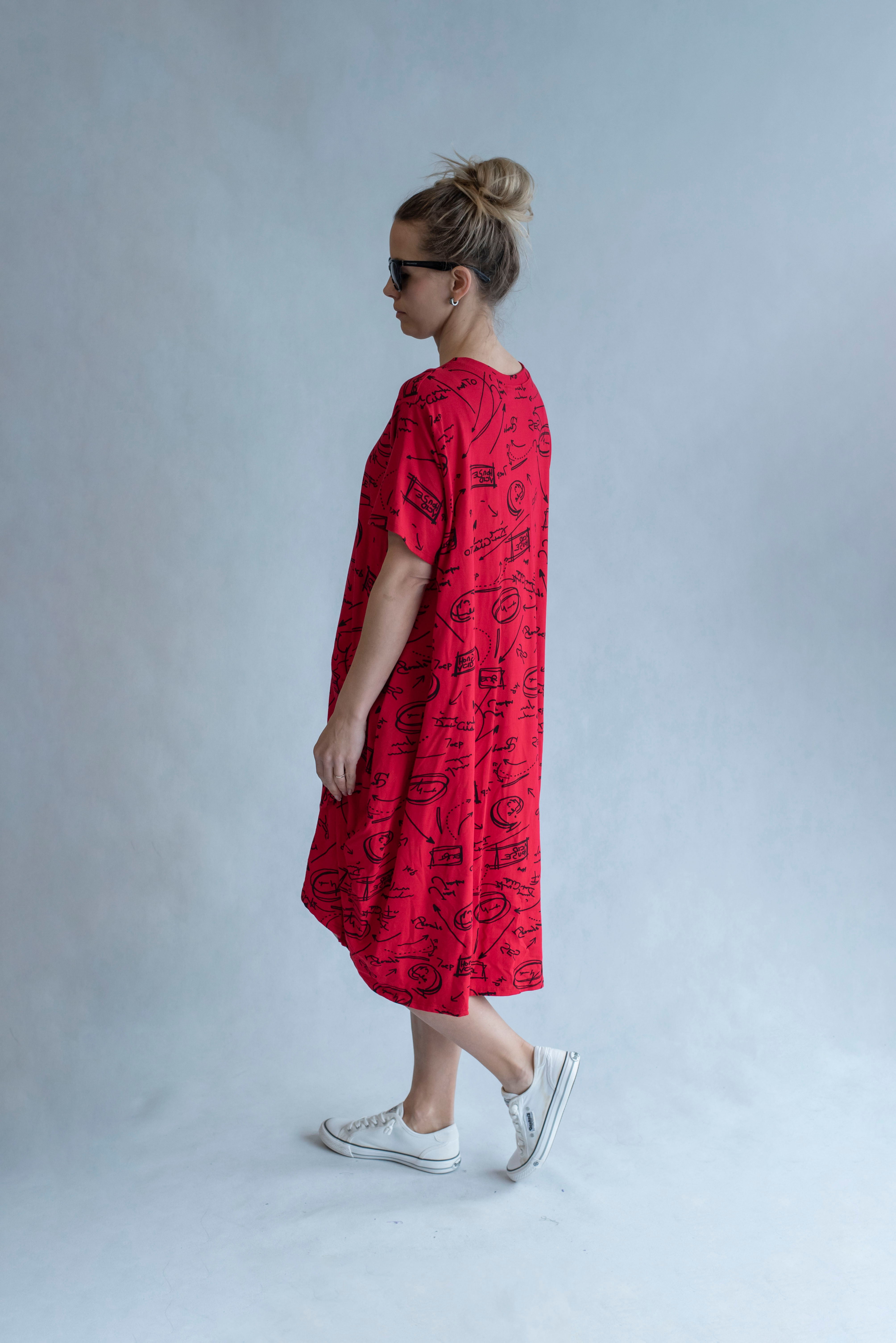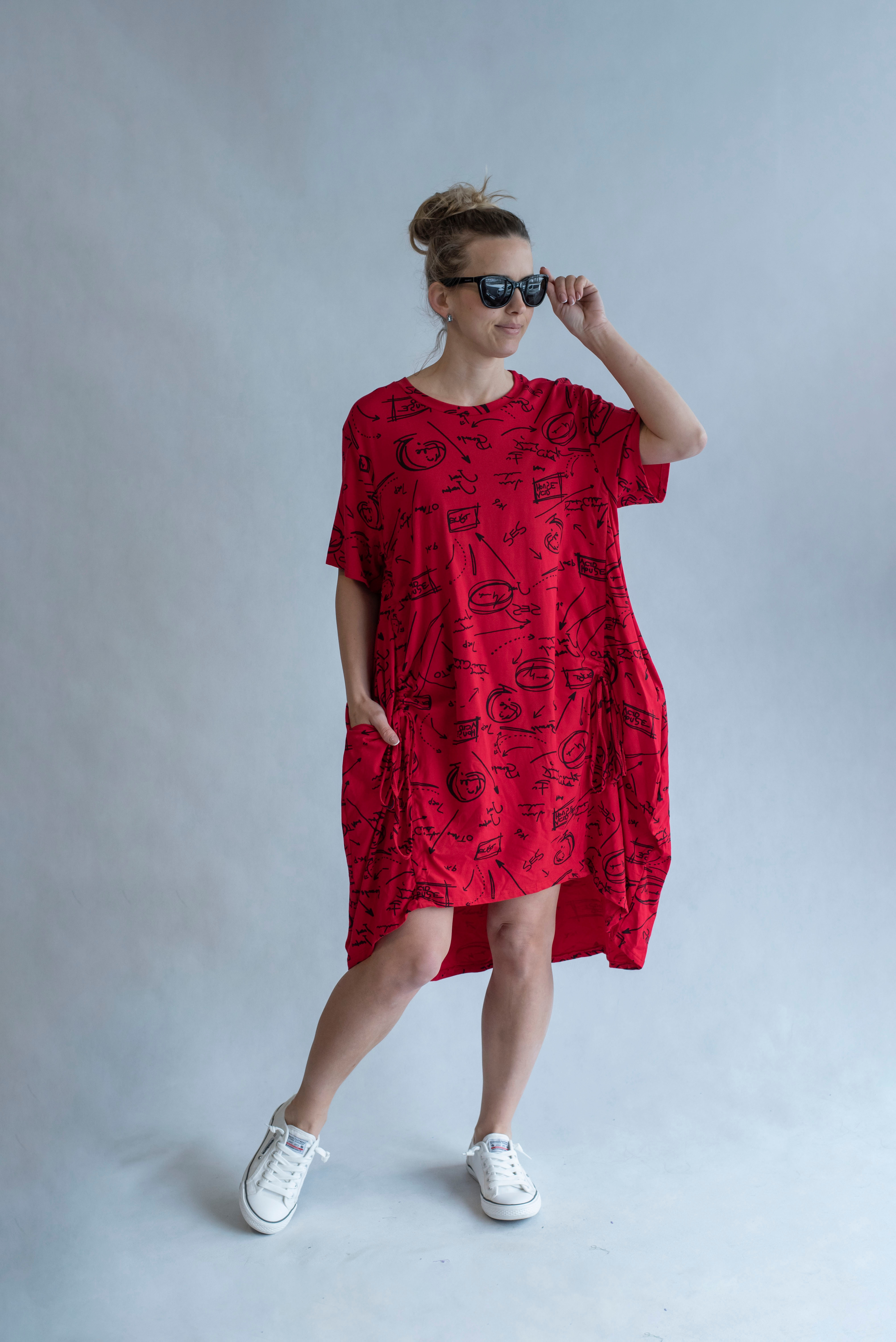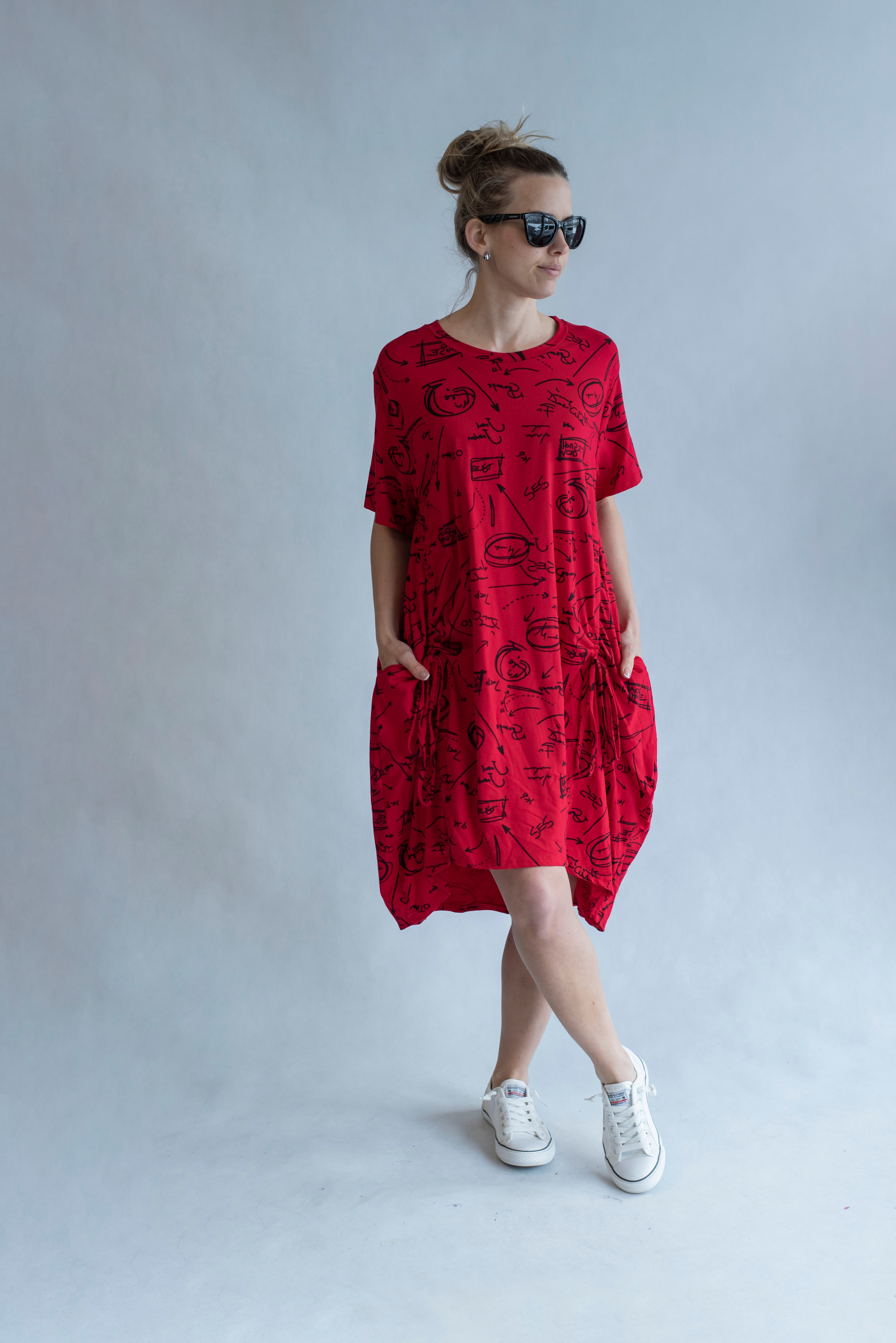Dámská šatovka denní nošení s potiskem, všité kapsy po stranách, balonový střih, krátký rukáv, vyrobeno v Italii