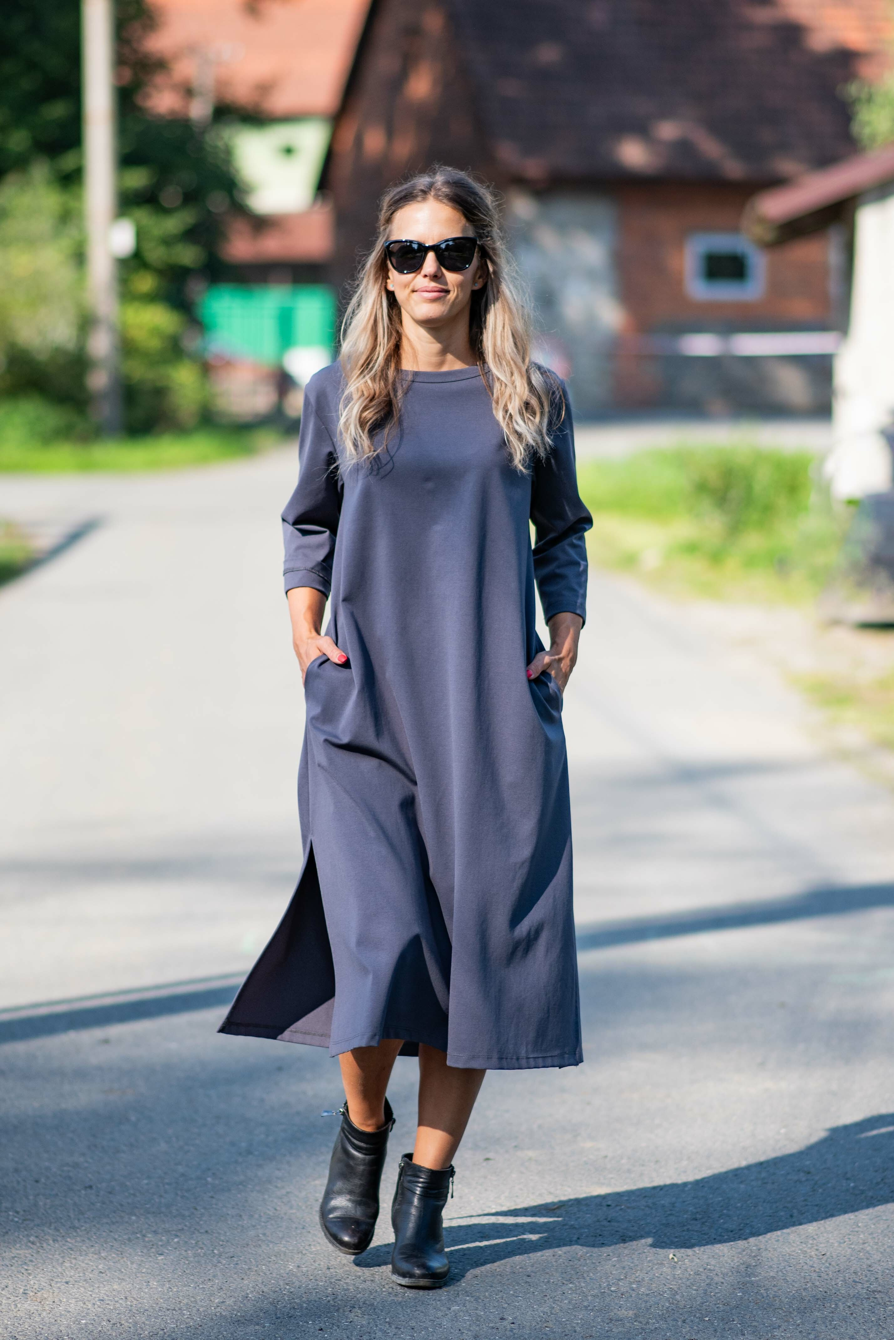 Módní bavlněné šaty s 3/4 rukávem Wendy Trendy, všitými kapsami a kulatým výstřihem .