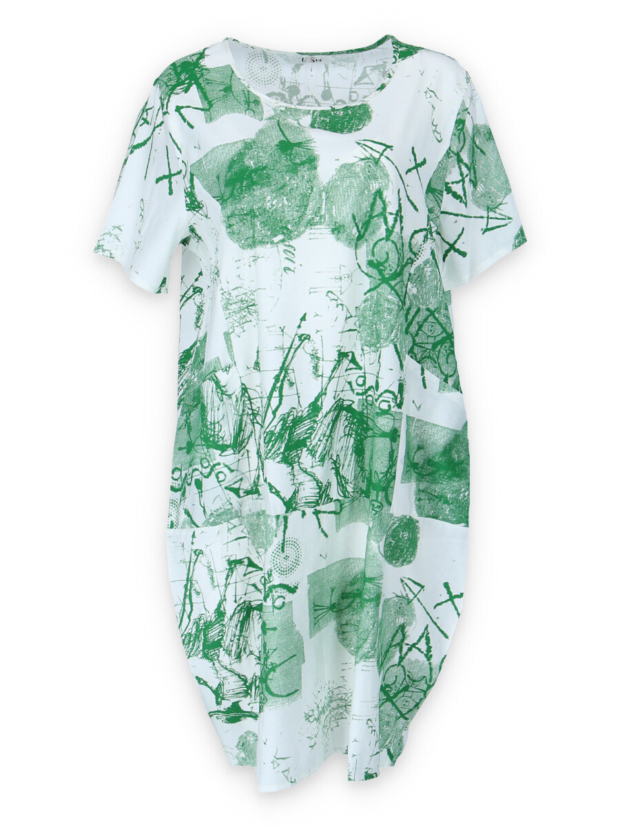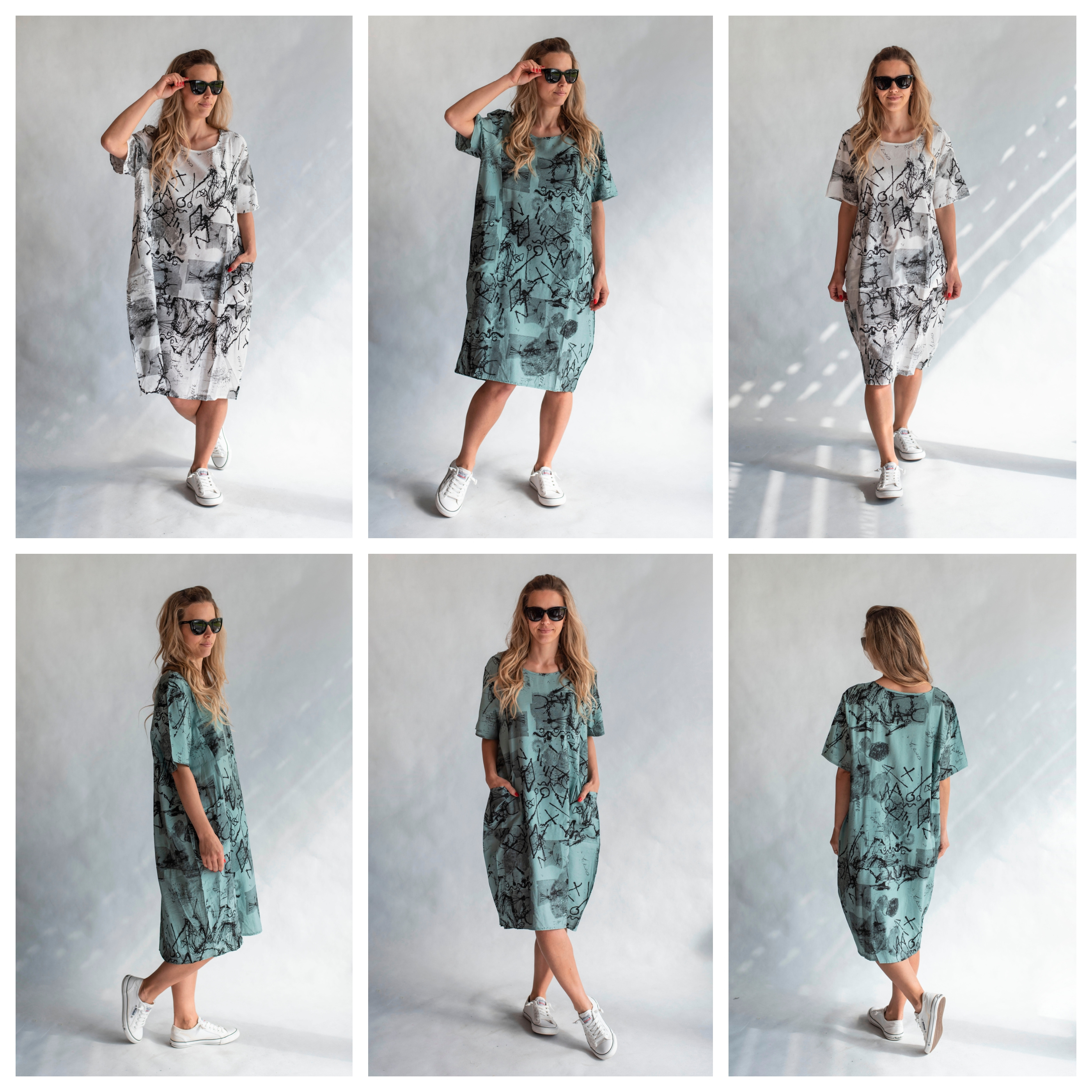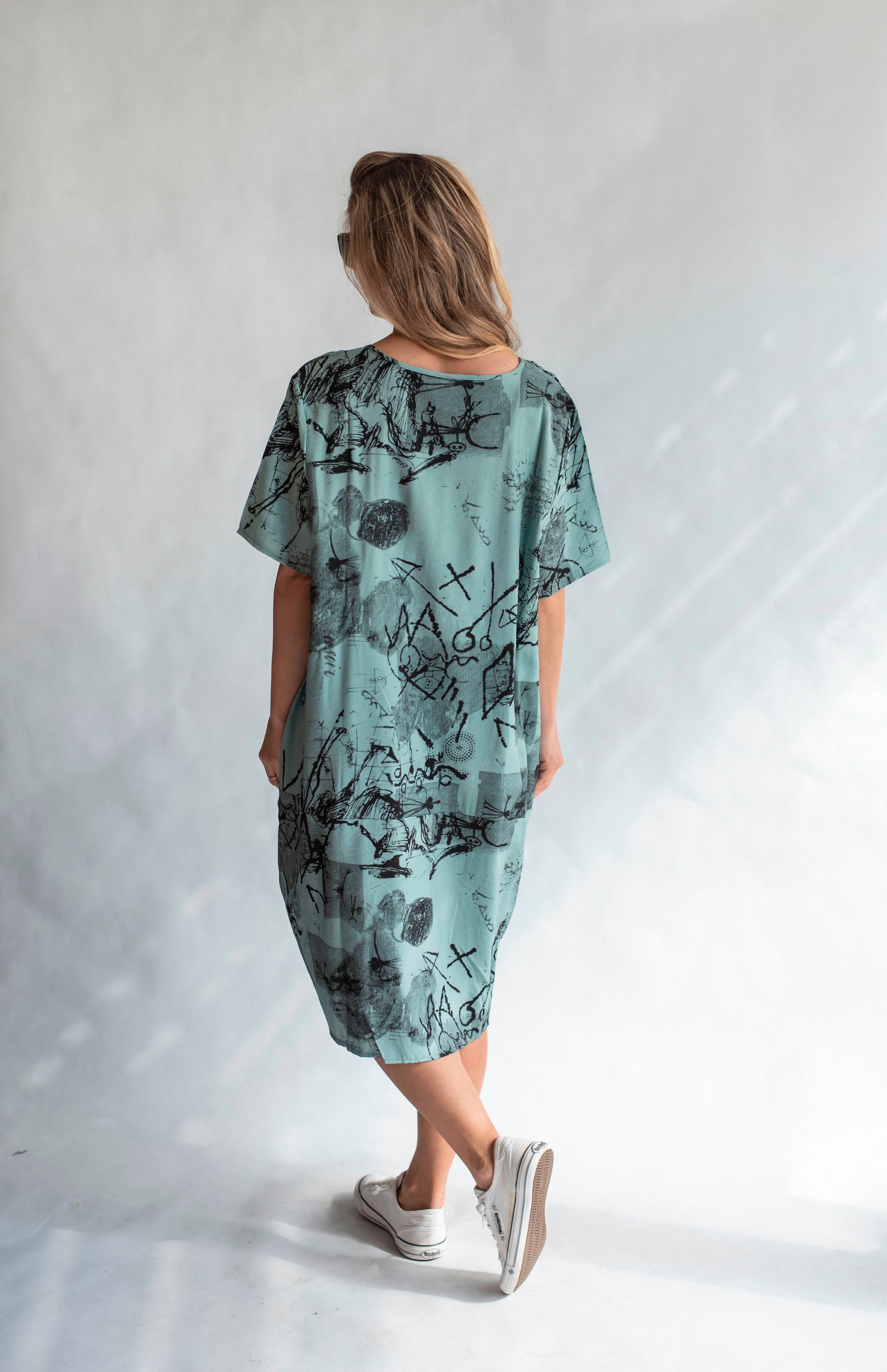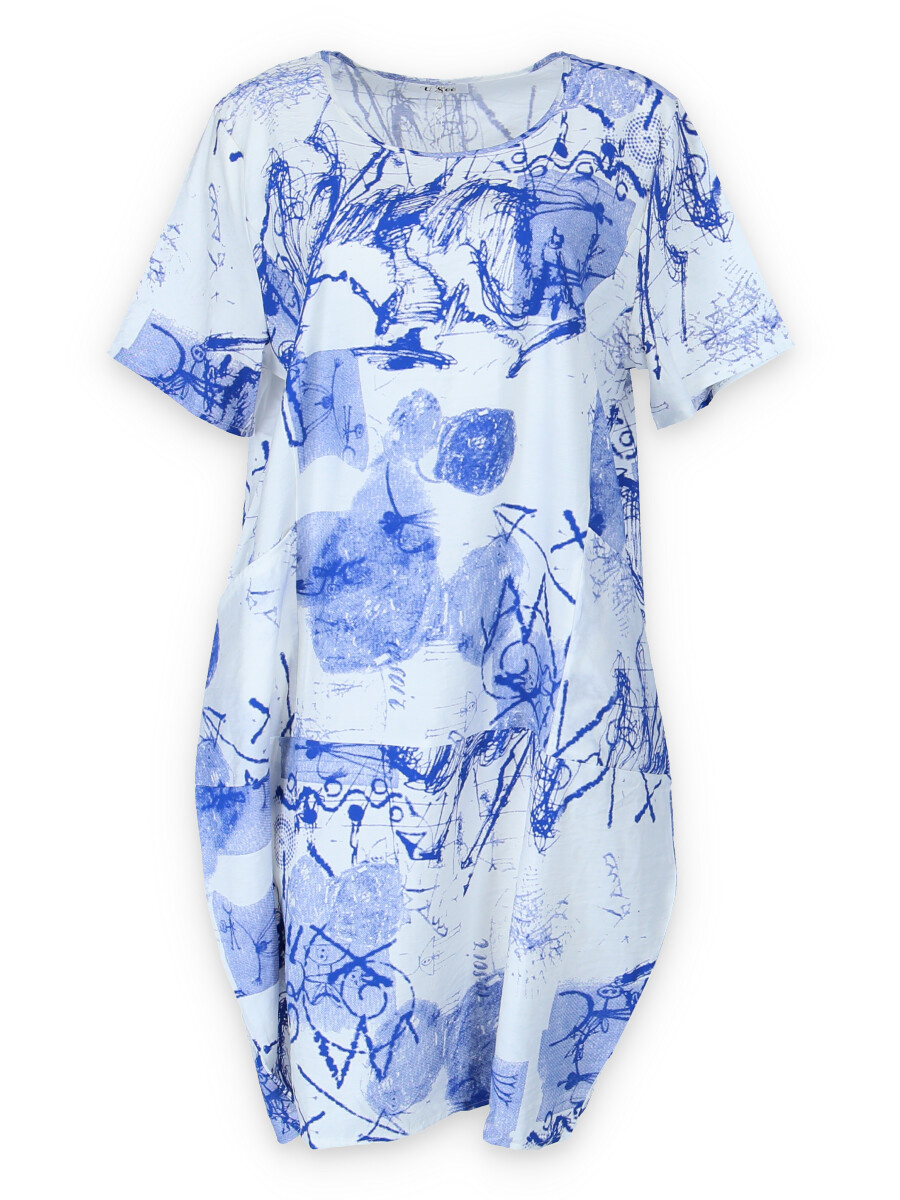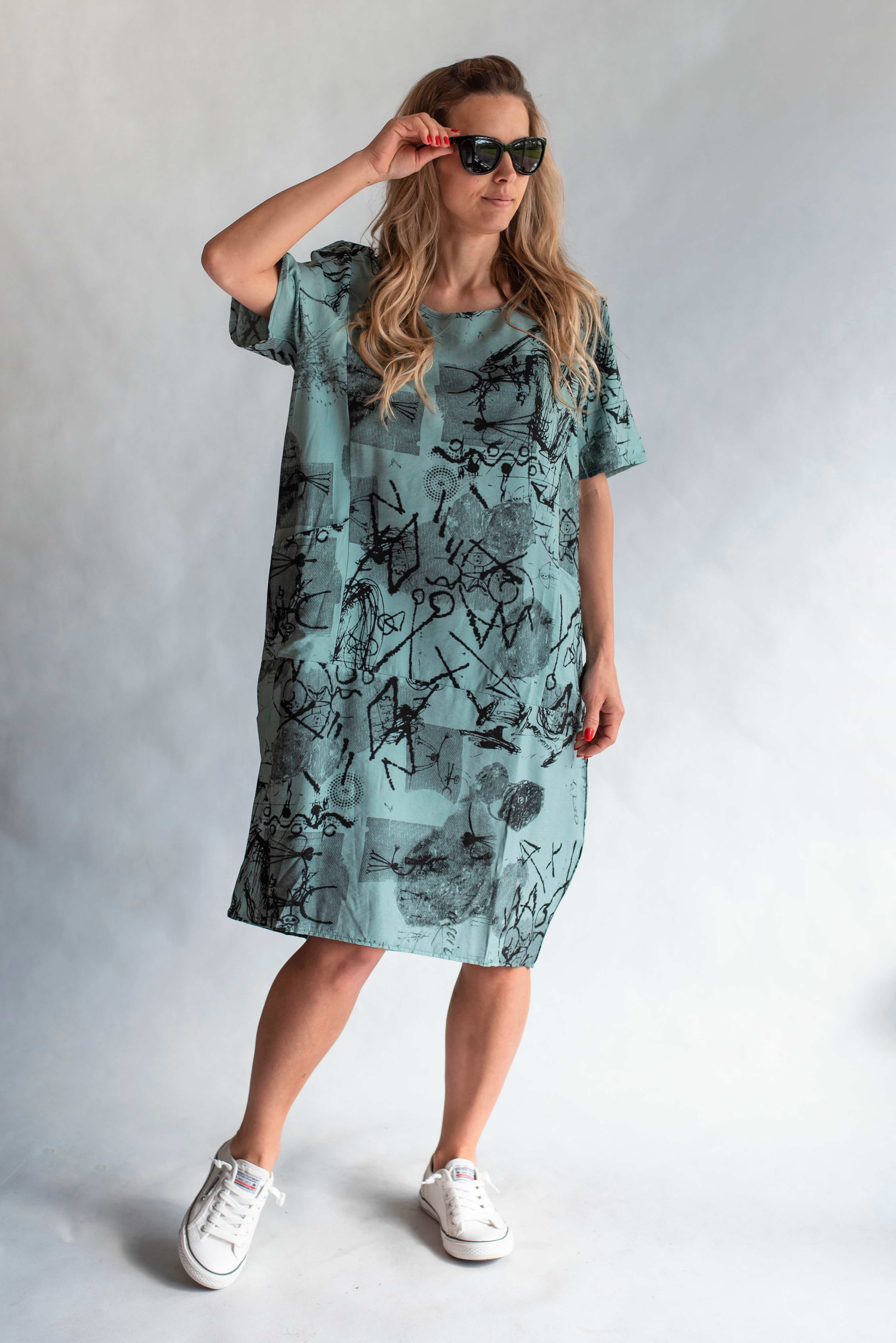 Balonové trendy šaty s potiskem, všité kapsy a kulatý výstřih.