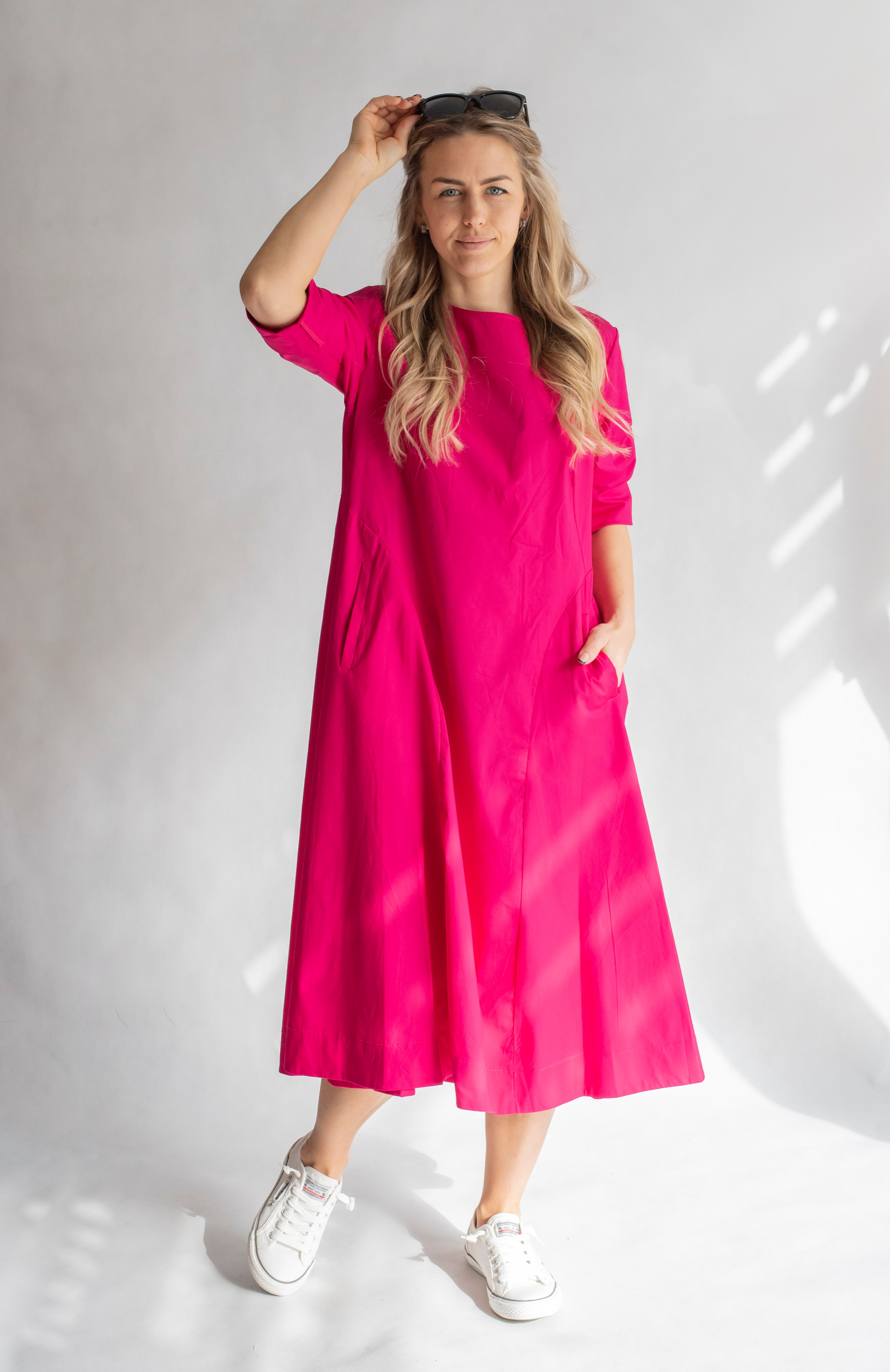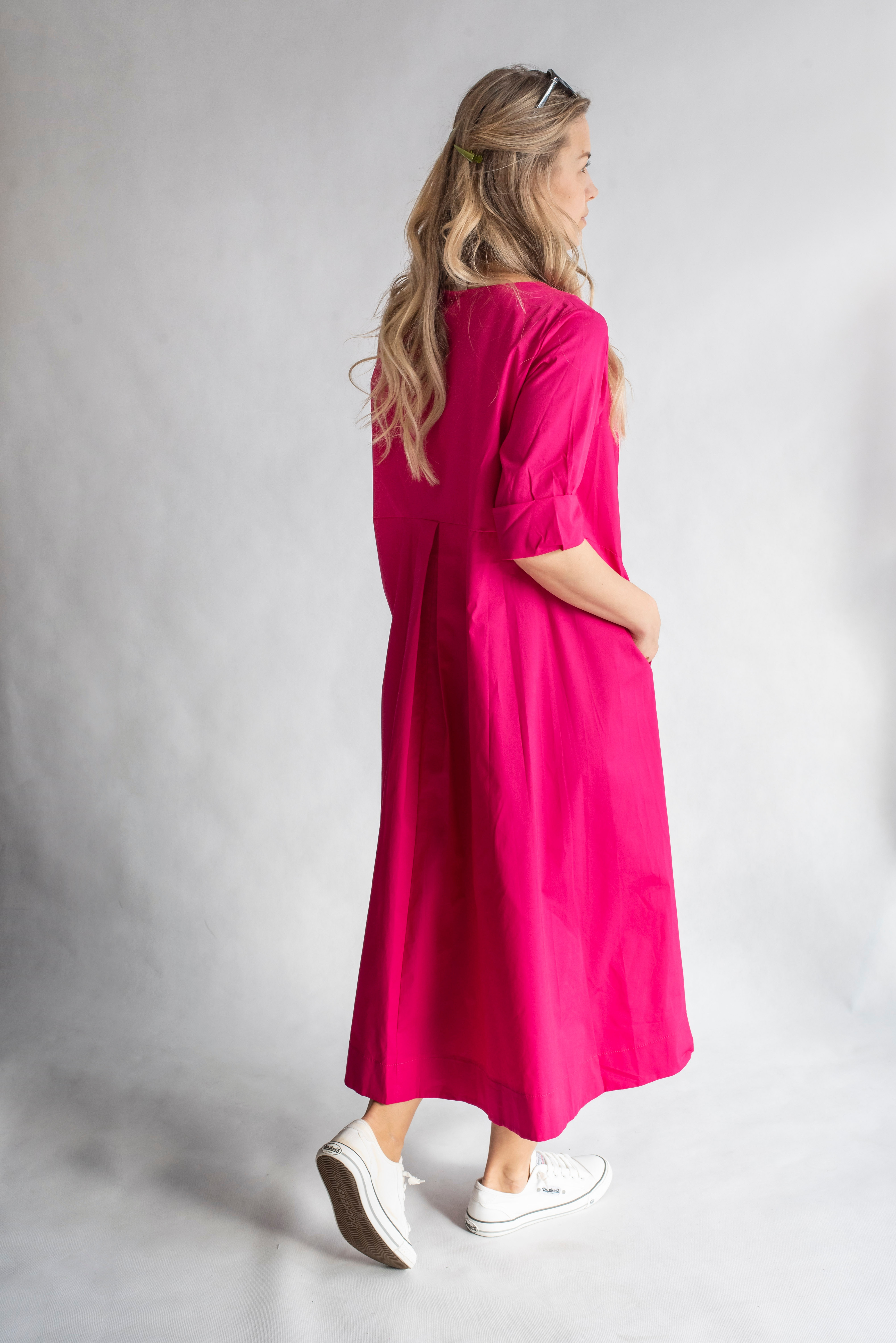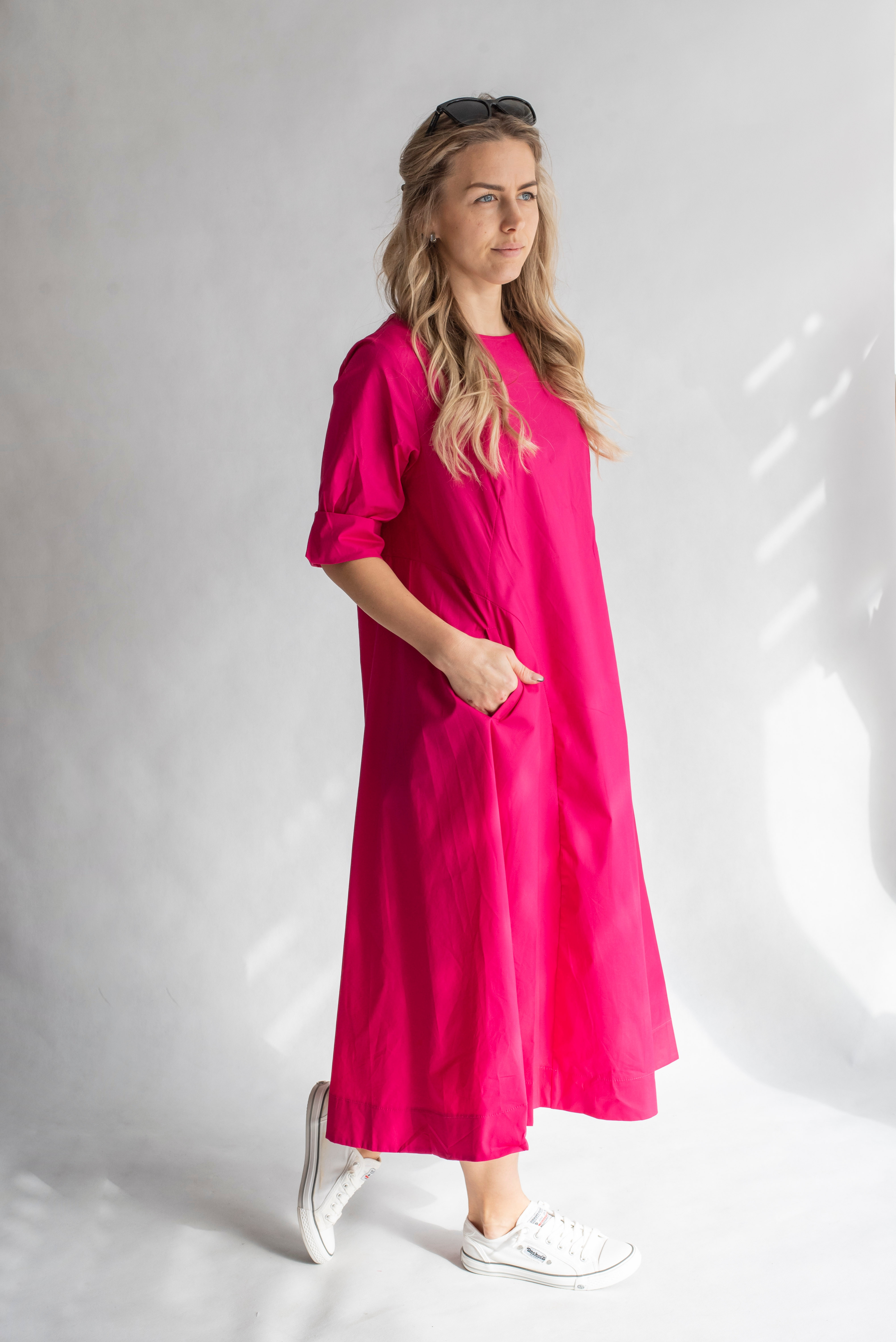 Módní dlouhé dámské šaty s 3/4 rukávem, všitými kapsami, kulatý výstřih