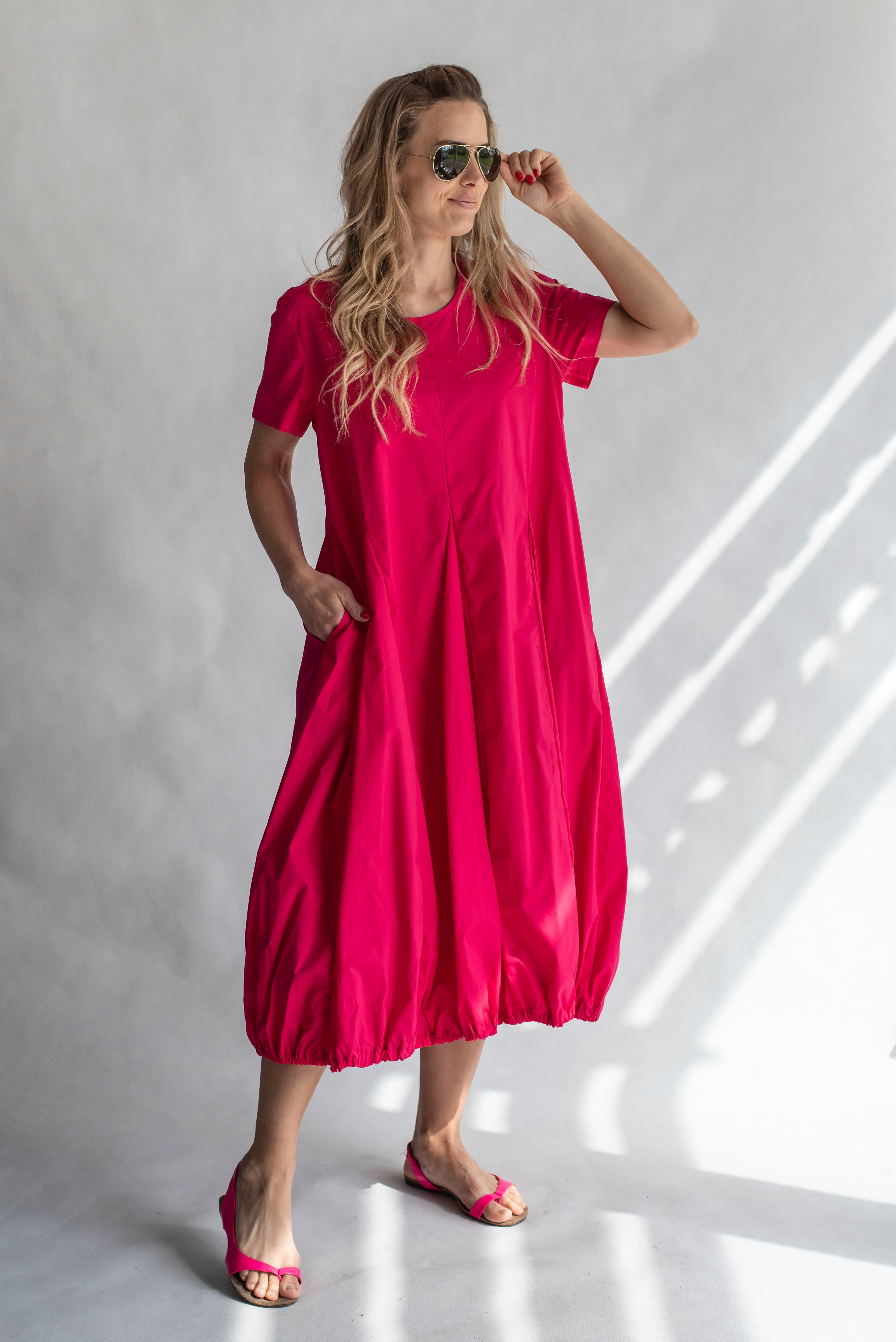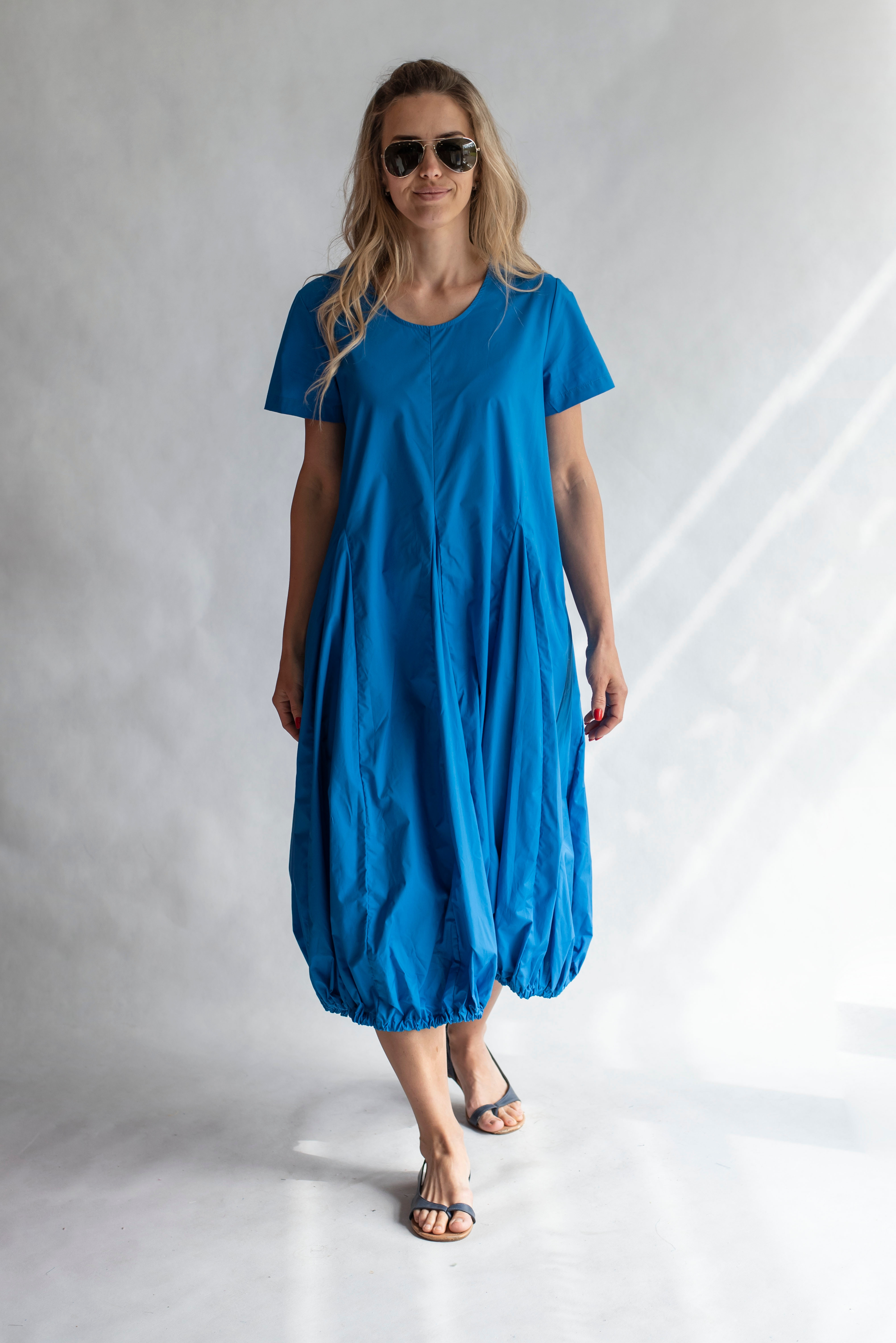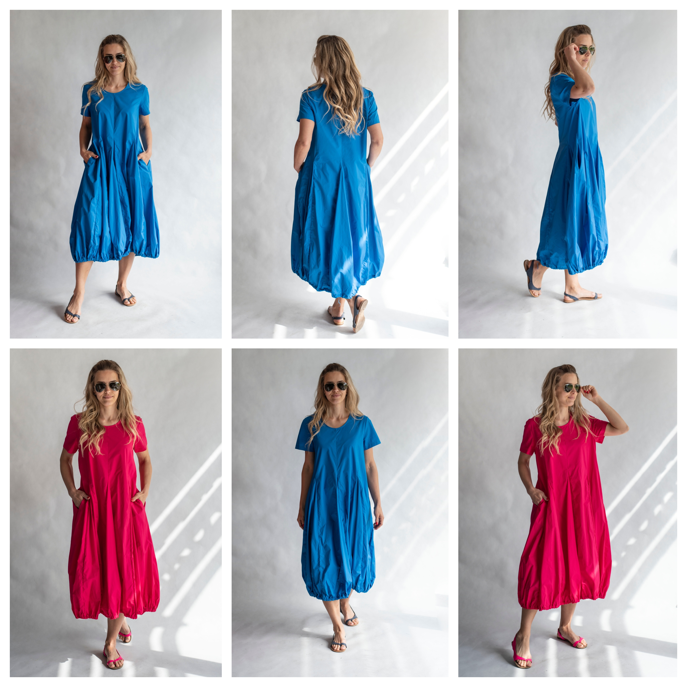 Letní dlouhé bavlněné šaty s krátkým rukávem, všitými kapsami ve spodní části do gumy .