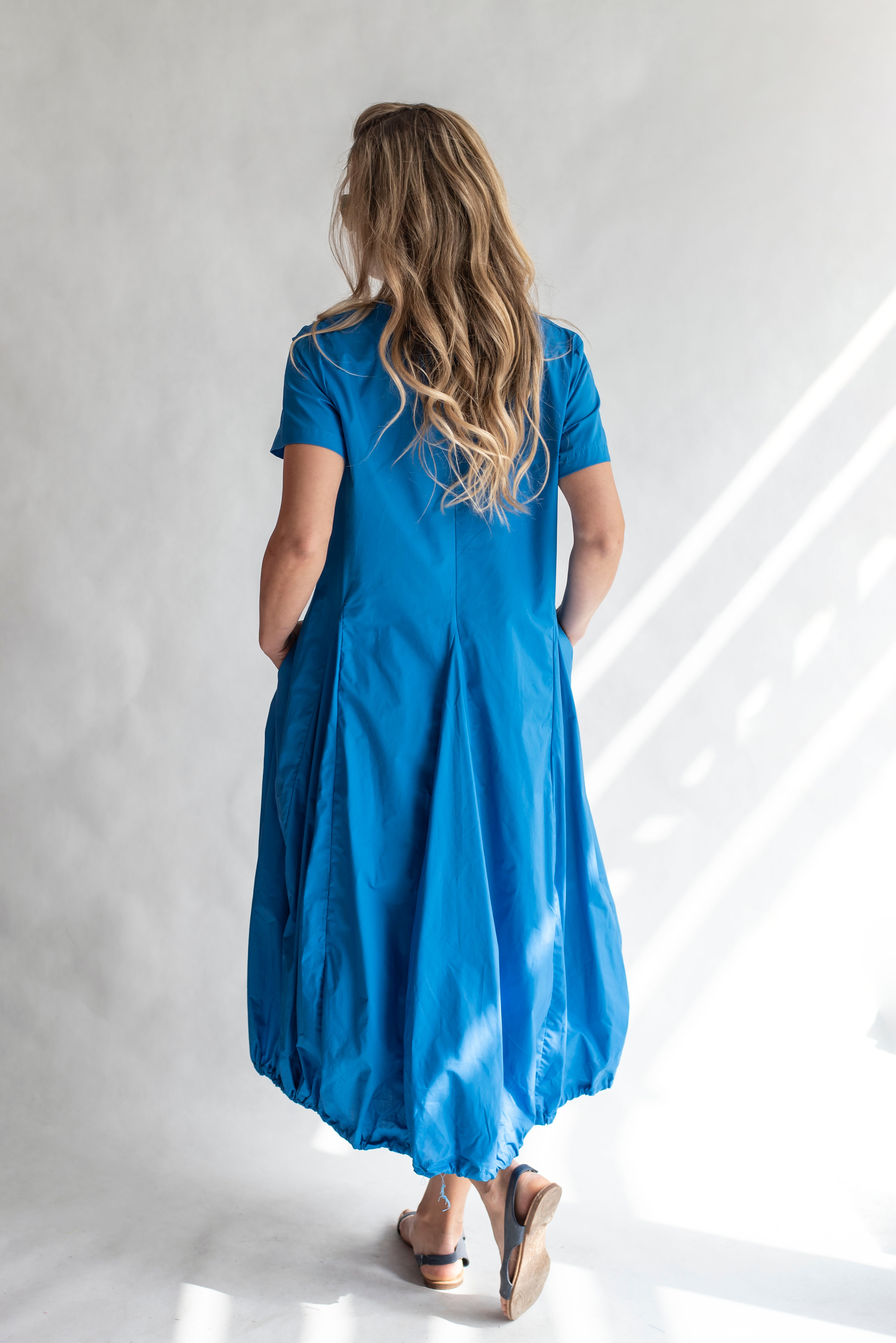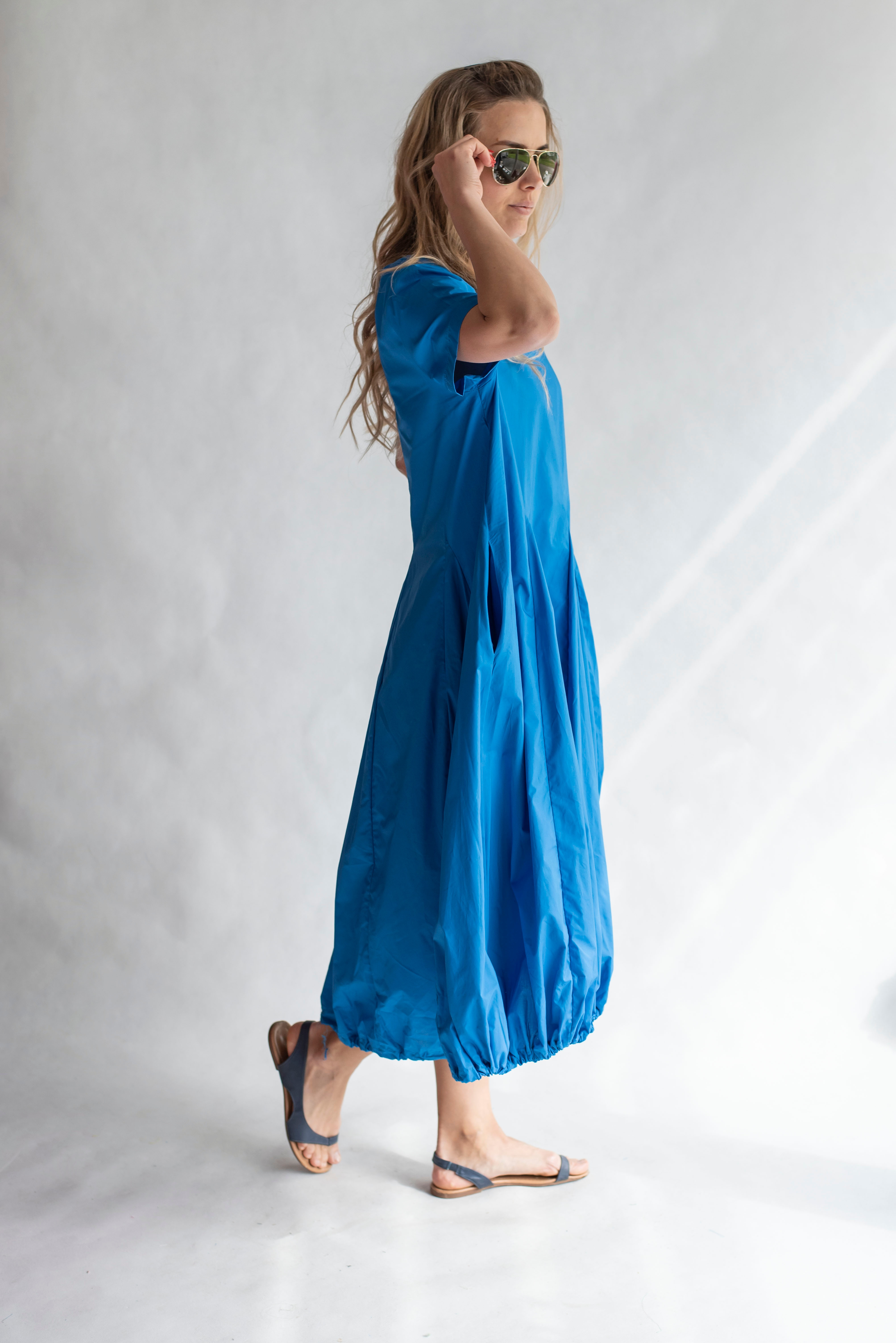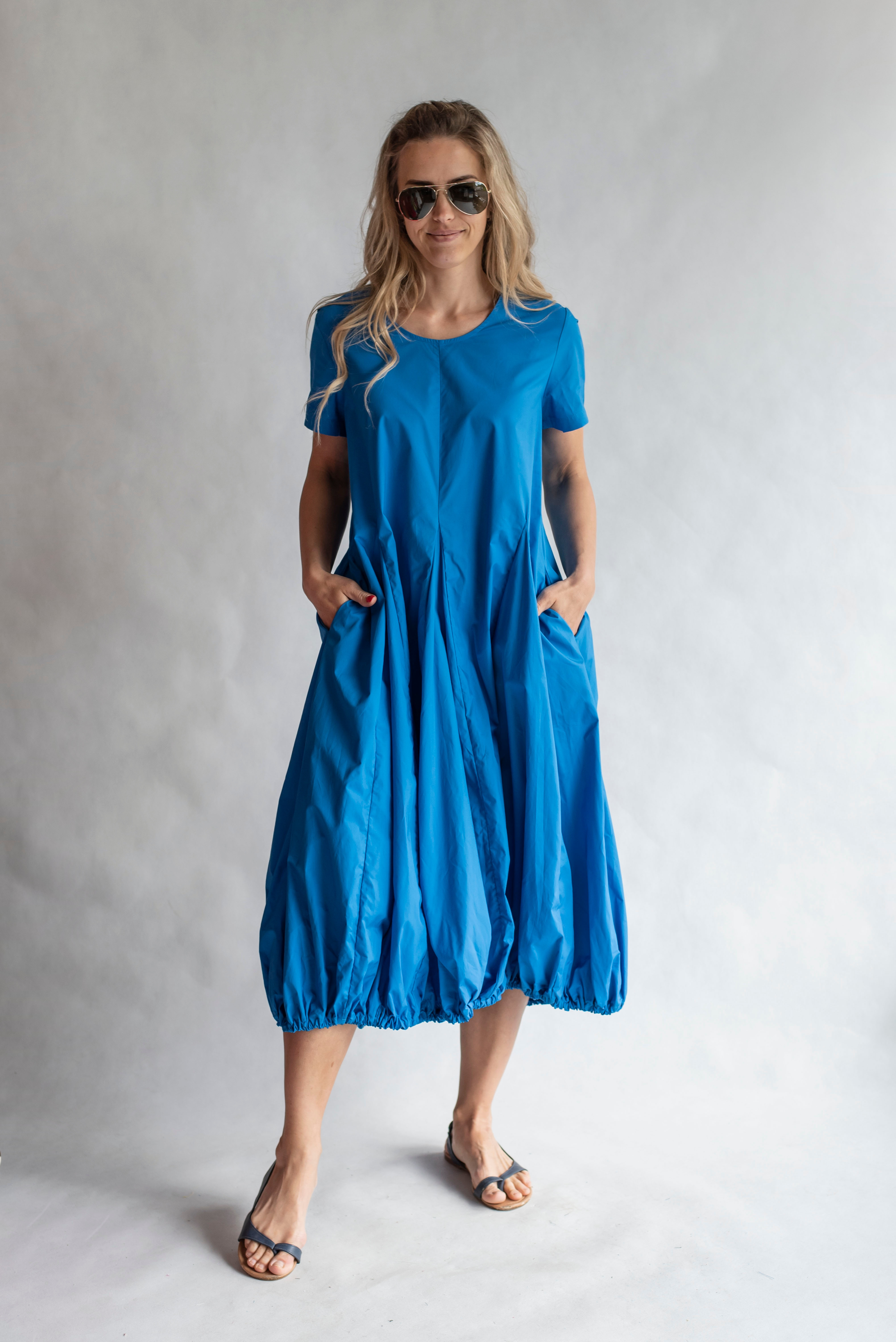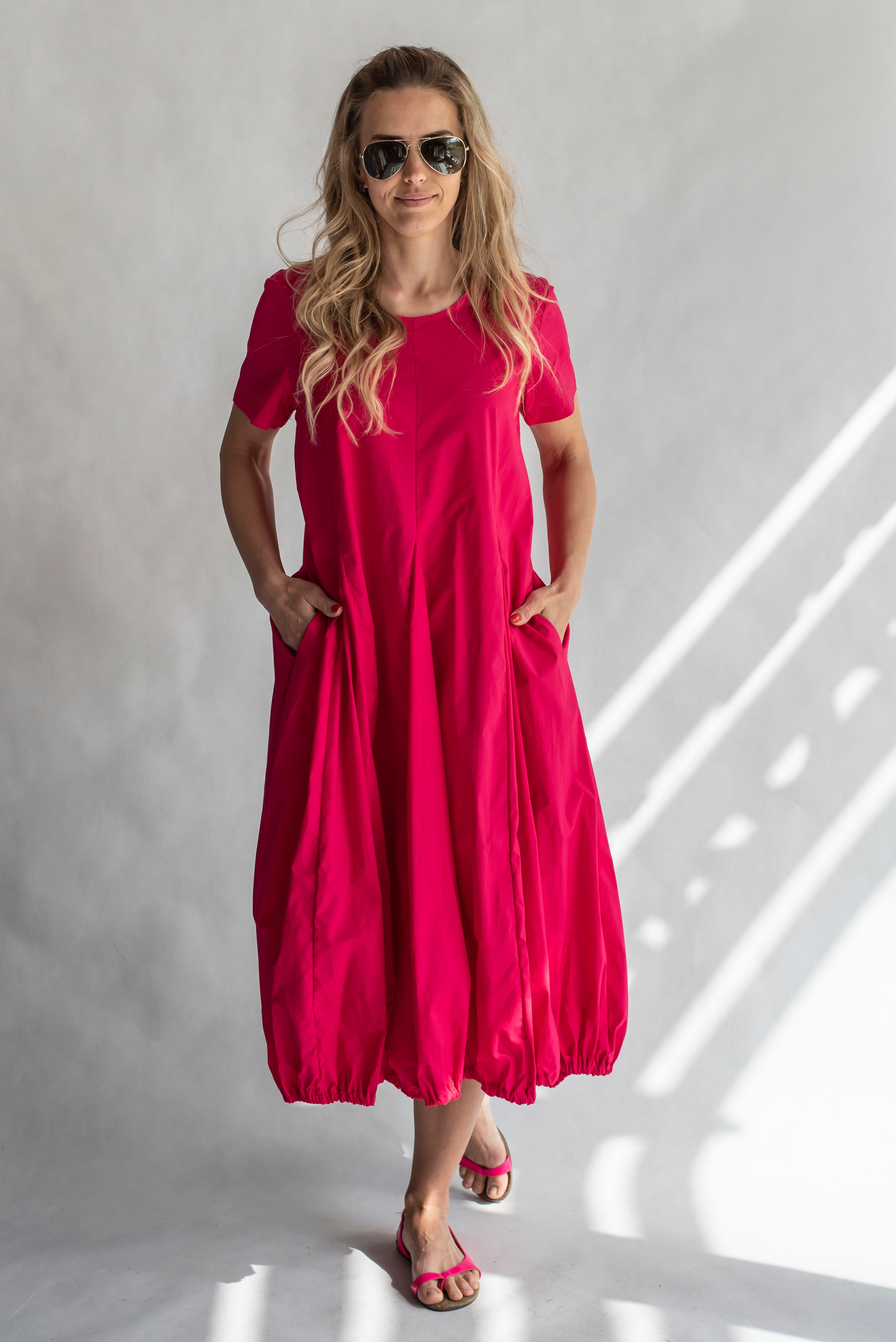 Letní dlouhé bavlněné šaty s krátkým rukávem, všitými kapsami ve spodní části do gumy .