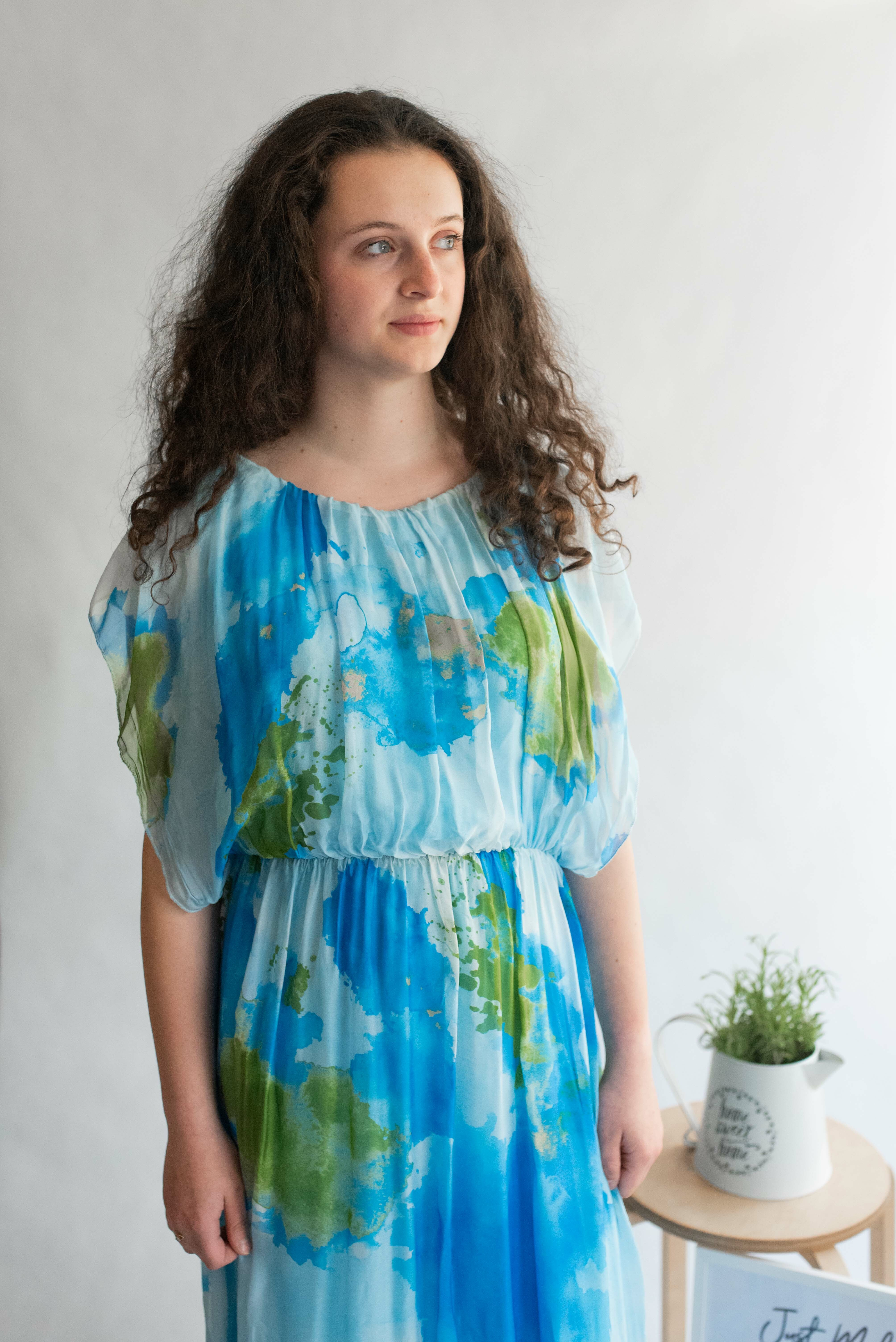 Letní hedvábné šaty s podšívkou, v pase do gumy, kulatý výstřih.