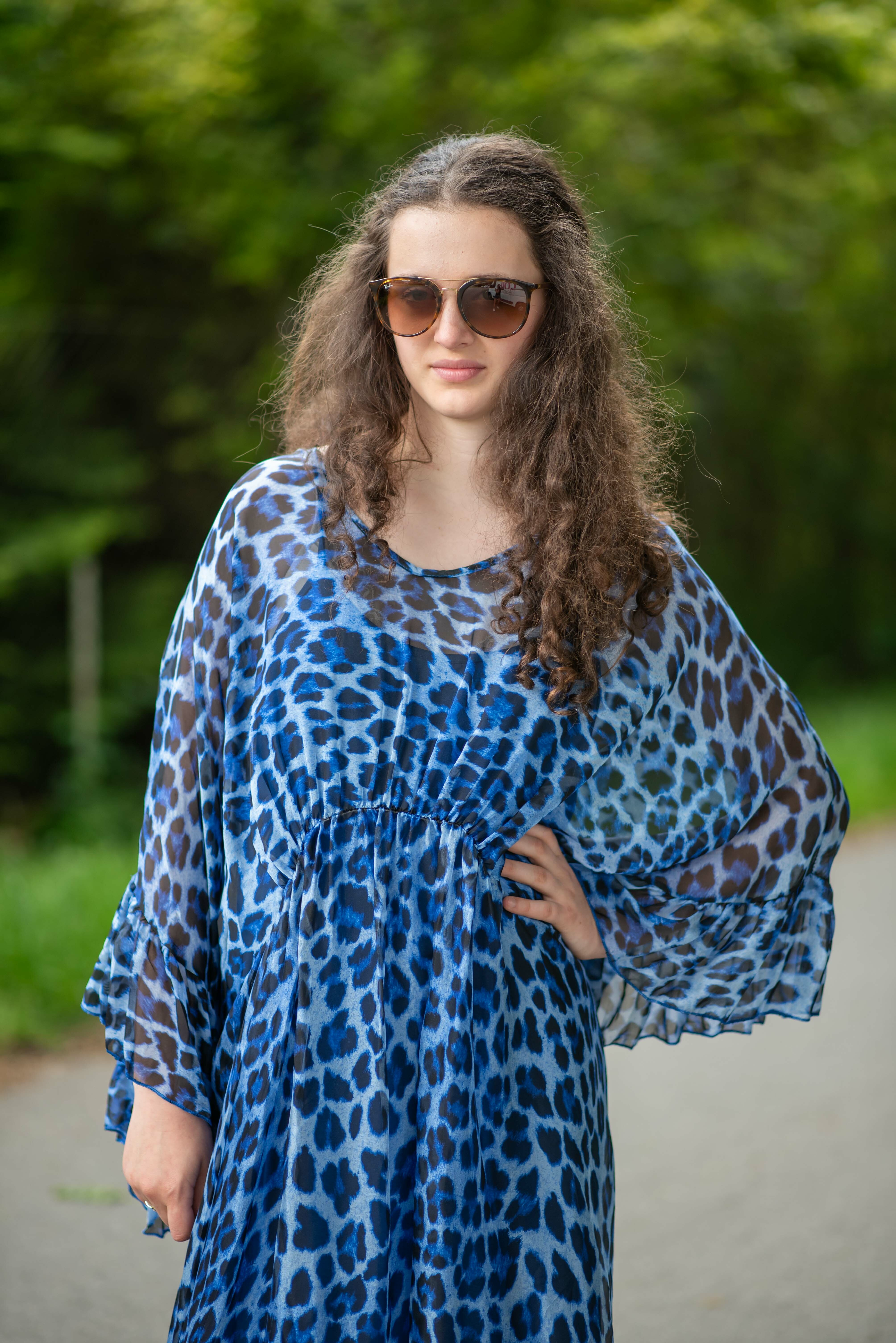 Módní letní hedvábné šaty s podšívkou, spuštěné rukávy do raglánu. Šaty mají pod prsy gumičkové řasení.