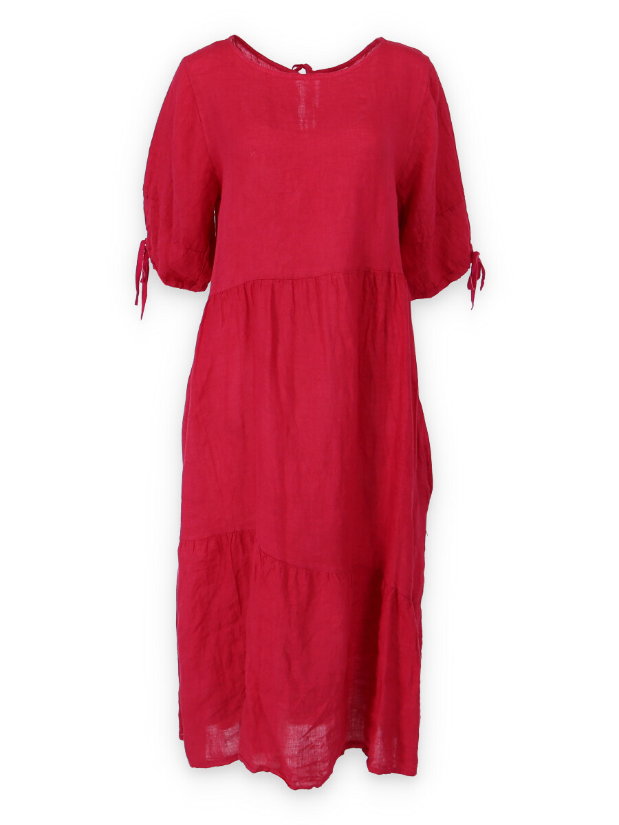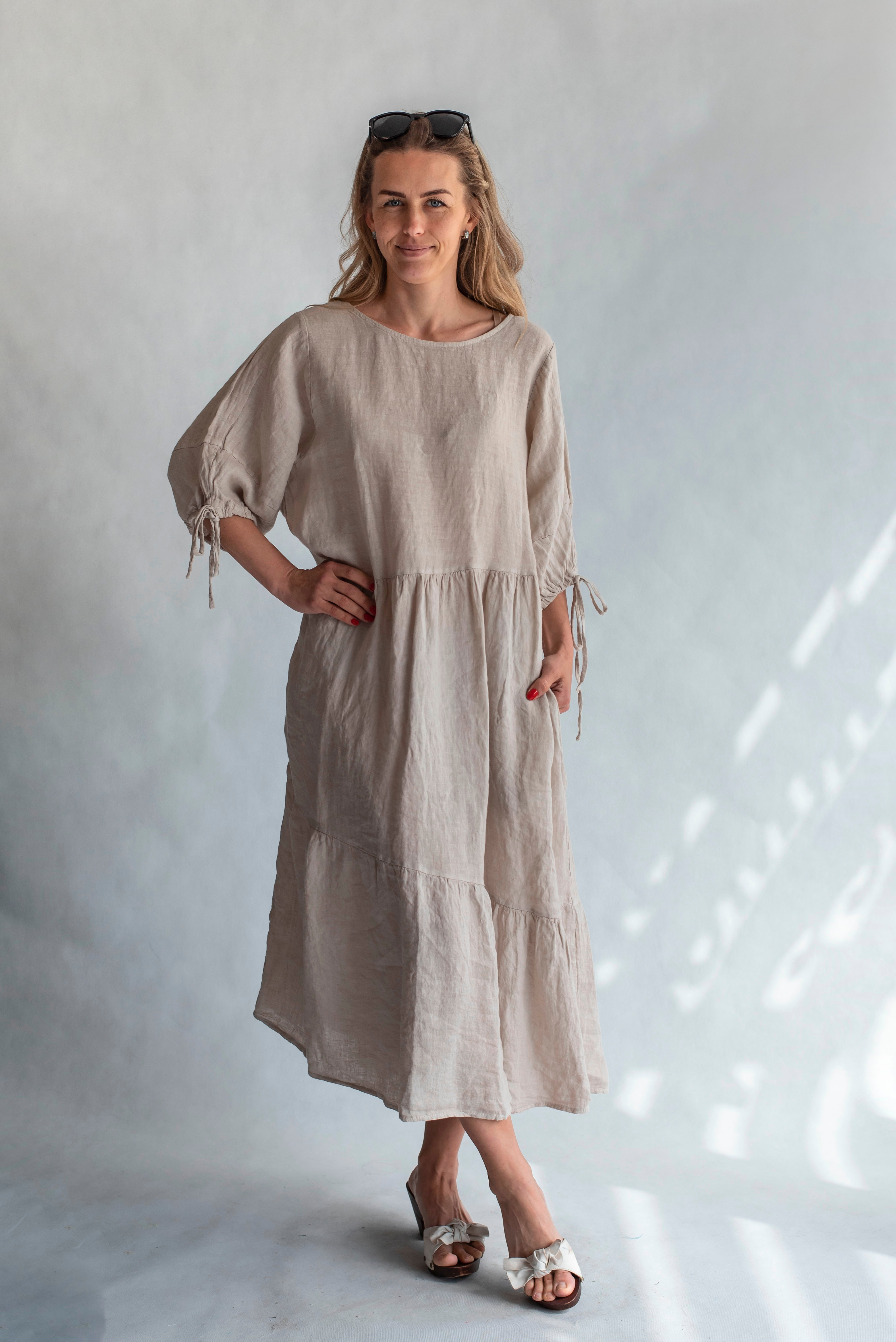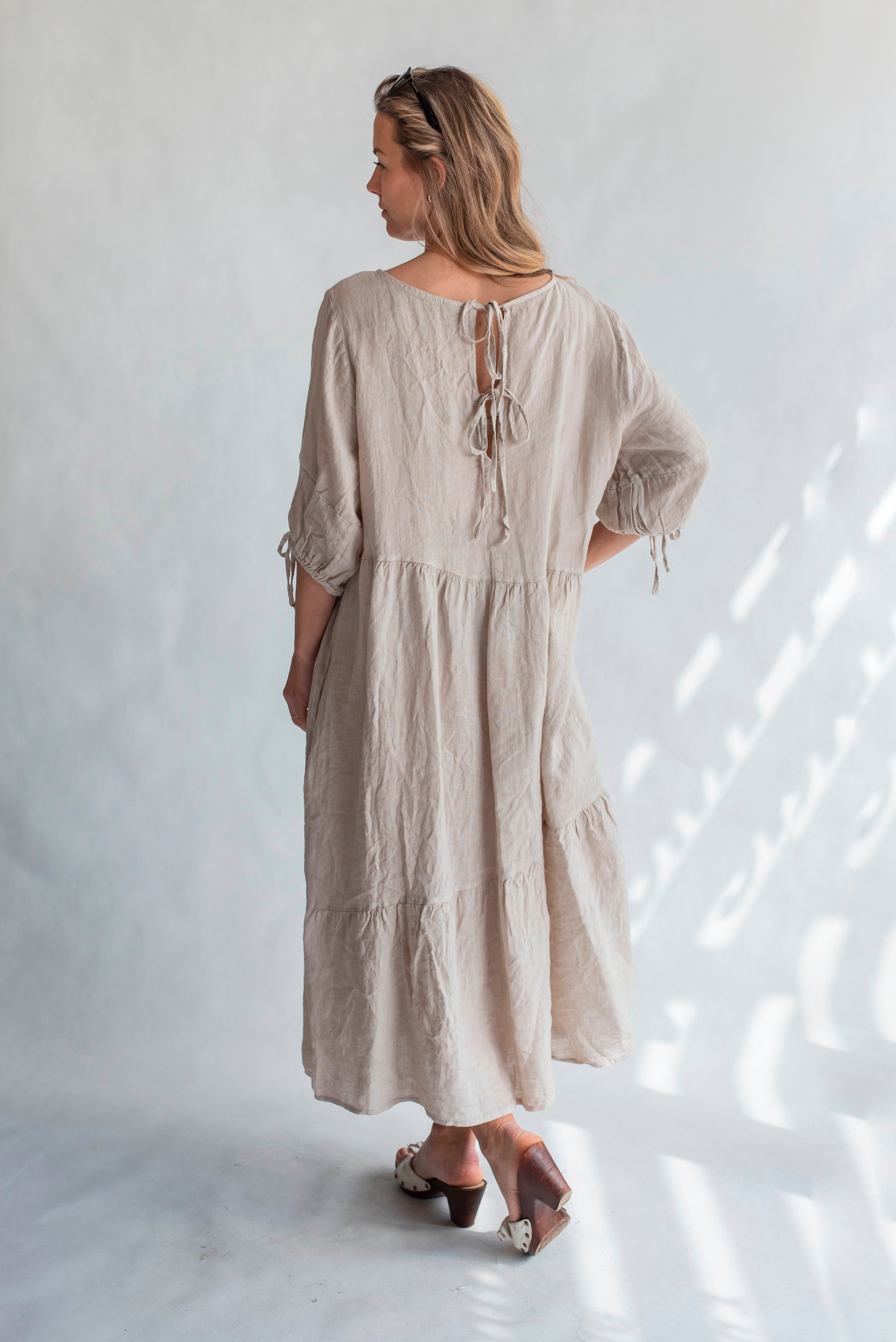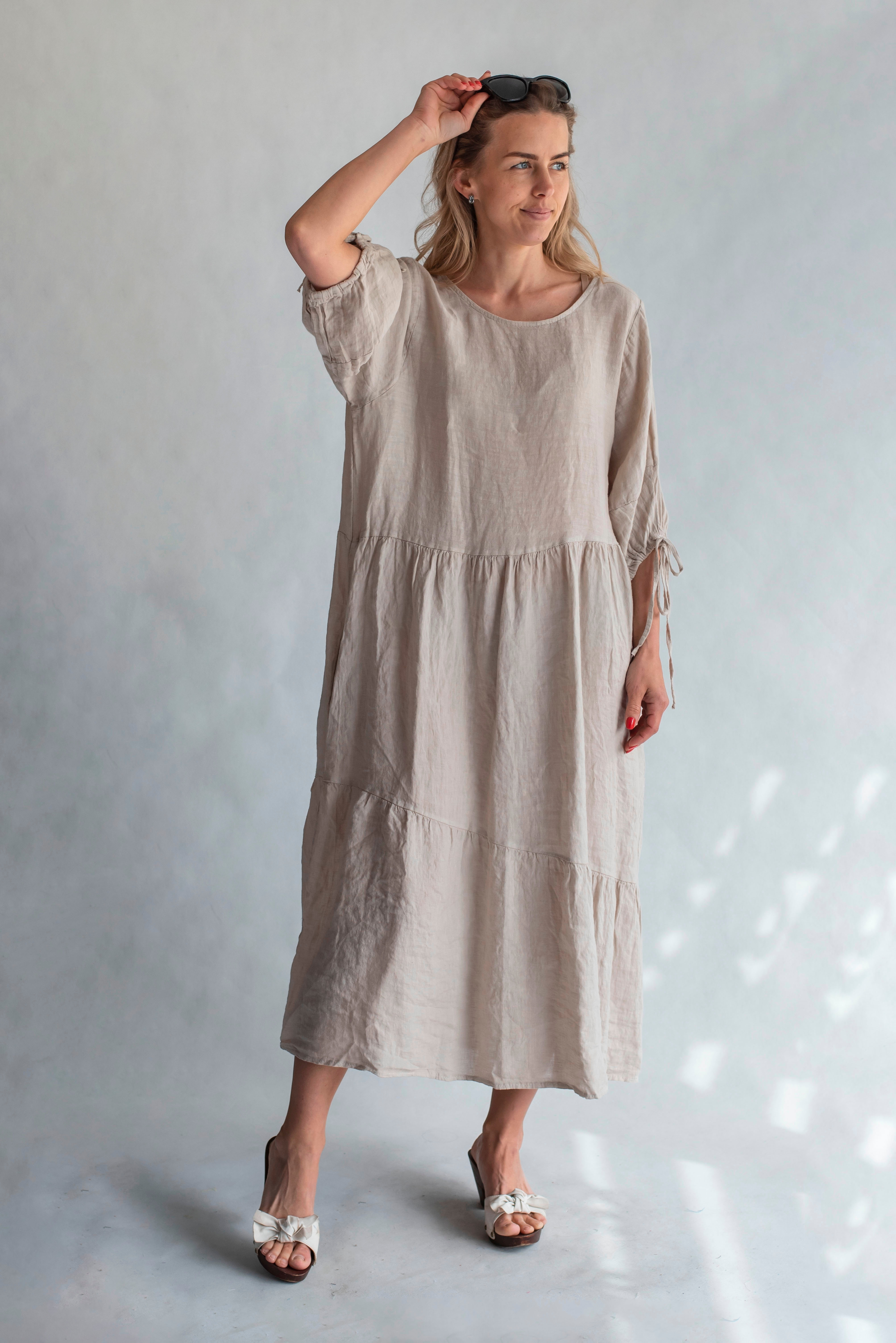 Lněné letní šaty s vázáním u krku-dlouhé a všívané kapsy