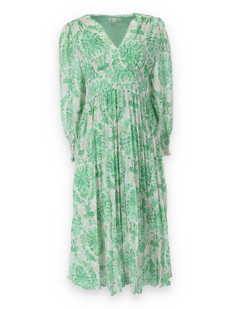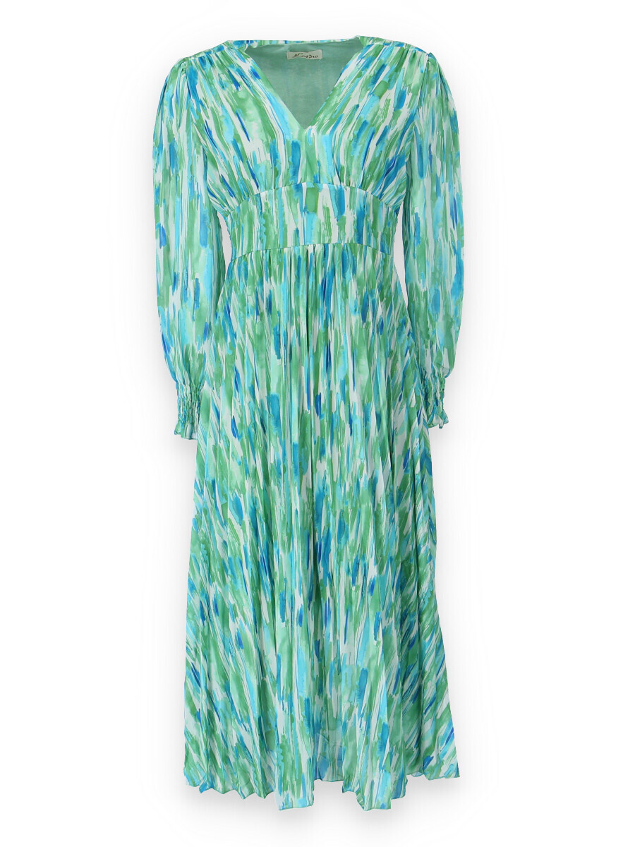 Dámské dlouhé šaty s dlouhým rukávem, spodní část plisé, výstřih do V , zadní část do gumy, podšívka