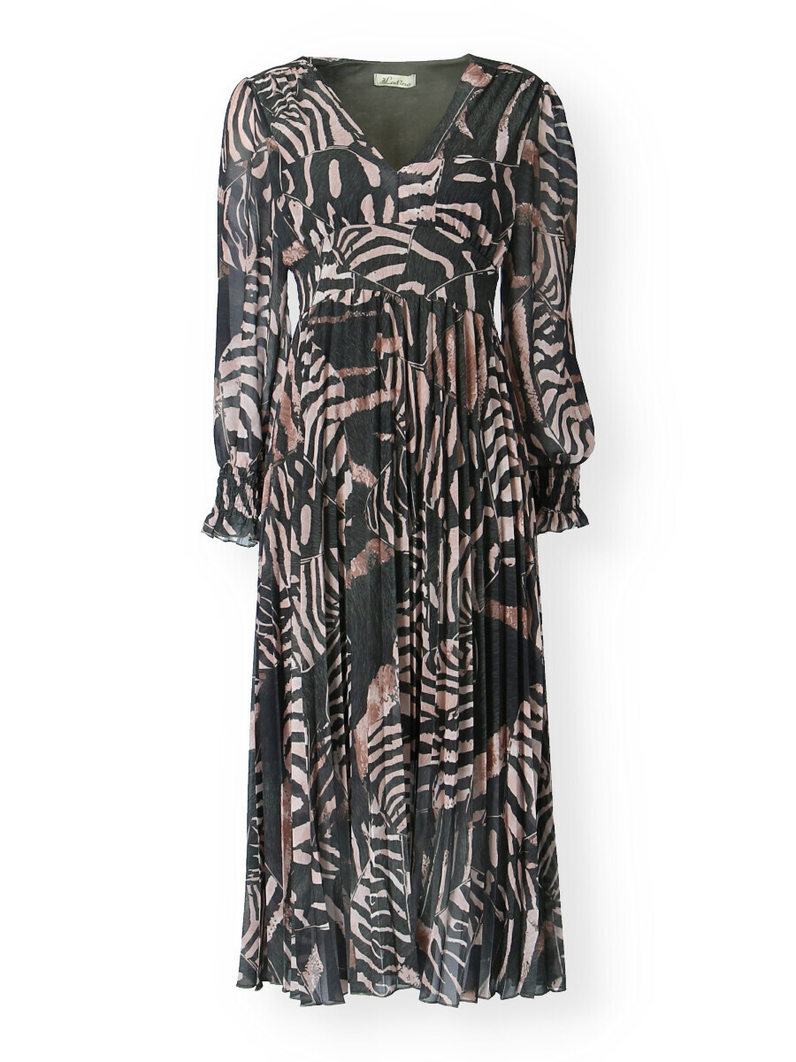 Spodní část šatů plisé, výstřih do V, zadní část do gumy, podšívka.
