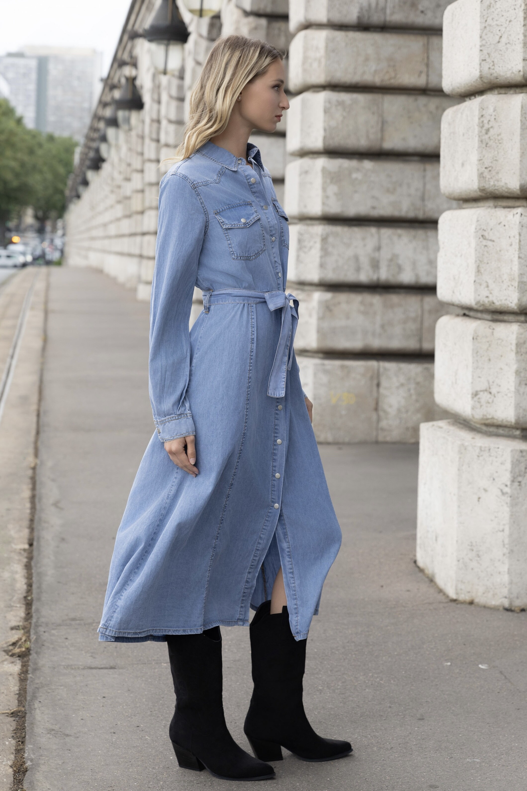 Dámské propínací džínové šaty s dlouhým rukávem, pohodlné pro denní nošení od francouzské značky Cimini Paris