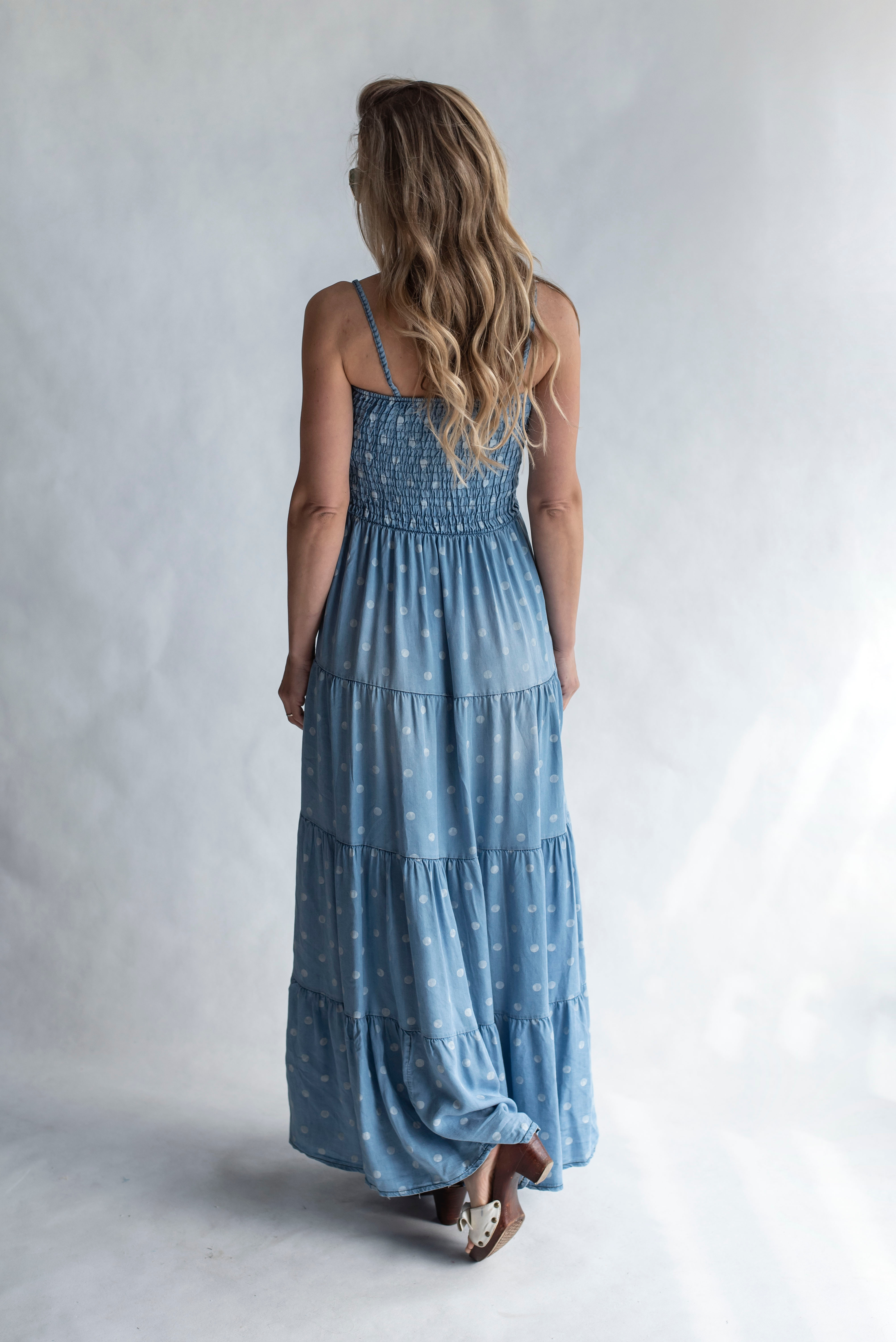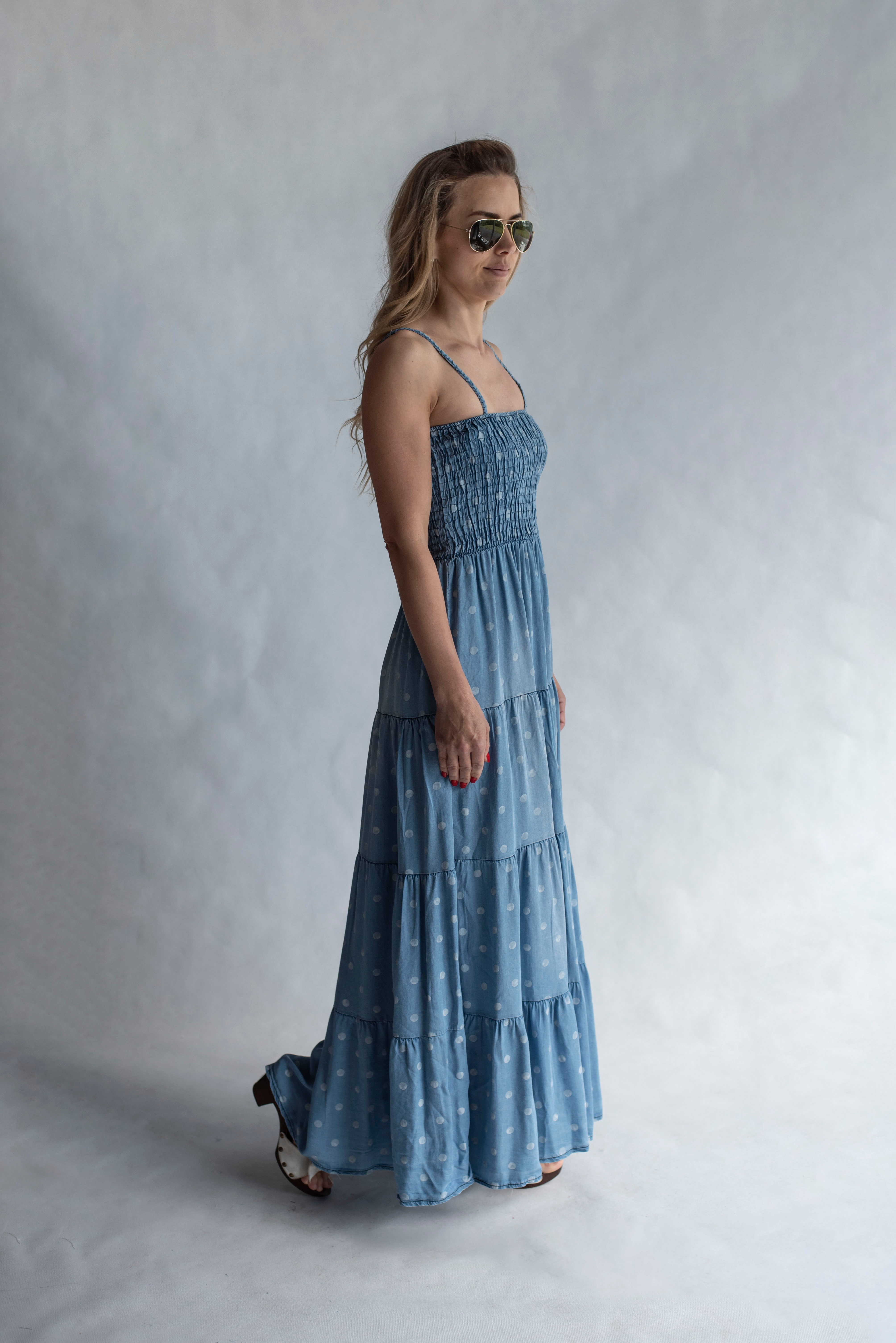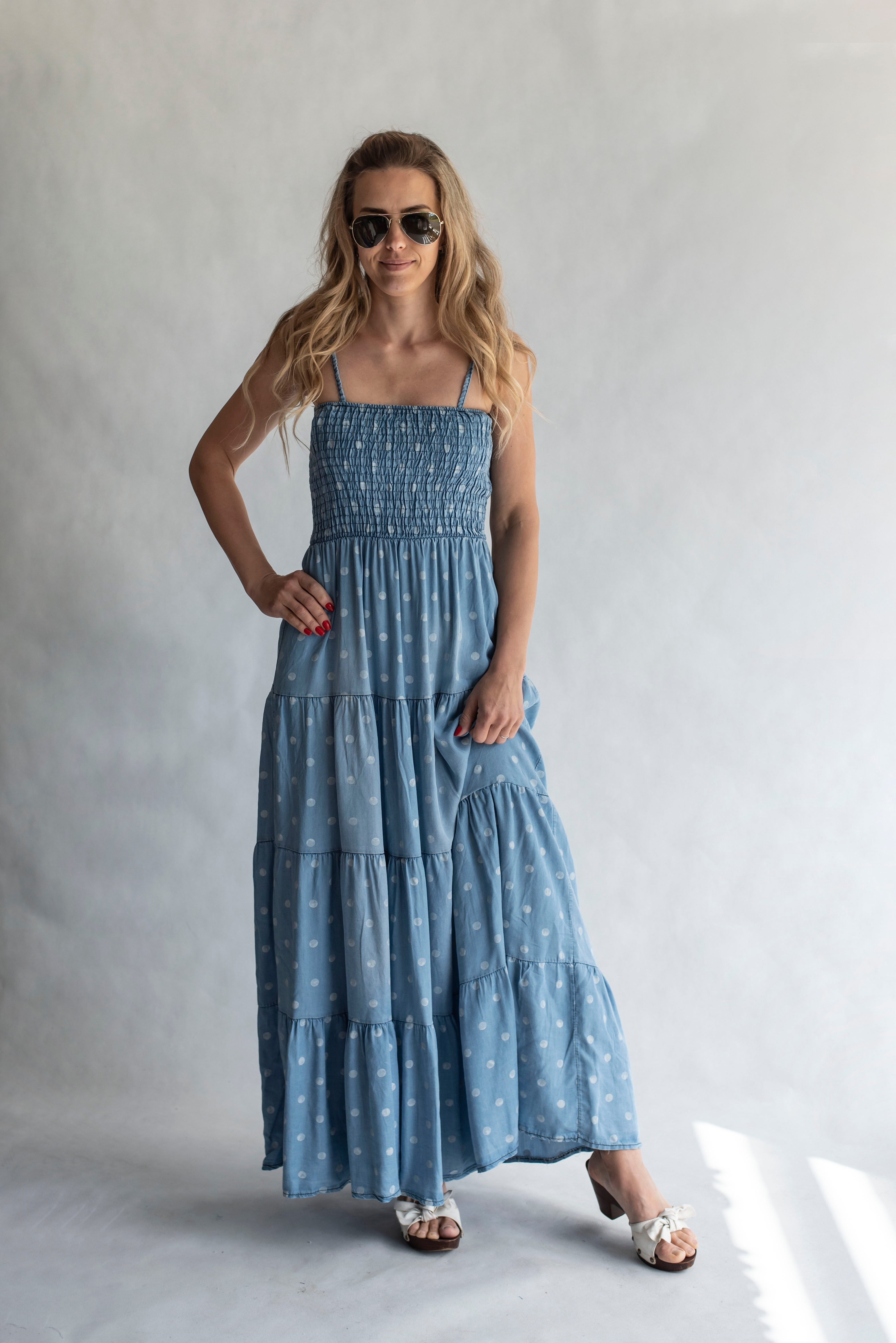 Elegantní letní džínové šaty na tenké nastavitelné ramínka, pohodlné pro každodenní použití.