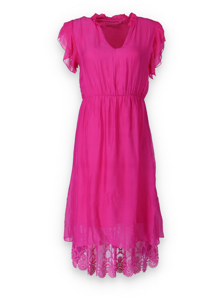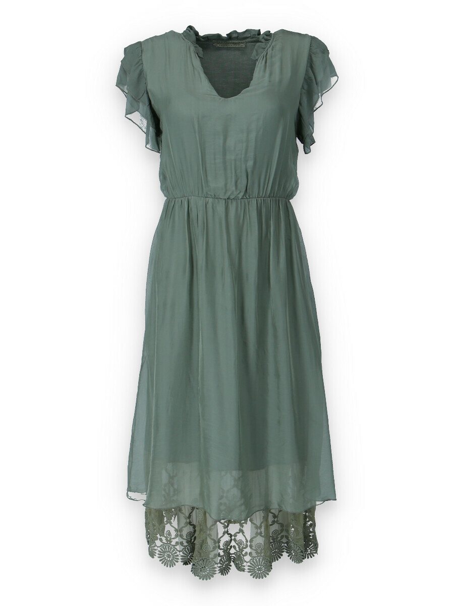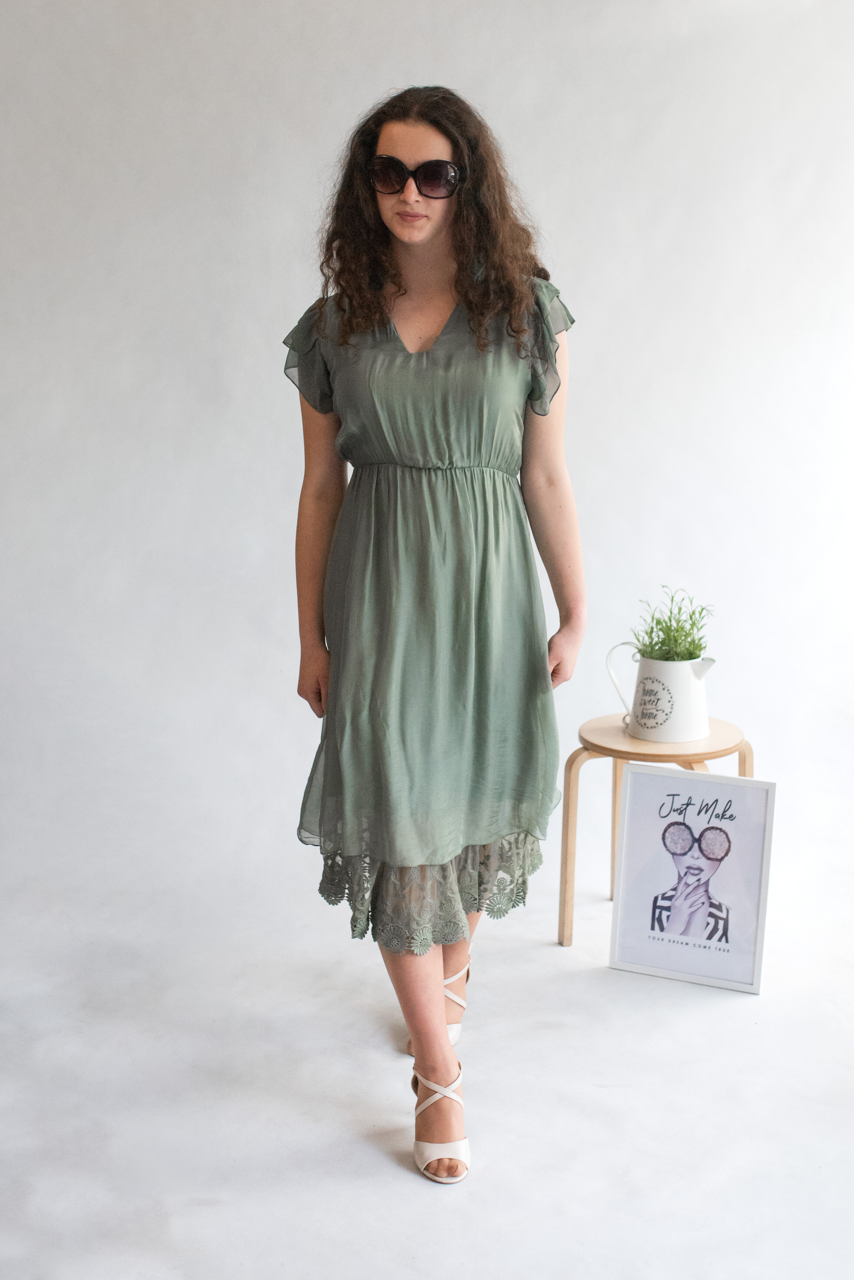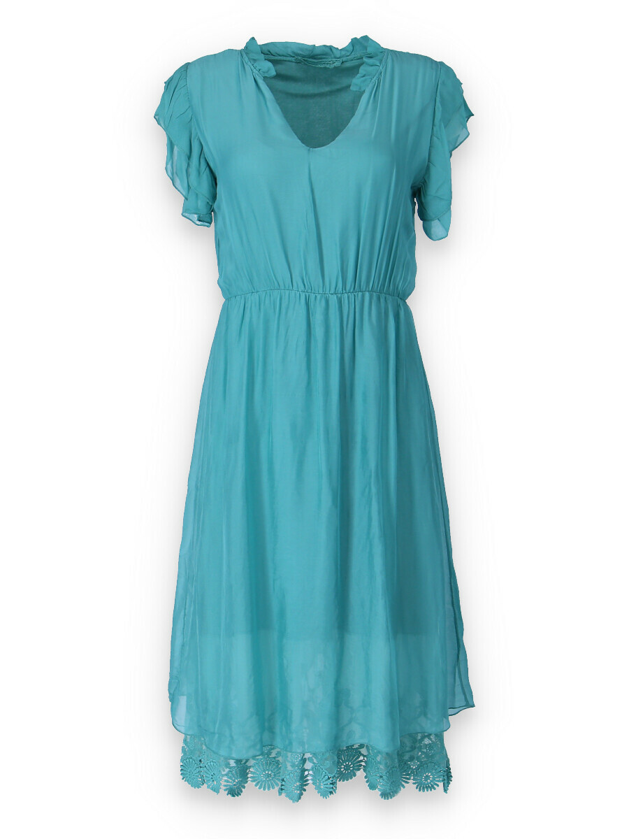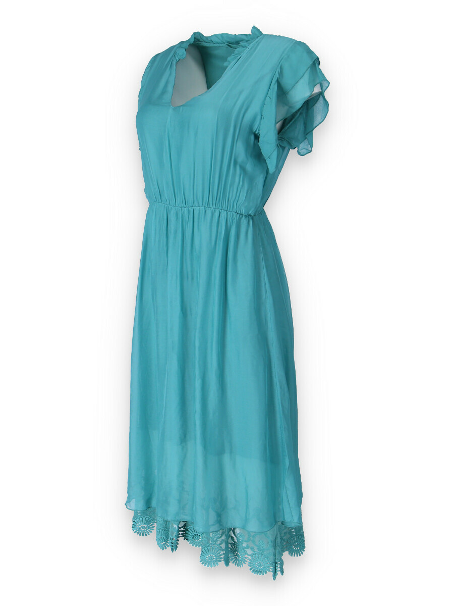 Letní hedvábné šaty s krátkým rukávem a podšívkou, v pase do gumy, výstřih do V. Spodní lem doplněno krajkou.