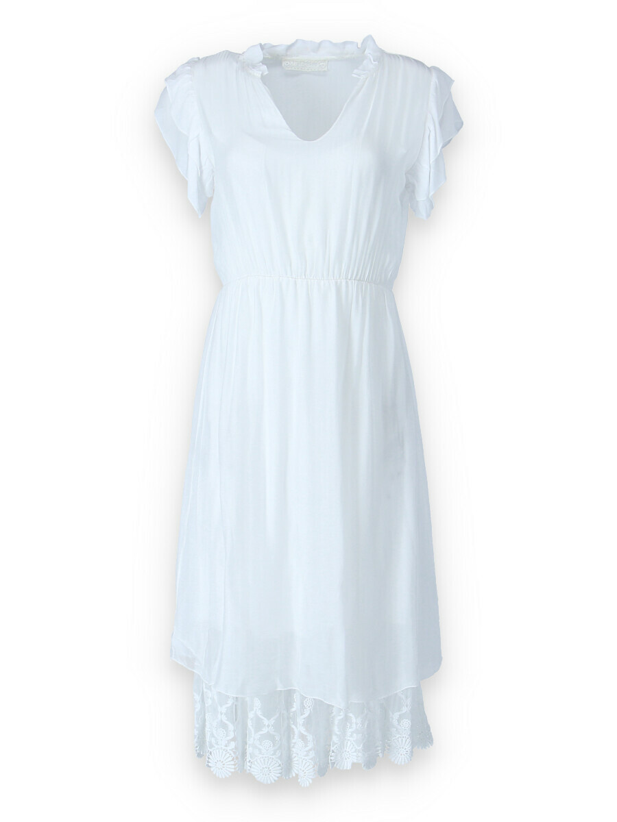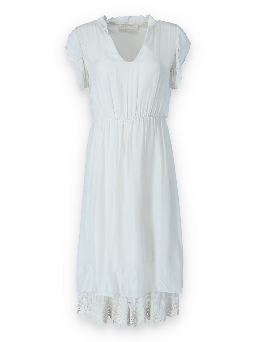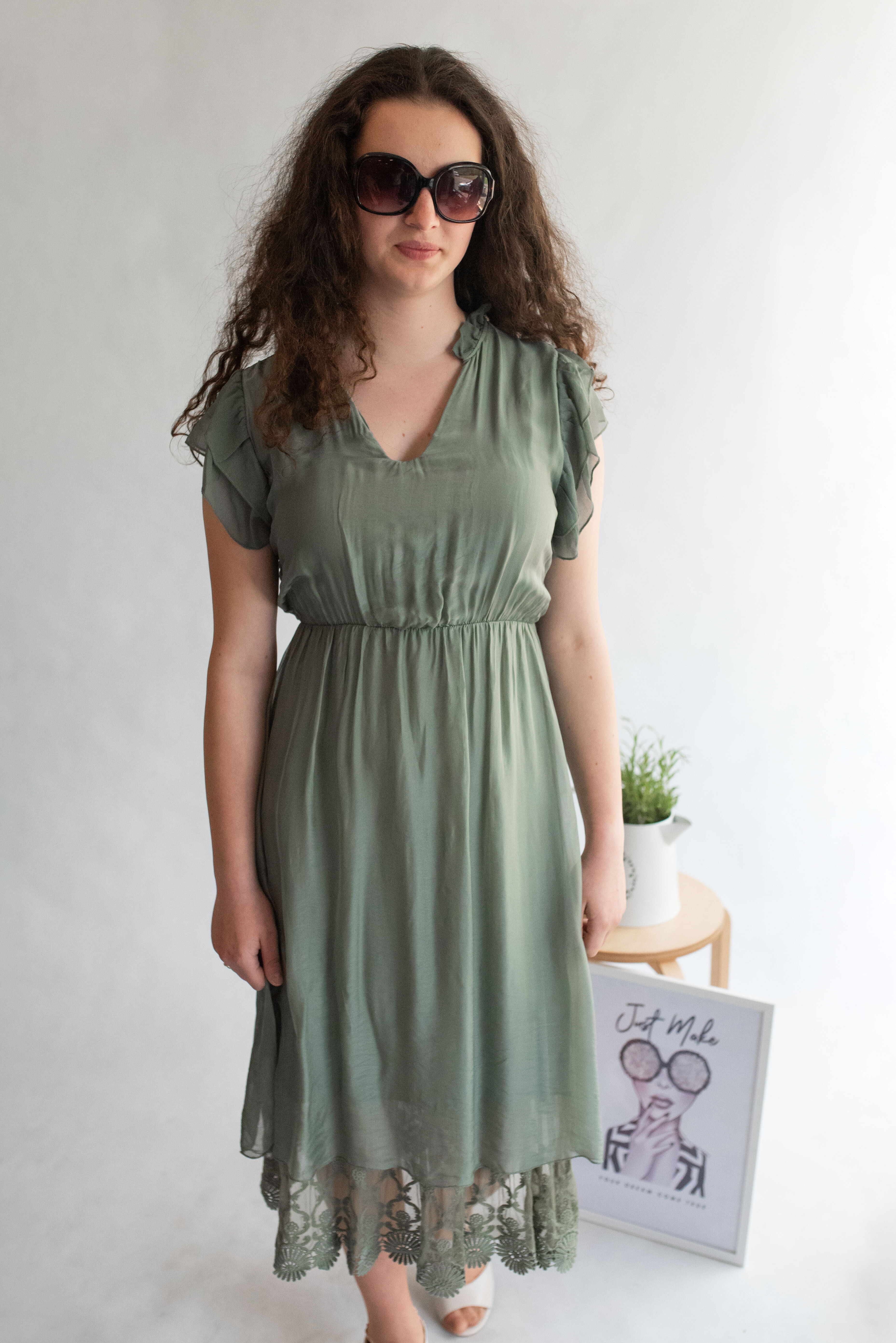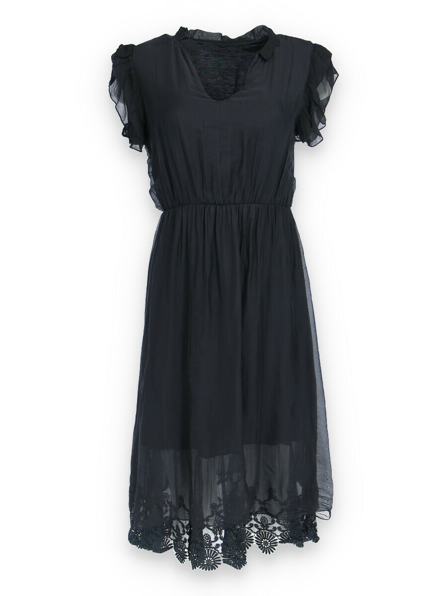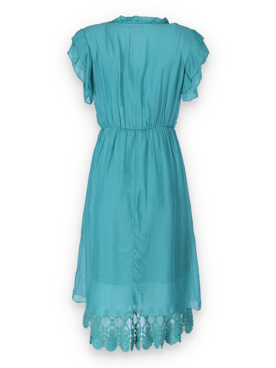 Letní hedvábné šaty s krátkým rukávem a podšívkou, v pase do gumy, výstřih do V. Spodní lem doplněno krajkou.