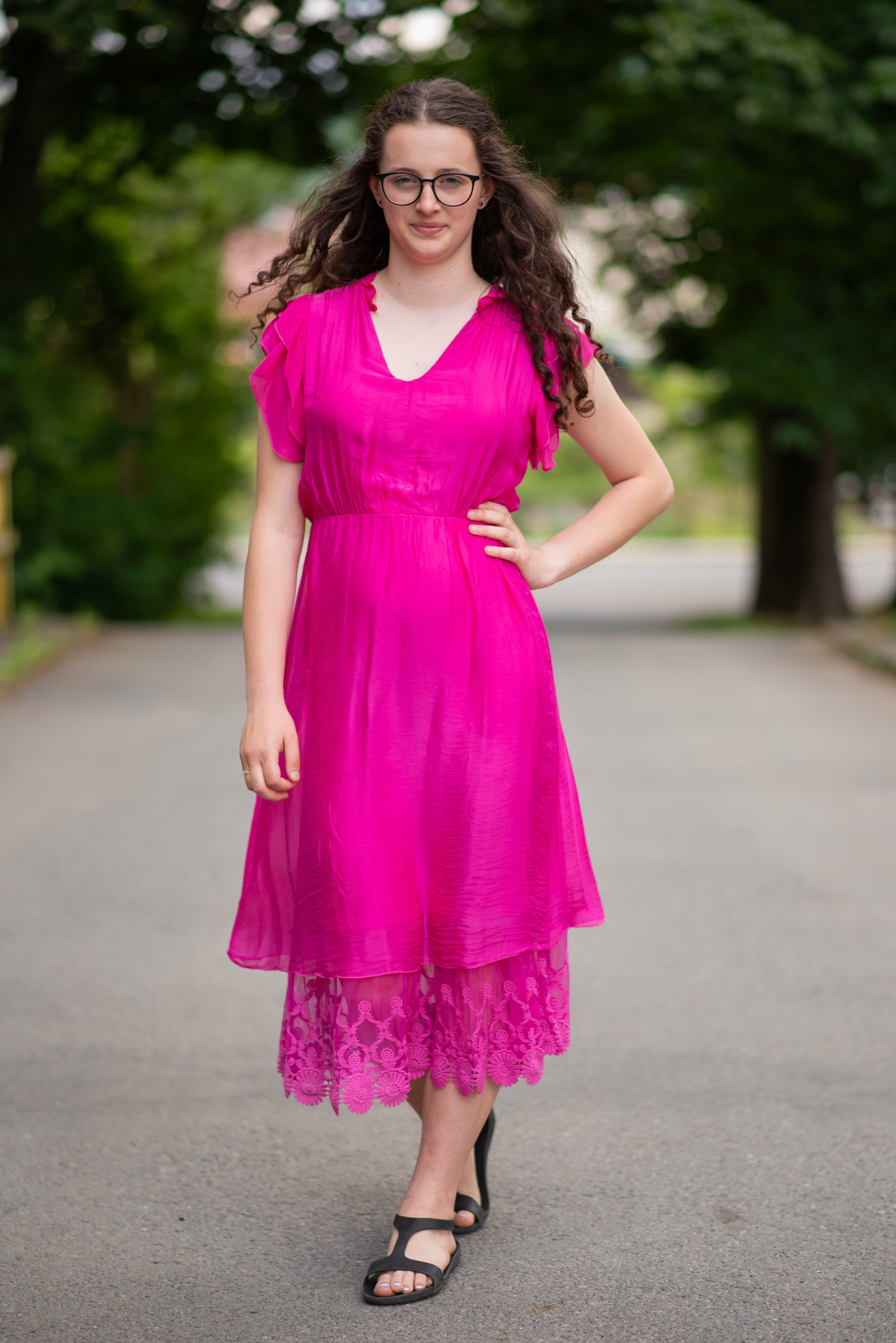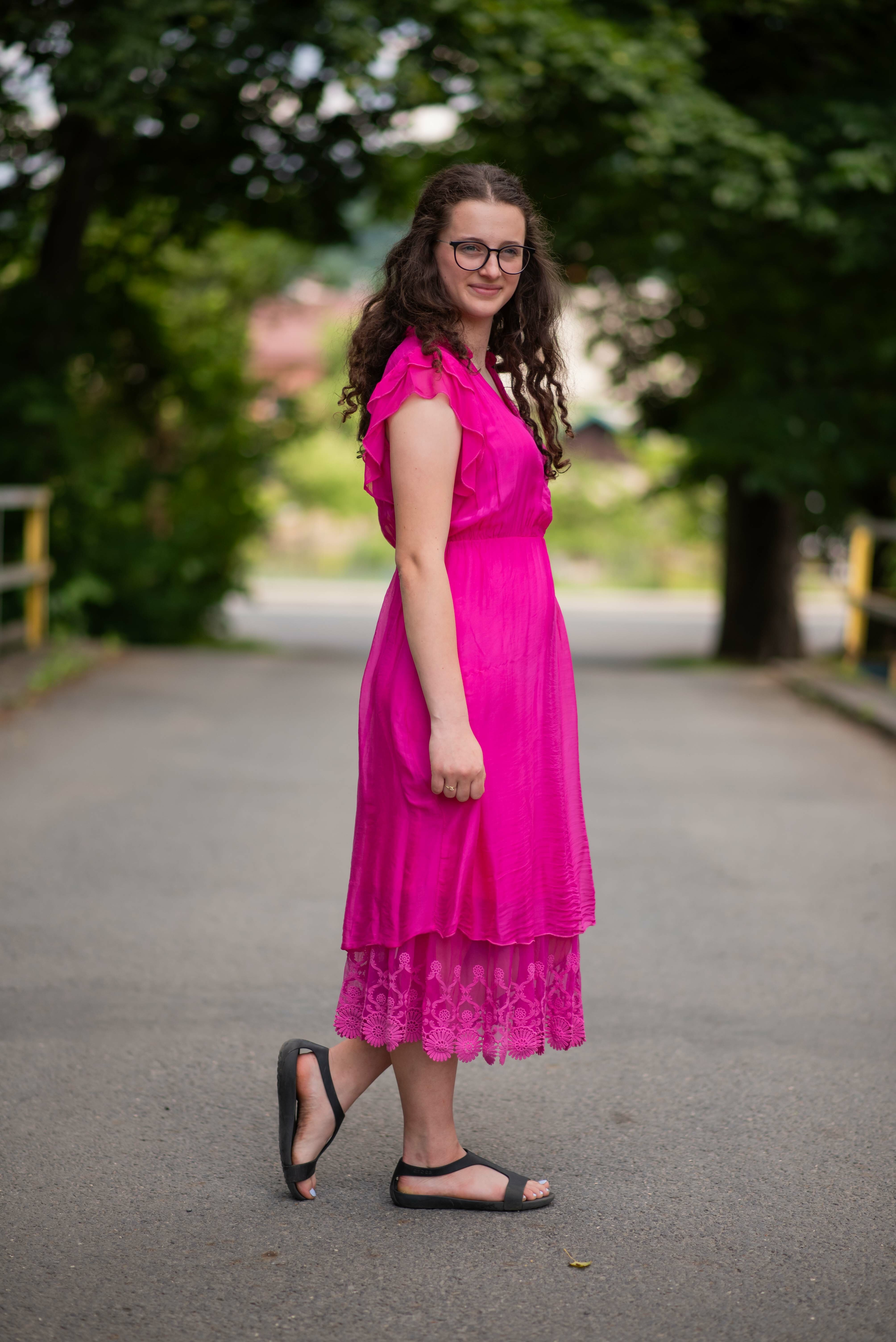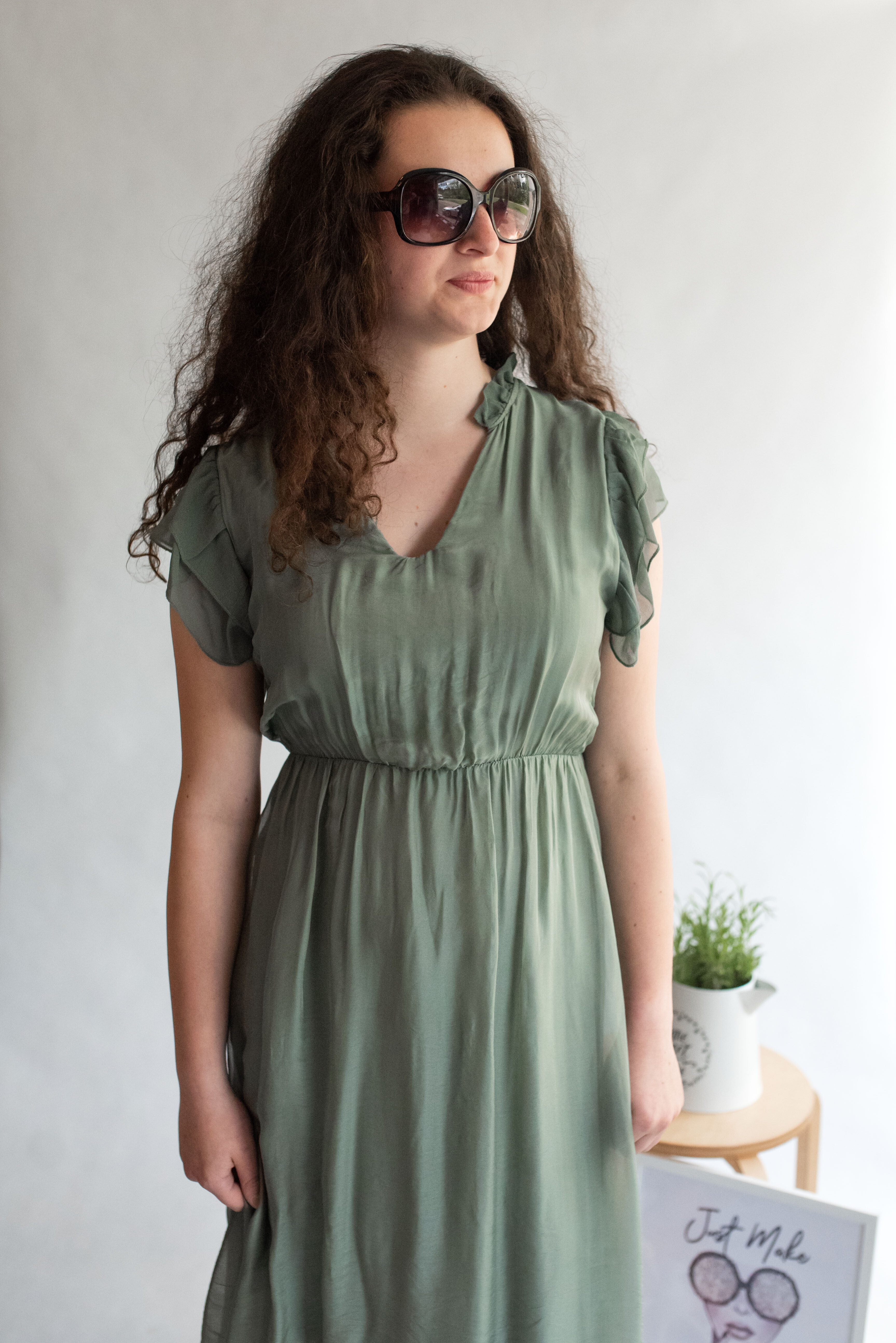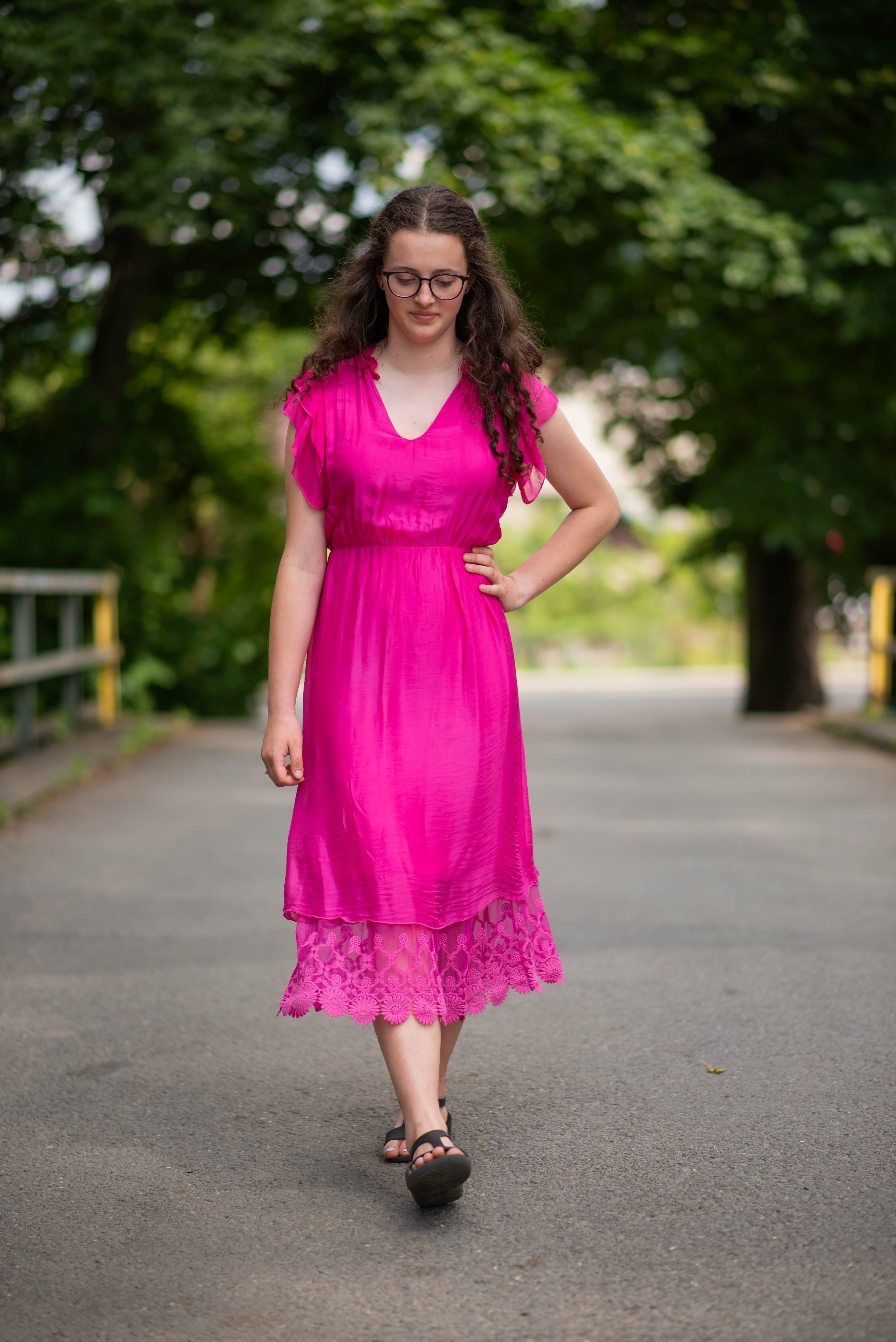 Letní hedvábné šaty s krátkým rukávem a podšívkou, v pase do gumy, výstřih do V. Spodní lem doplněno krajkou.
