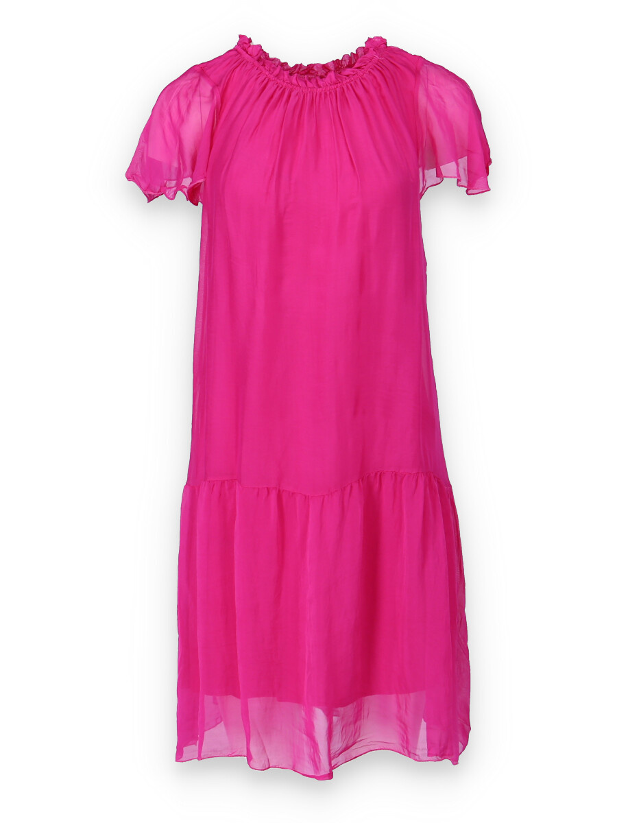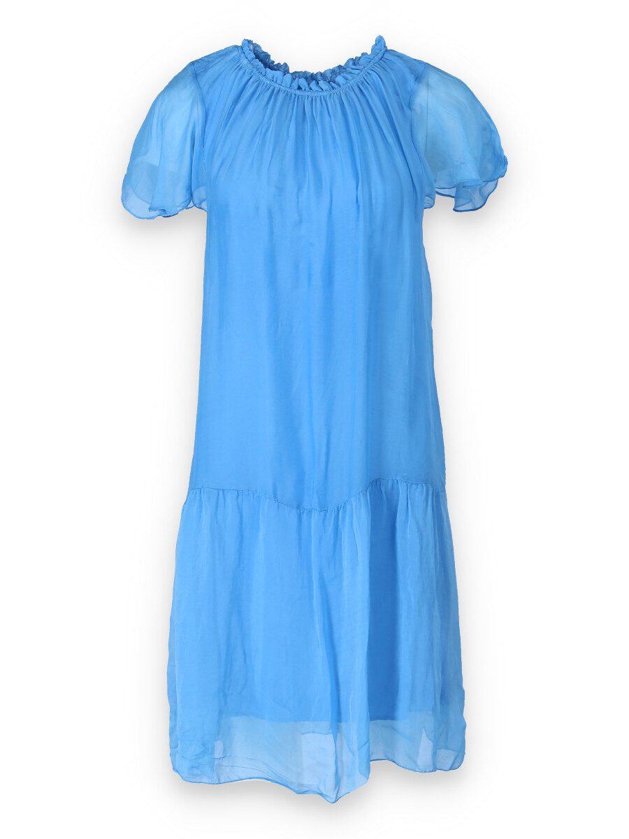 Letní krátké hedvábné šaty s krátkým rukávem, kulatý výstřih do gumičky a příjemnou podšívkou