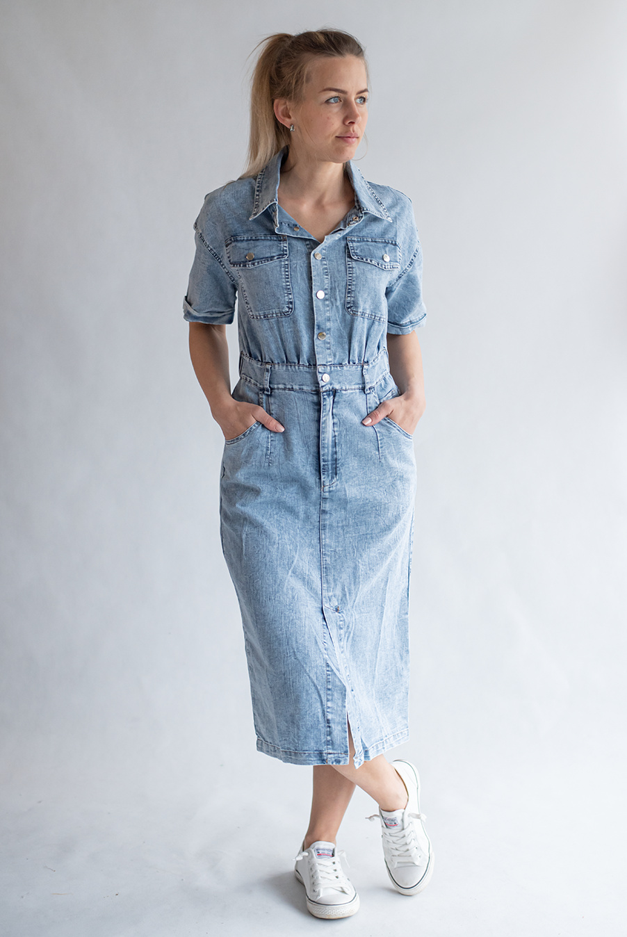 Dámské jeansové šaty s krátkým rukávem, pohodlné pro denní nošení od francouzské značky Cimini Paris Dovezeno z Francie. Velikosti a rozměry: S,M,L,. Složení materiálu: ,bavlna 100% .