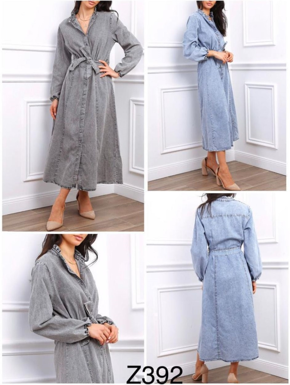 Dámská košilové jeansové šaty s s dlouhým rukávem, volánkový stojáček. Ciminy Paris .