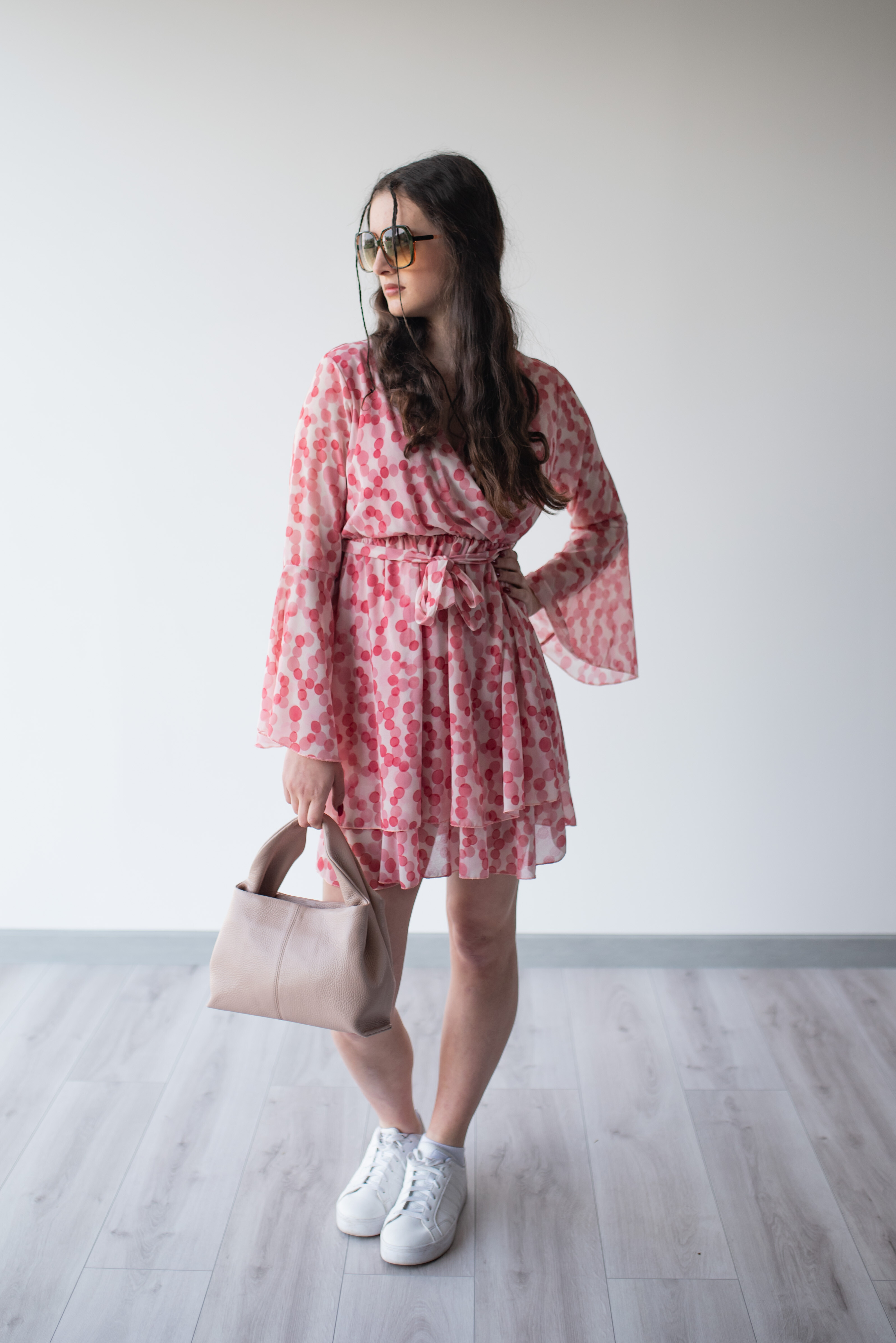 Krátké volánové šaty s dlouhým šifónovým rukávem, překládané přes prsa, v pase do gumy a s vázáním. Šaty mají podšívku.