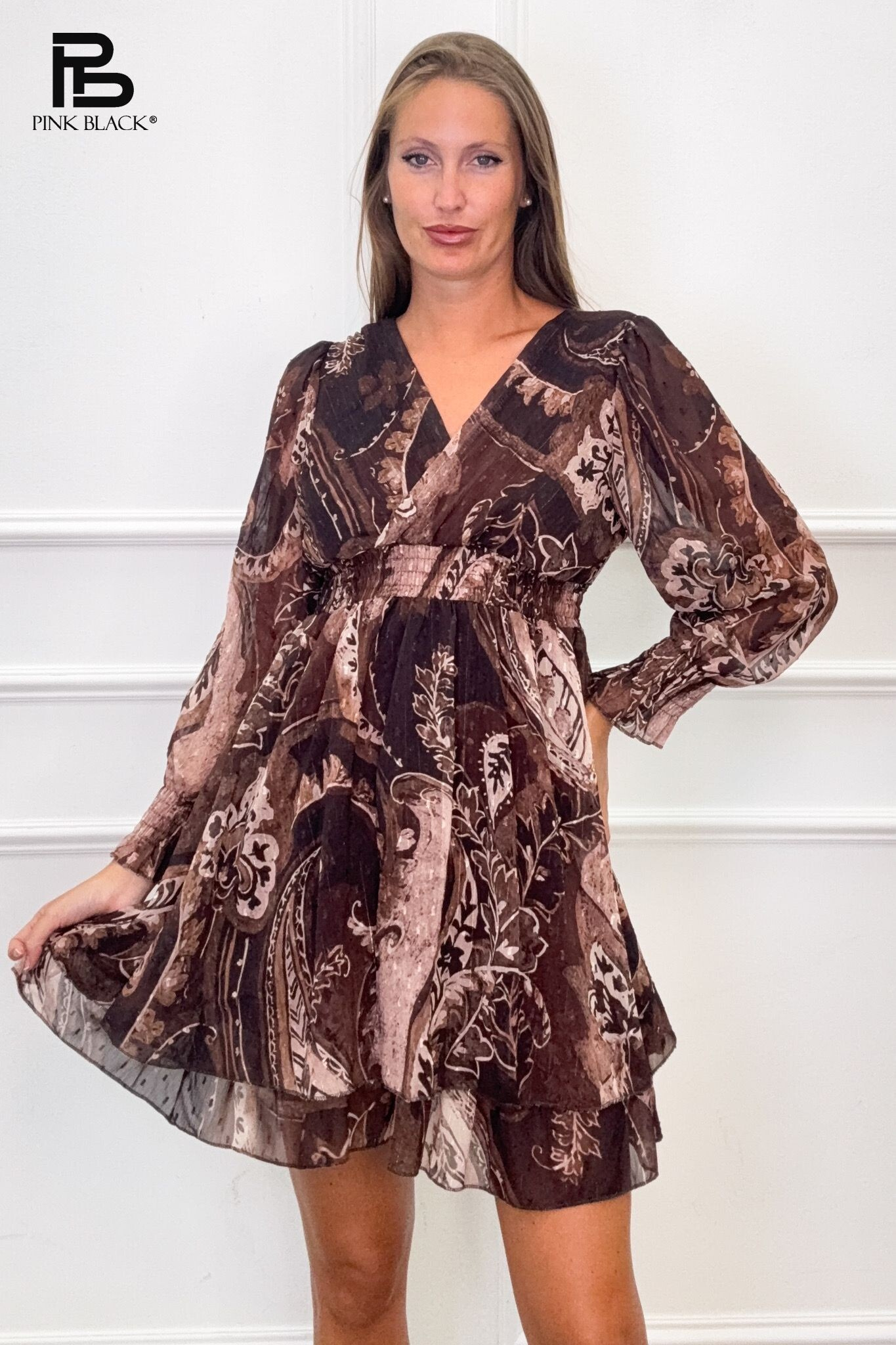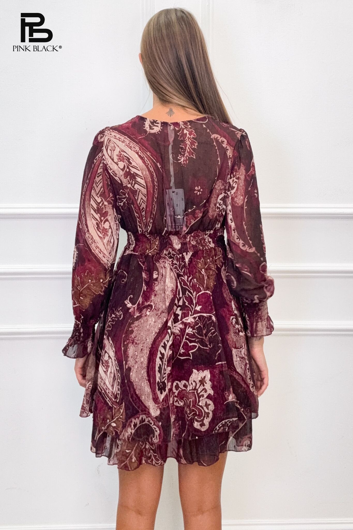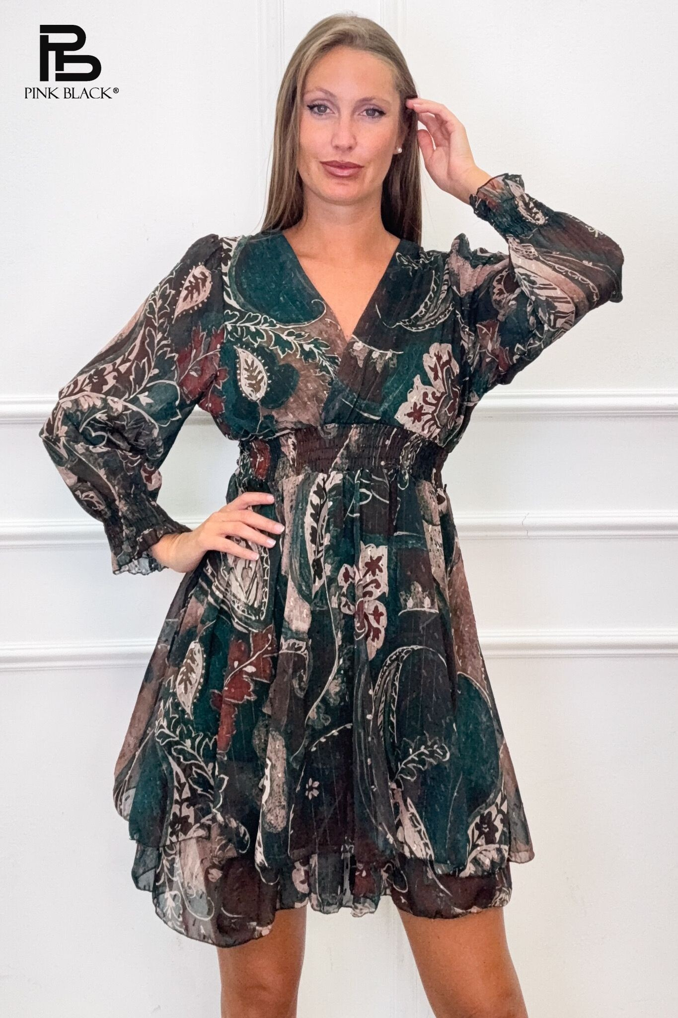 Krátké šaty s potiskem. Šaty jsou v pase do gumy a mají výstřih do V.