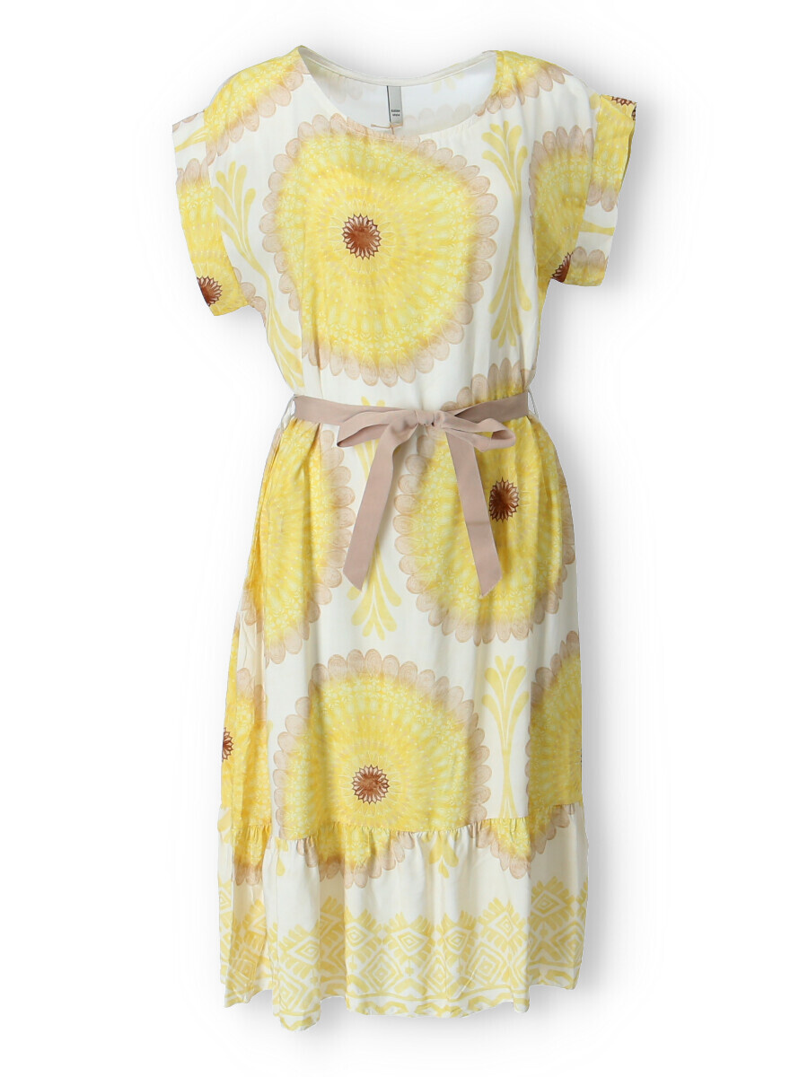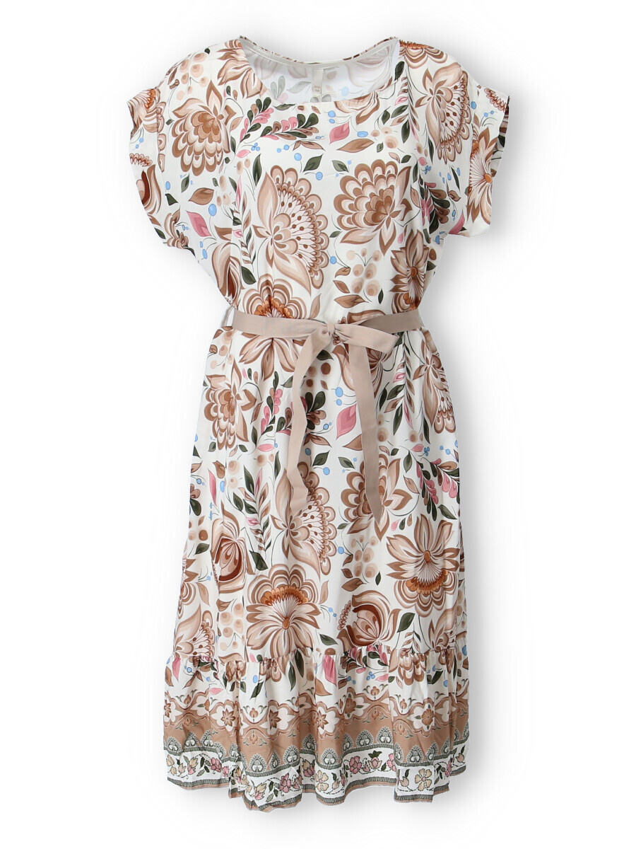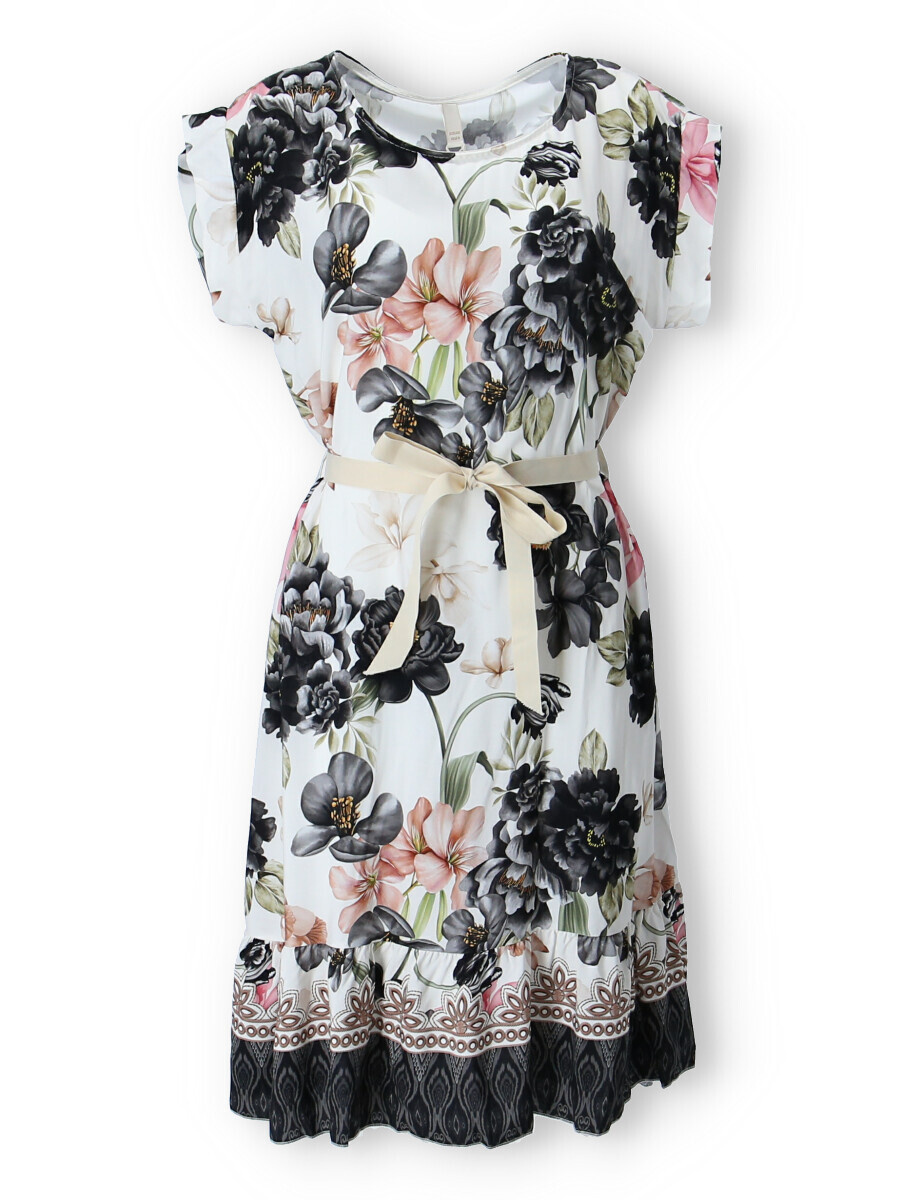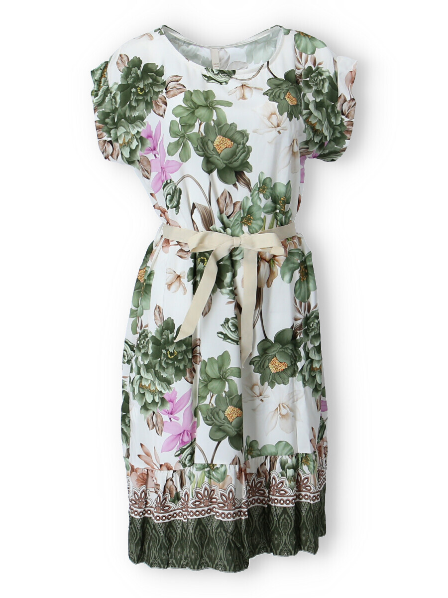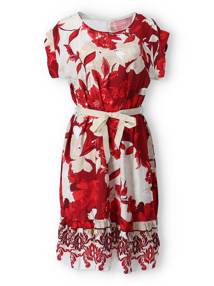 Dámské šaty se vzorem. Šaty mají kulatý výstřih, ve spodní části volán a v pase doplněny stuhou. Vyrobeno v Itálii.