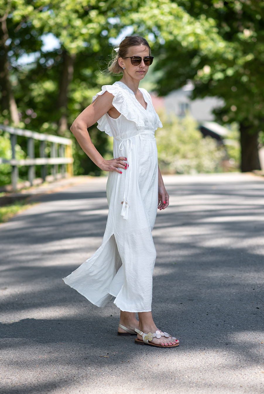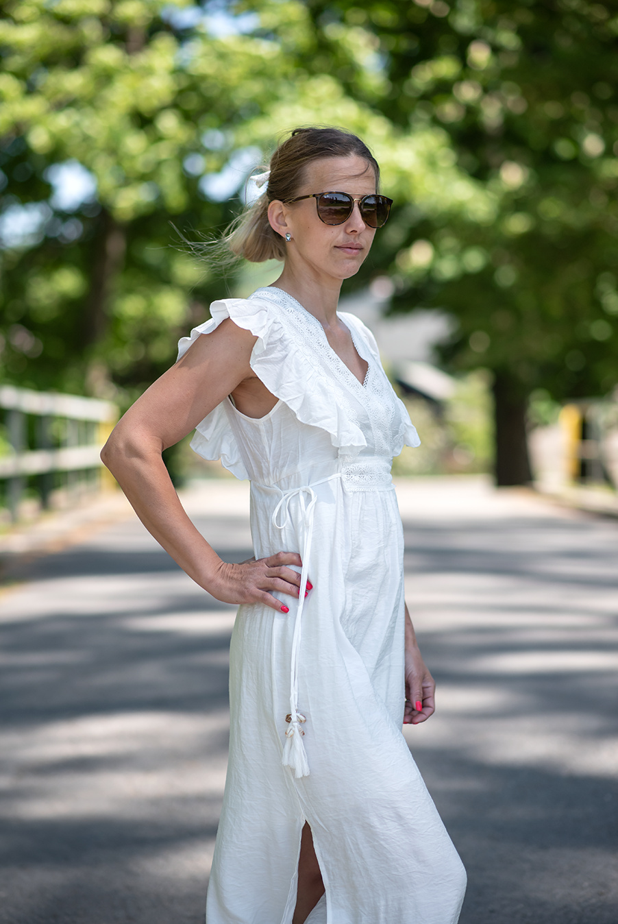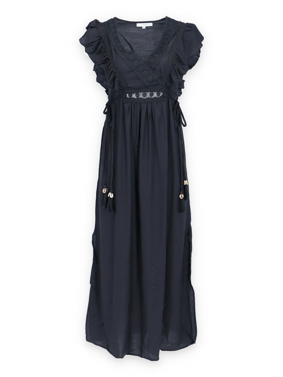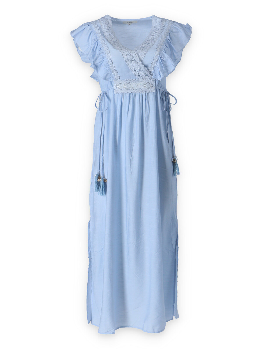 Dámské dlouhé letní šaty s rozparkem po stranách, možnosti vypasování v pase a podšívkou, doplněné aplikací krajky ve výstřihu.