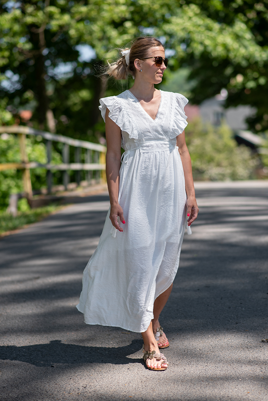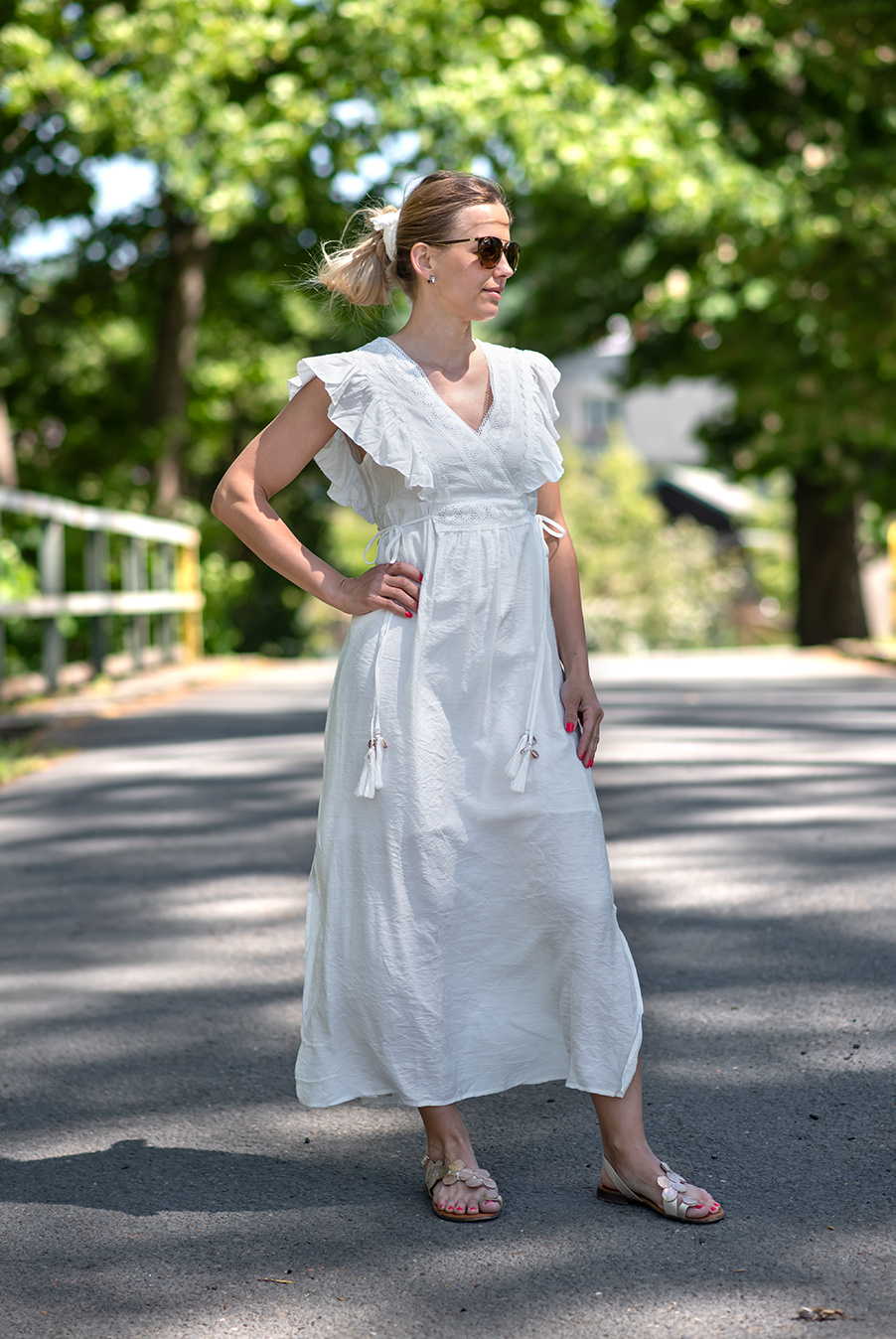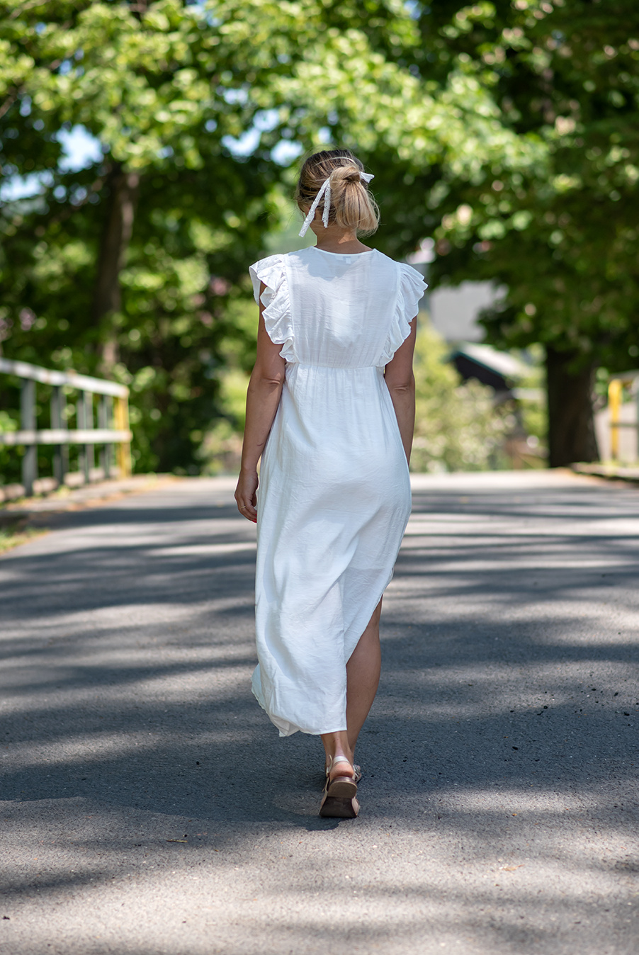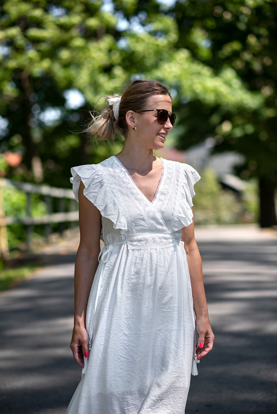Dámské dlouhé letní šaty s rozparkem po stranách, možnosti vypasování v pase a podšívkou, doplněné aplikací krajky ve výstřihu.
