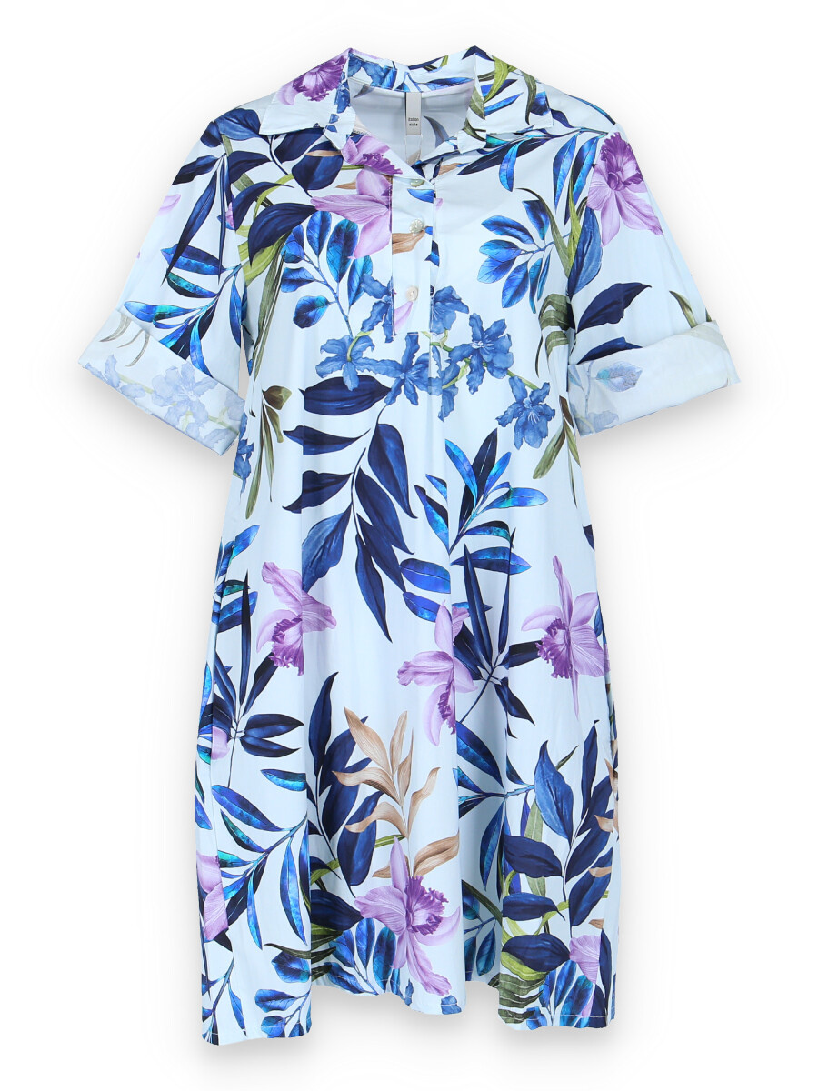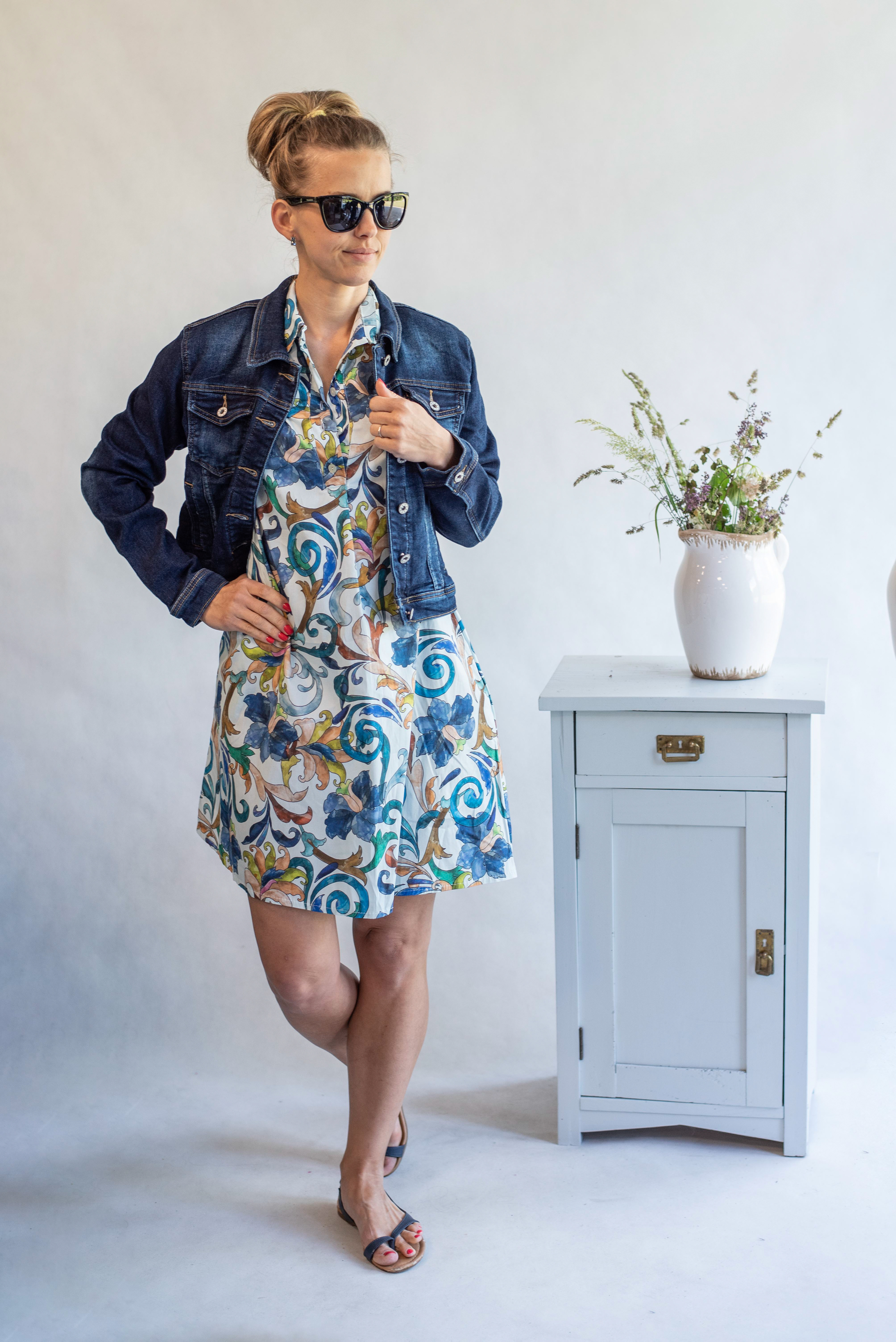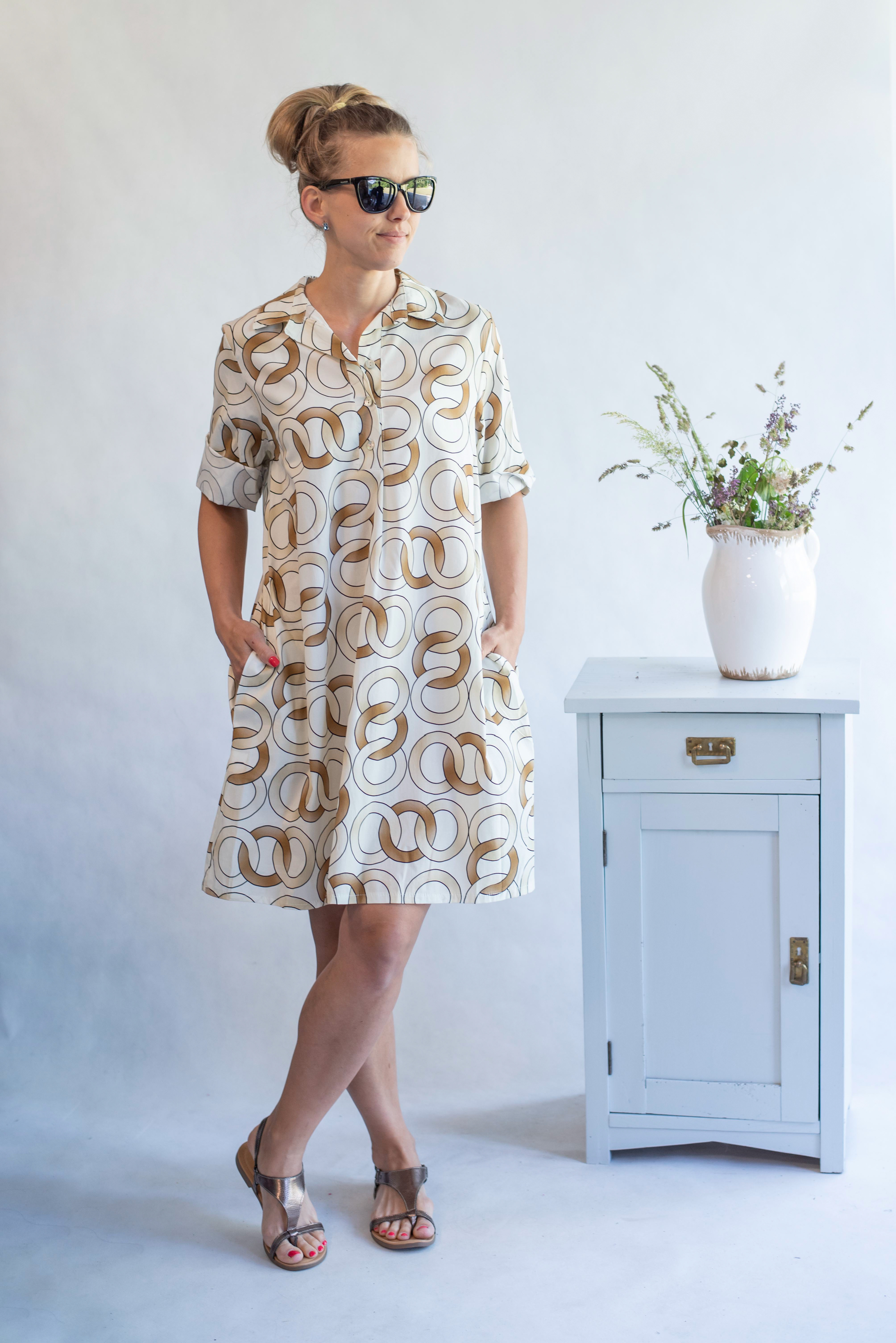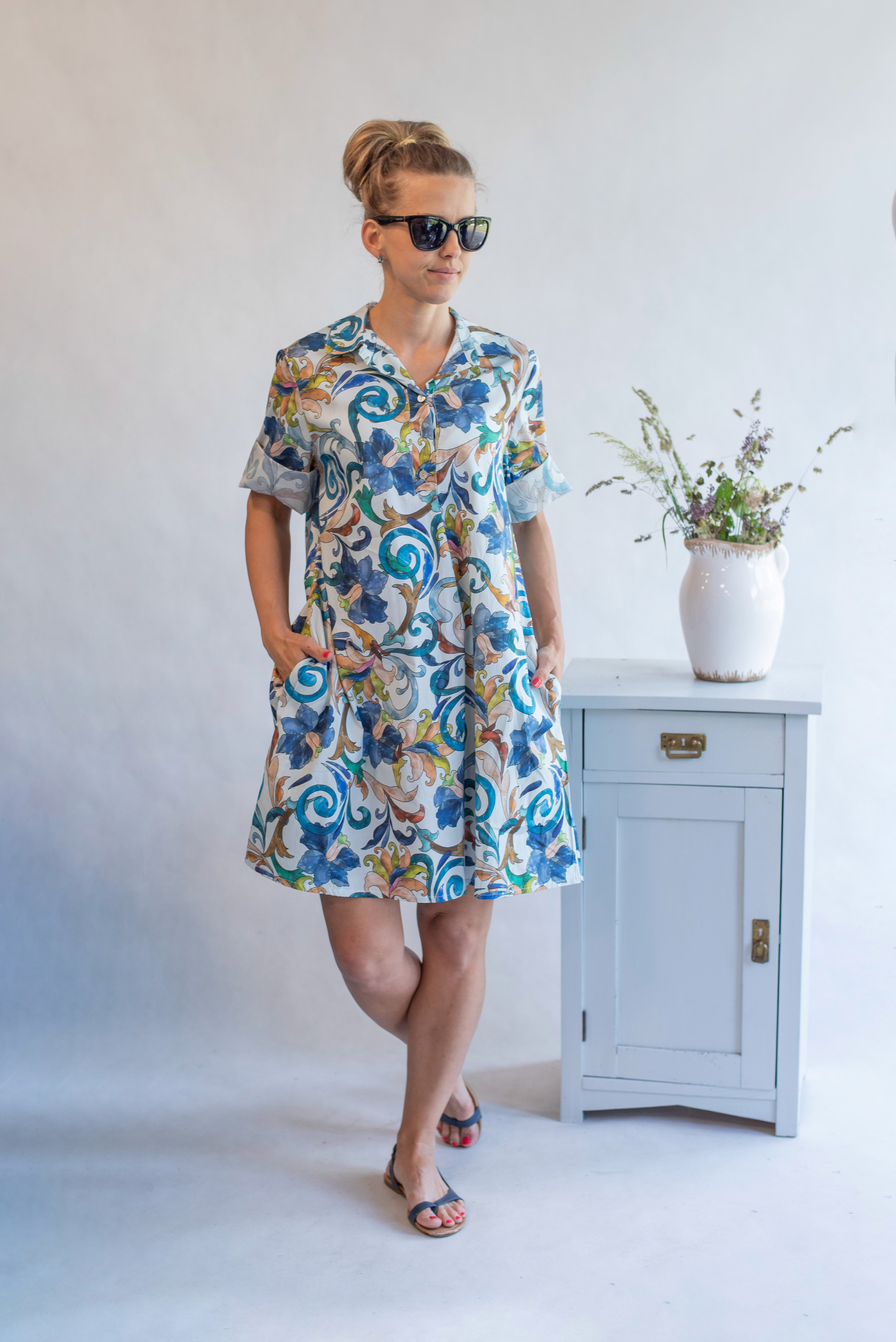 Košilové letní dámské šaty s krátkým rukávem, všité boční kapsy, délka ke kolenům a výstřih s knoflíky