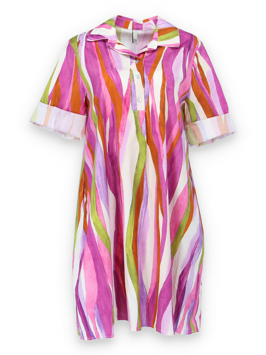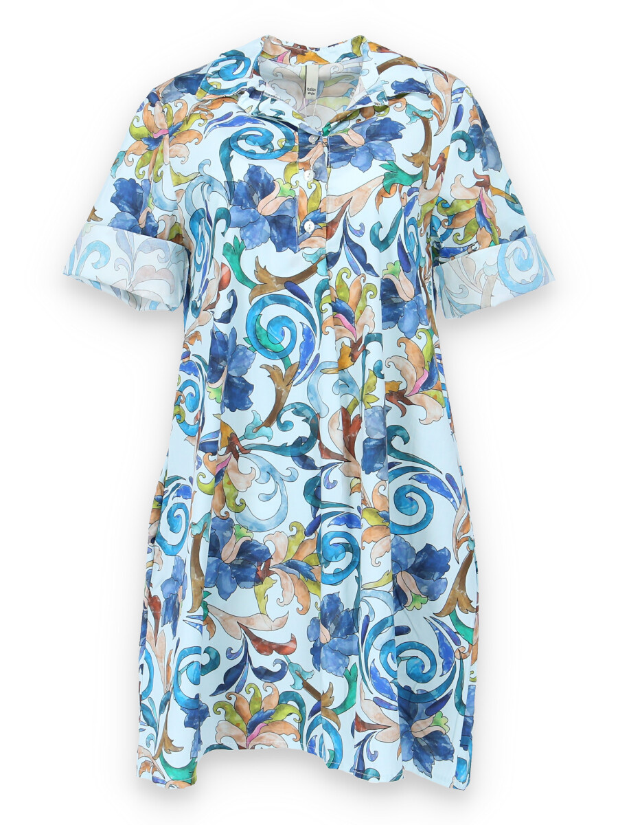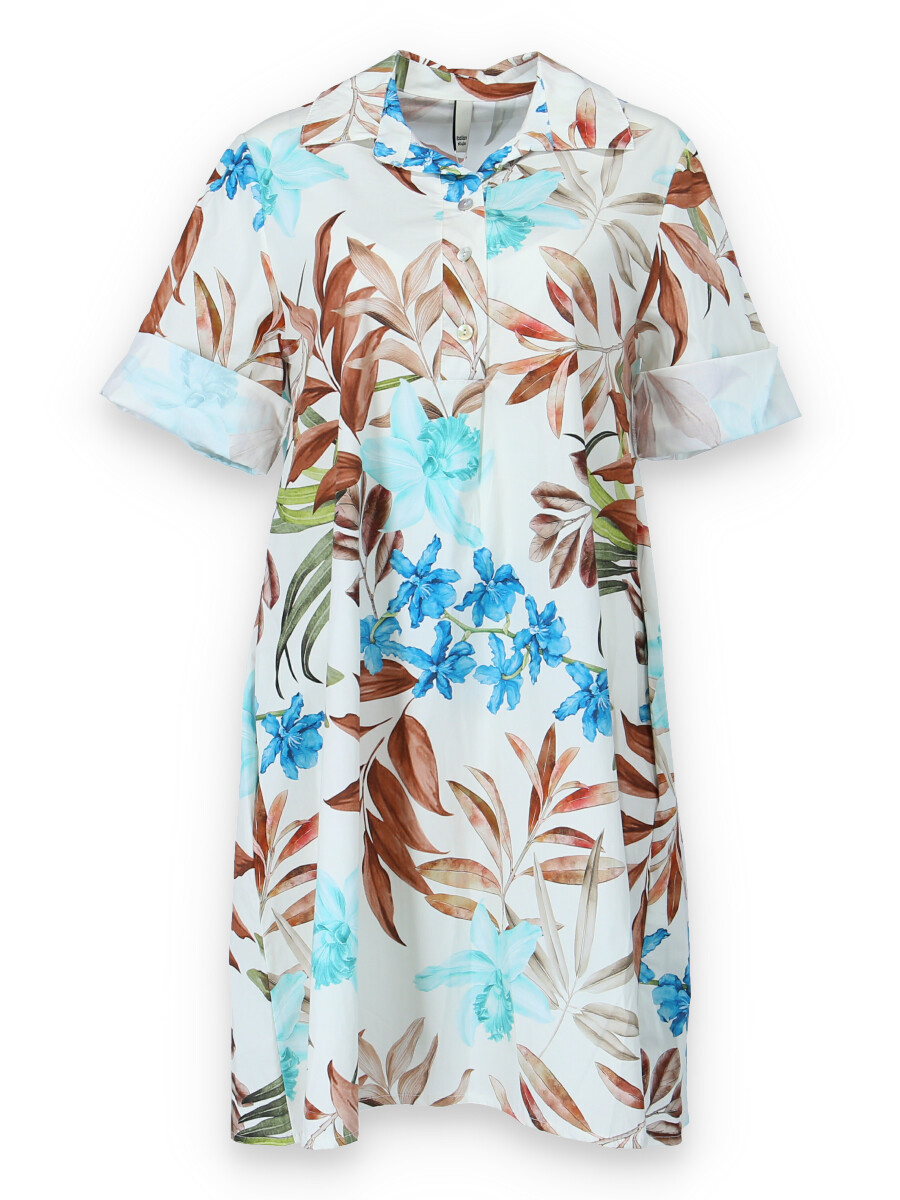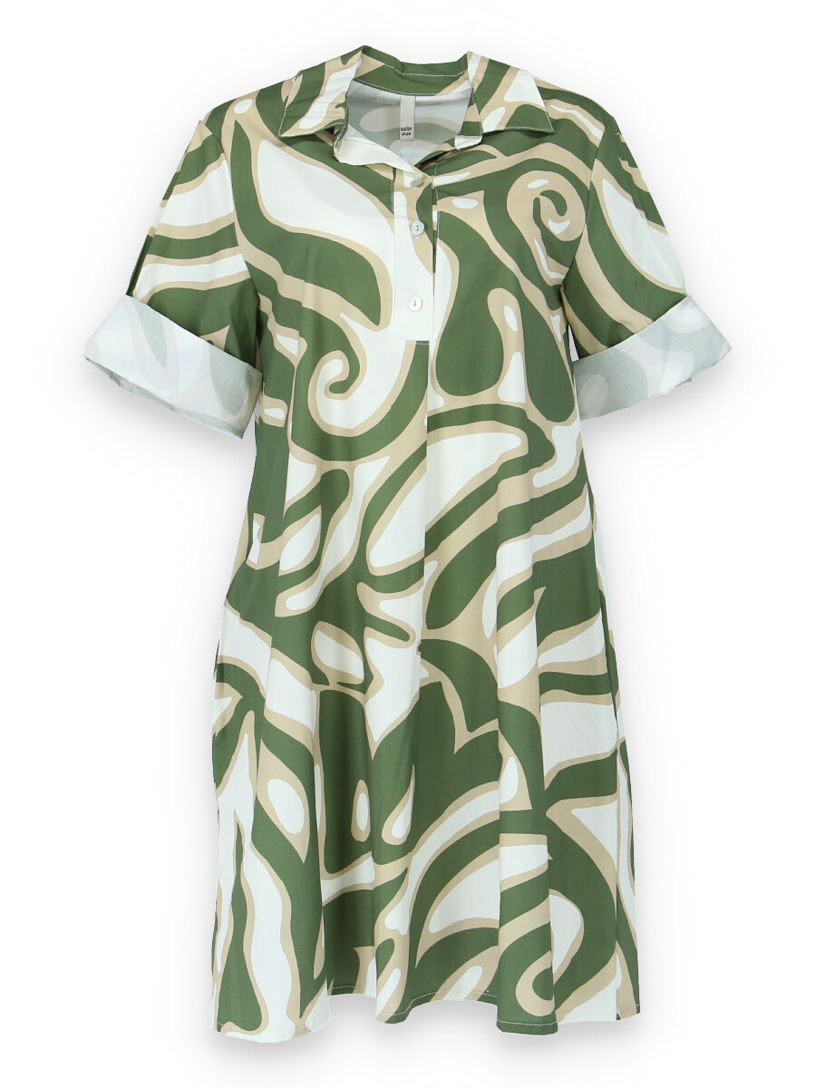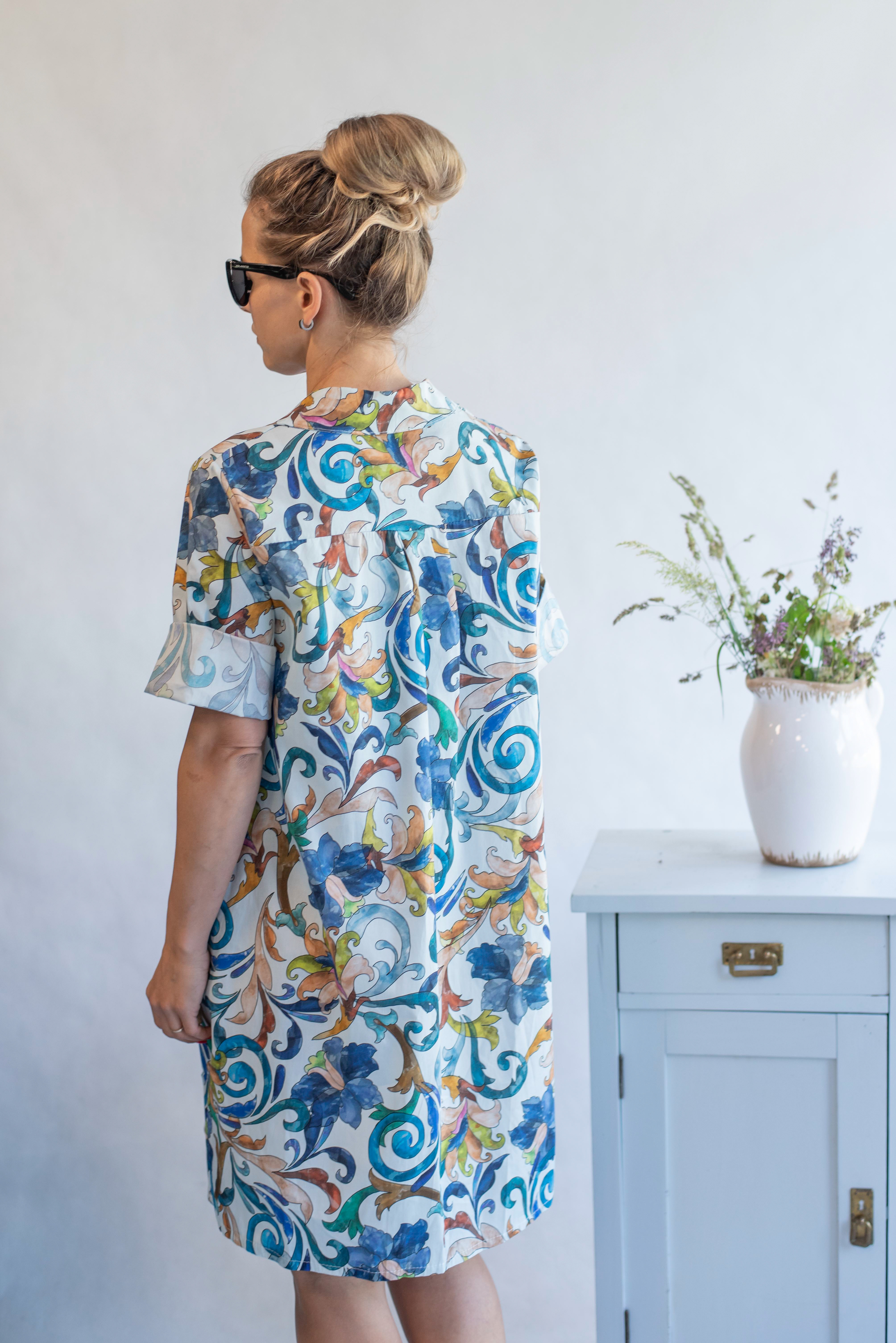 Košilové letní dámské šaty s krátkým rukávem, všité boční kapsy, délka ke kolenům a výstřih s knoflíky