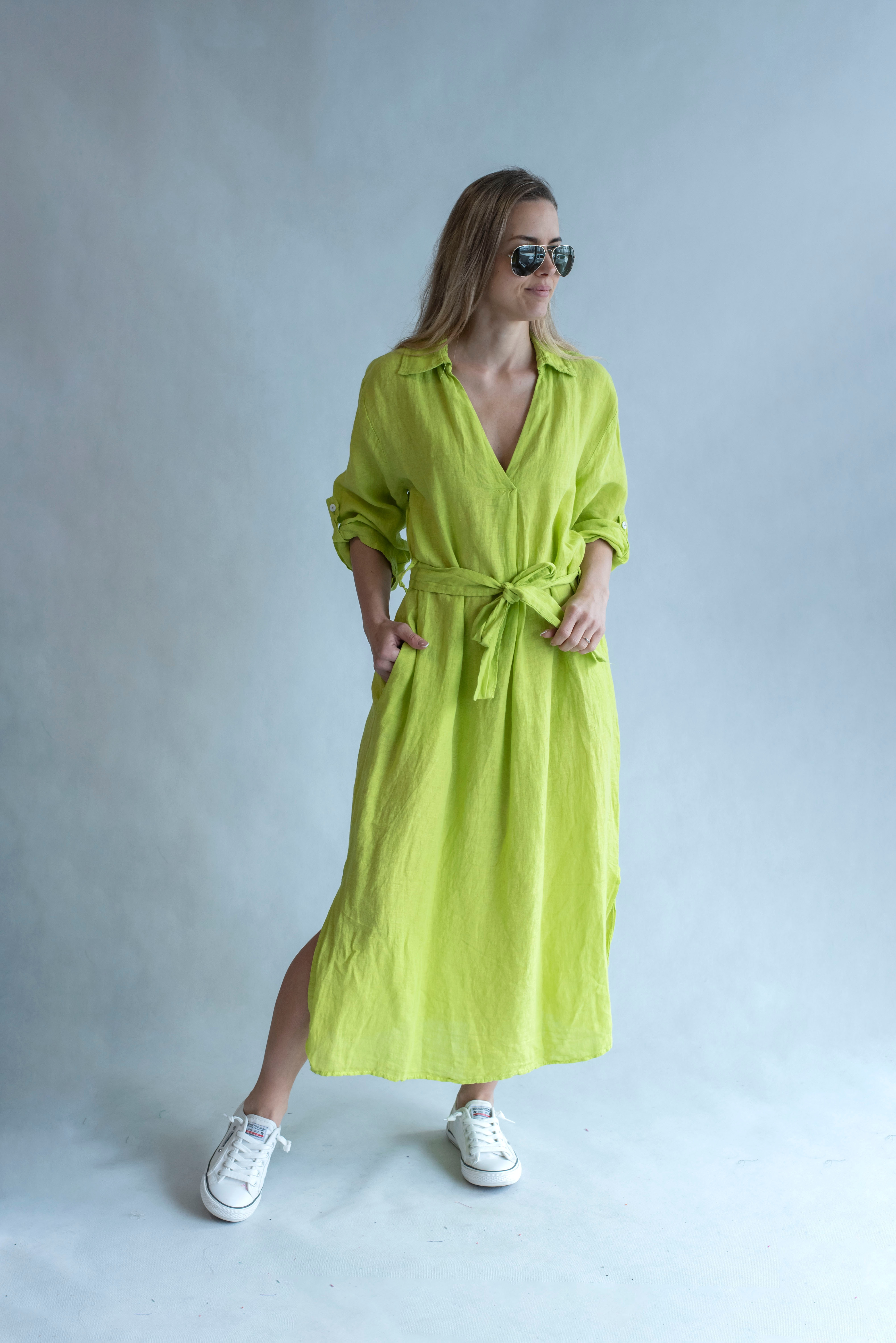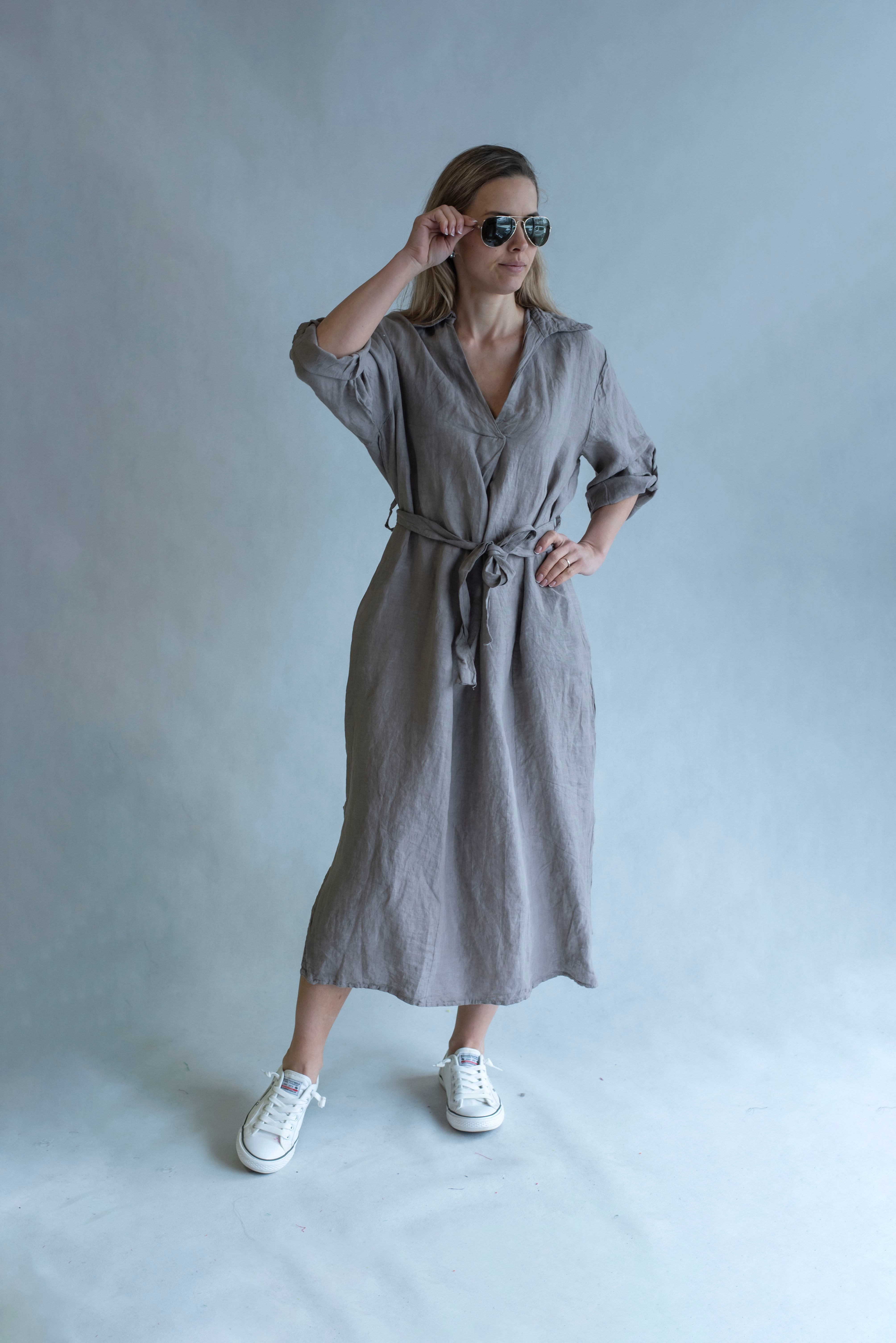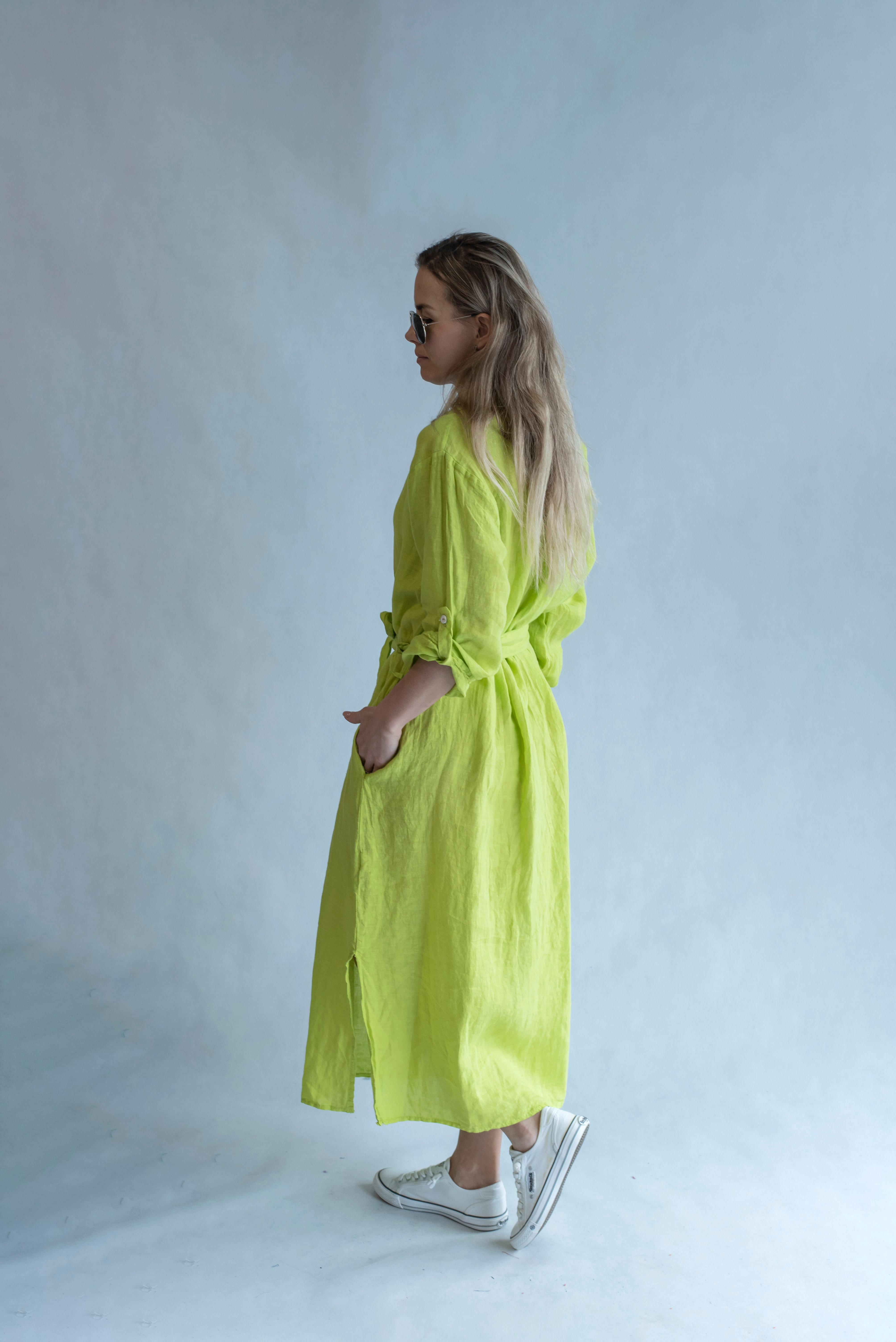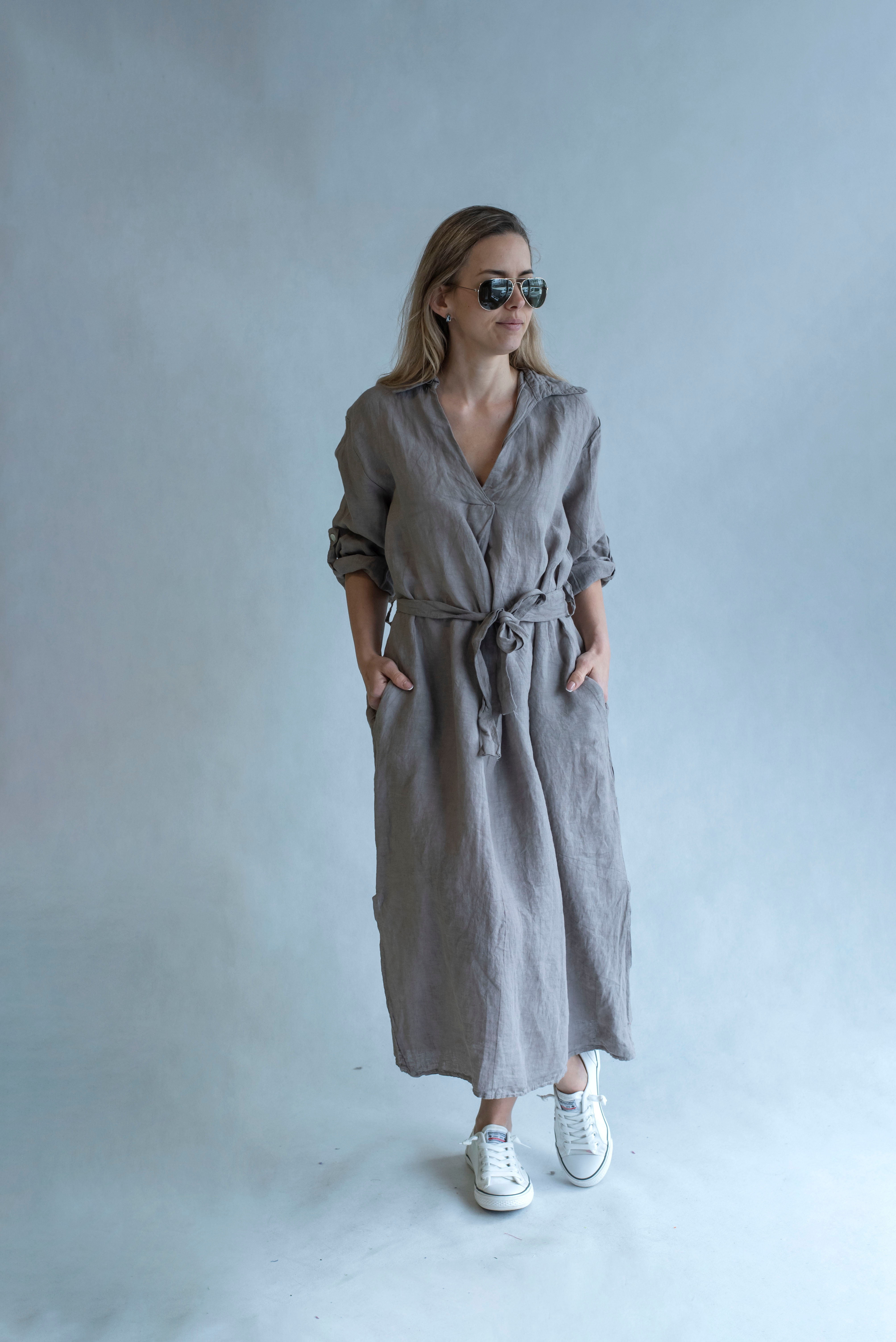 Dámské lněné šaty s kapsami v bocích
