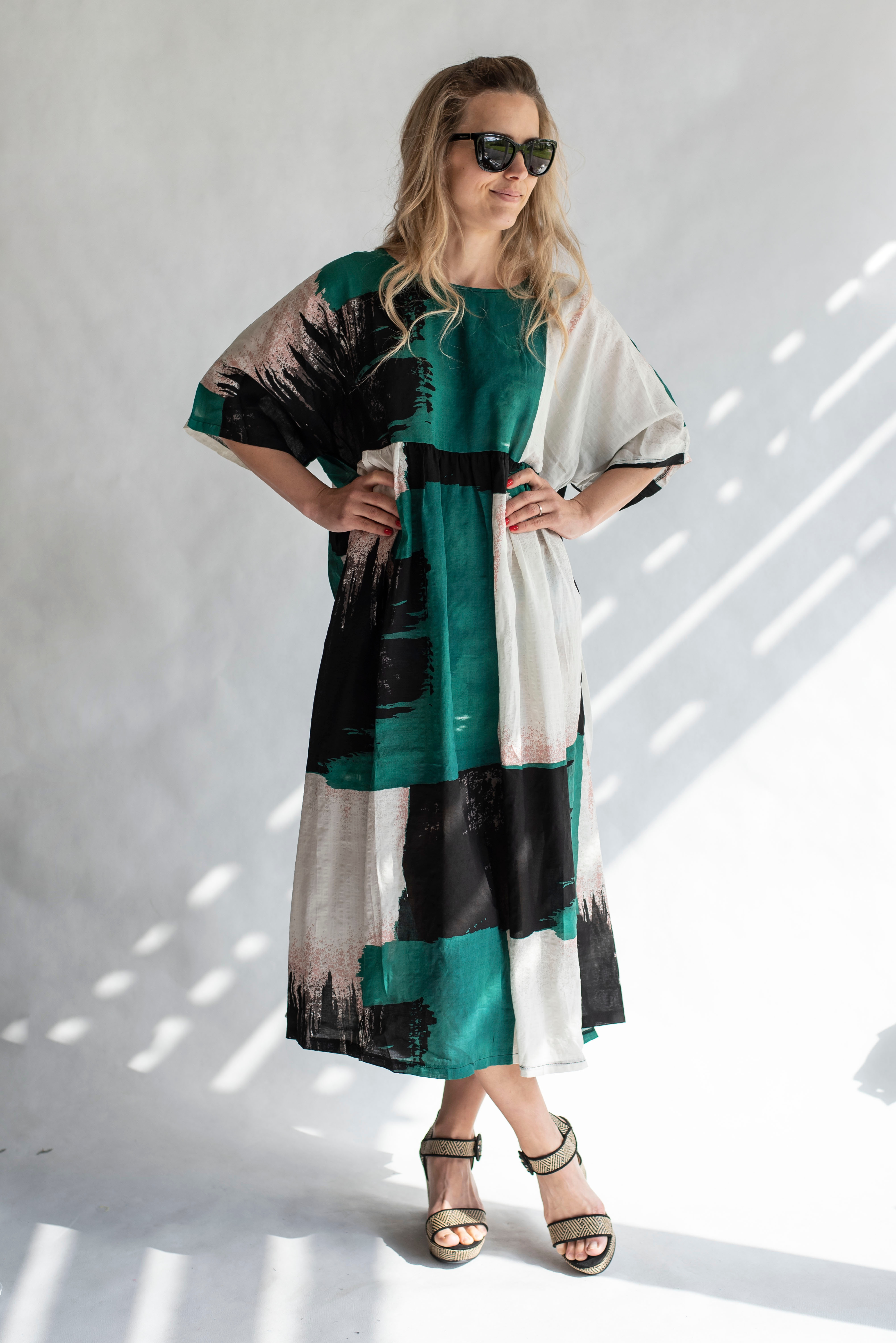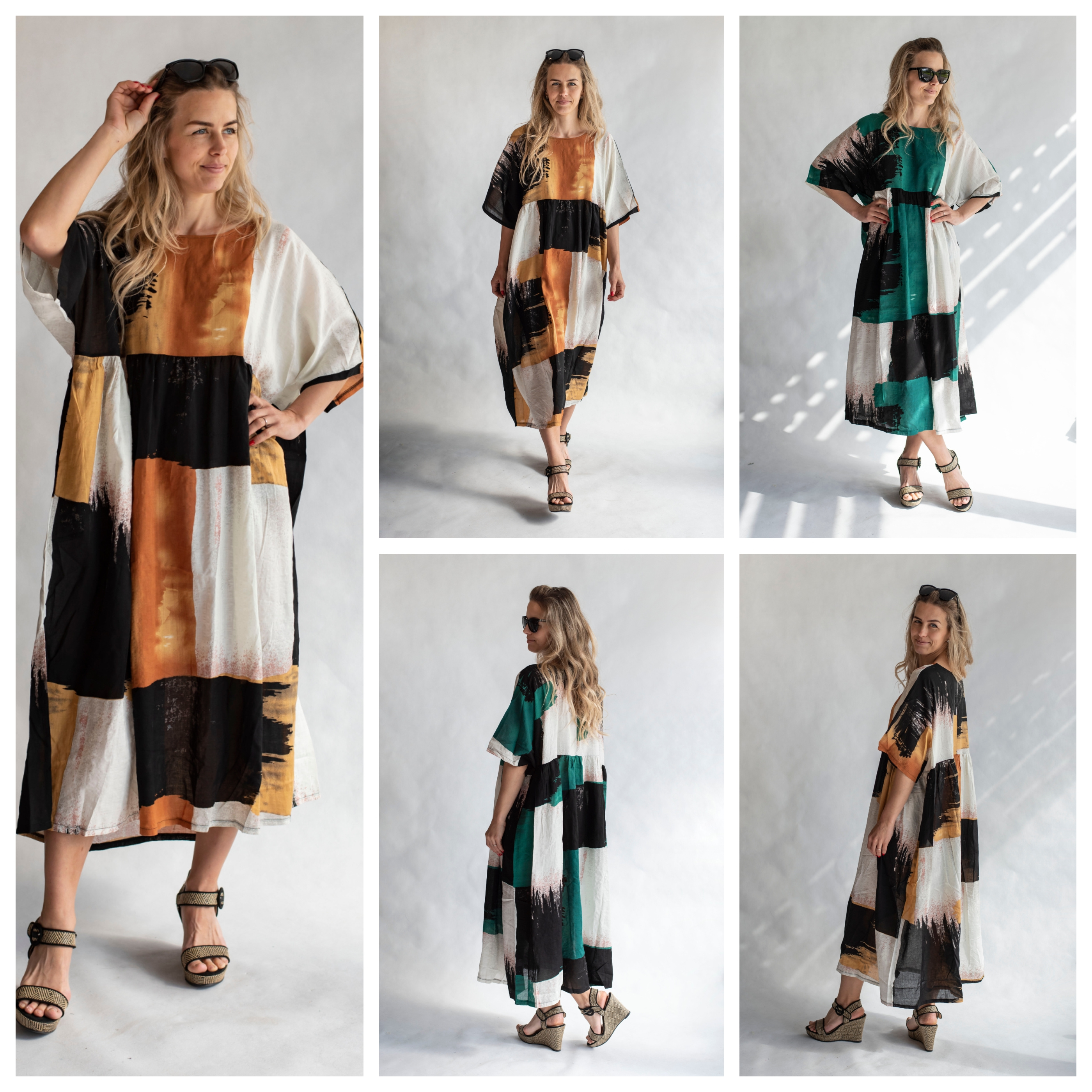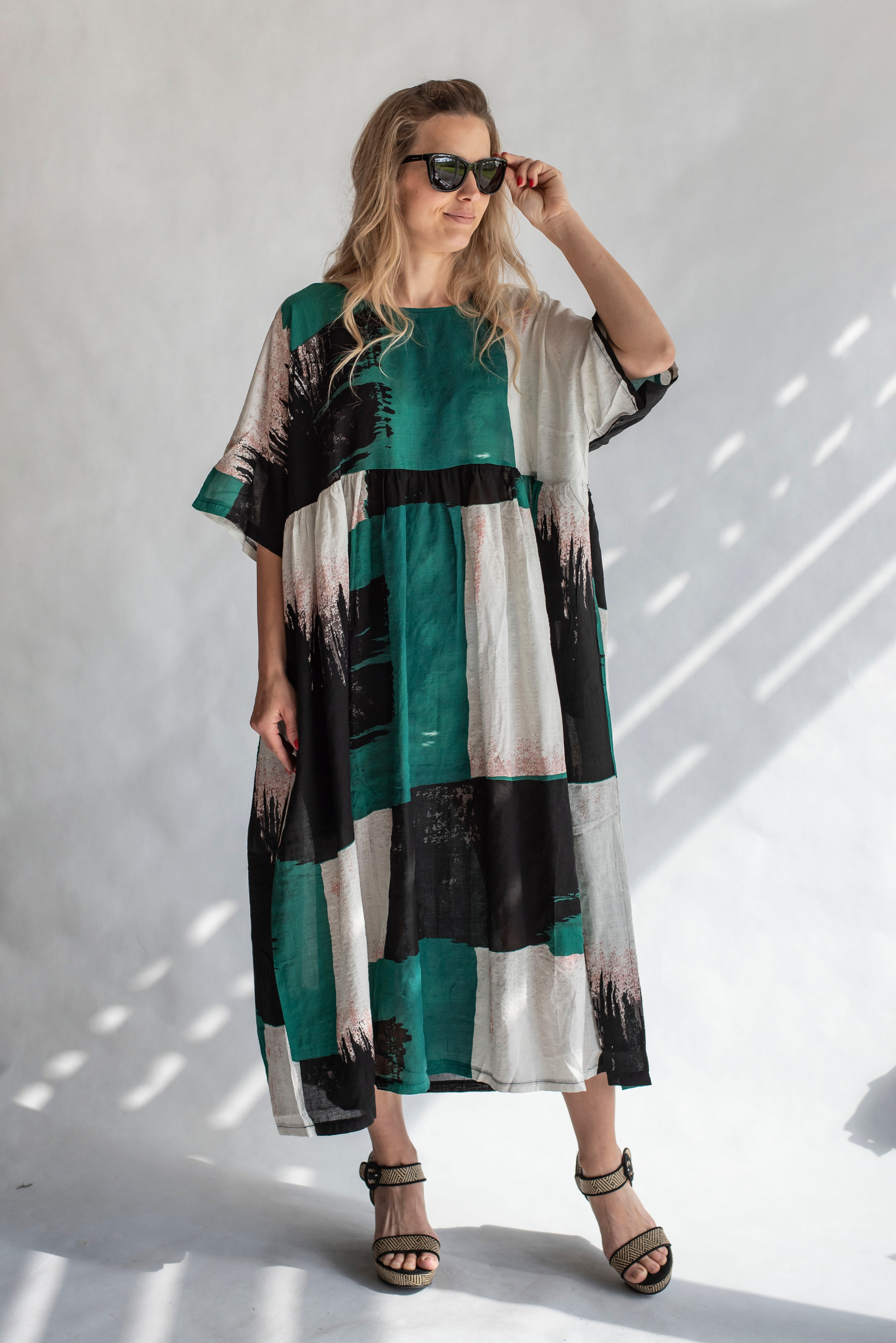 Letní dámské šaty oversize stylu s kulatým výstřihem, krátkým rukávem a všitými kapsami .