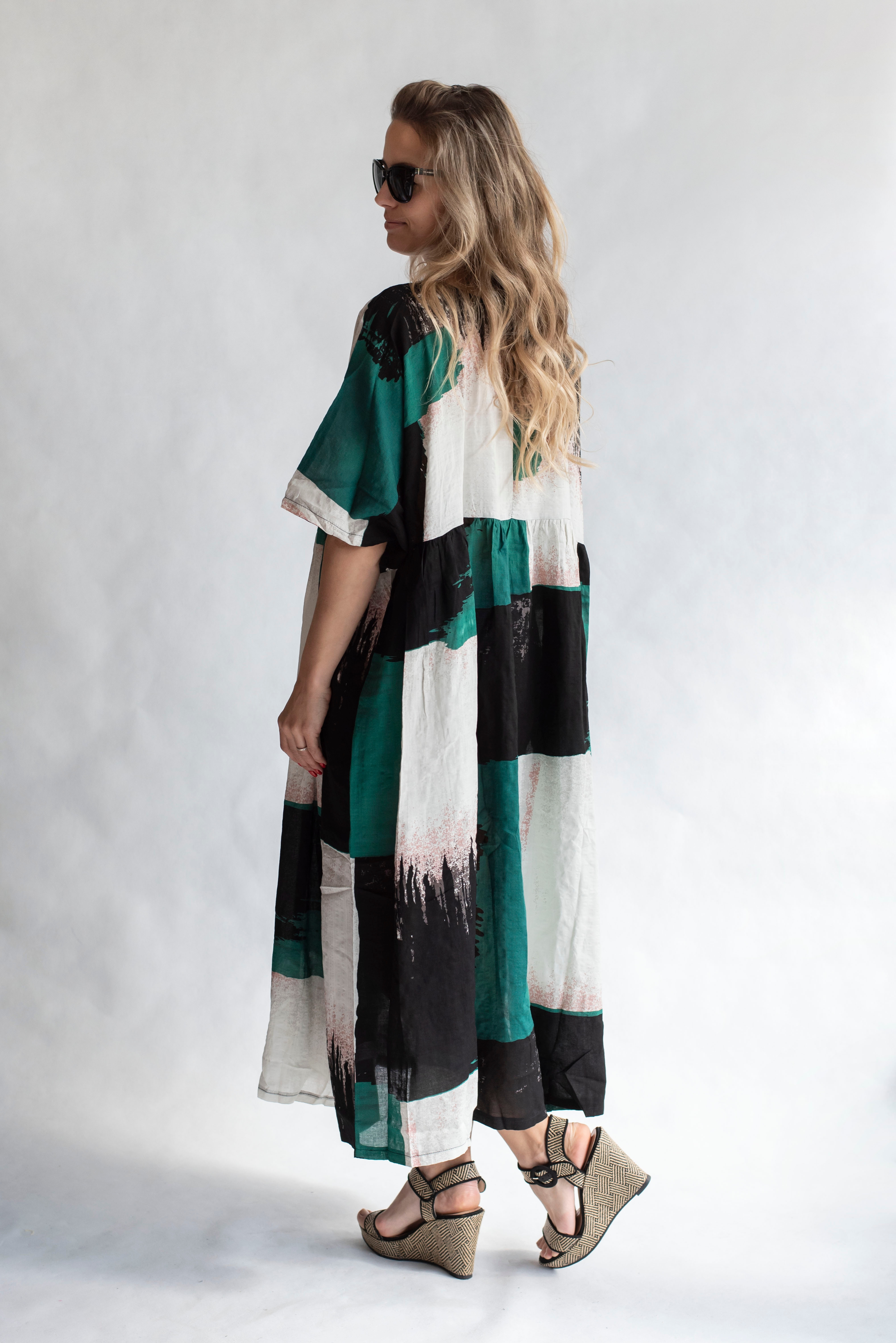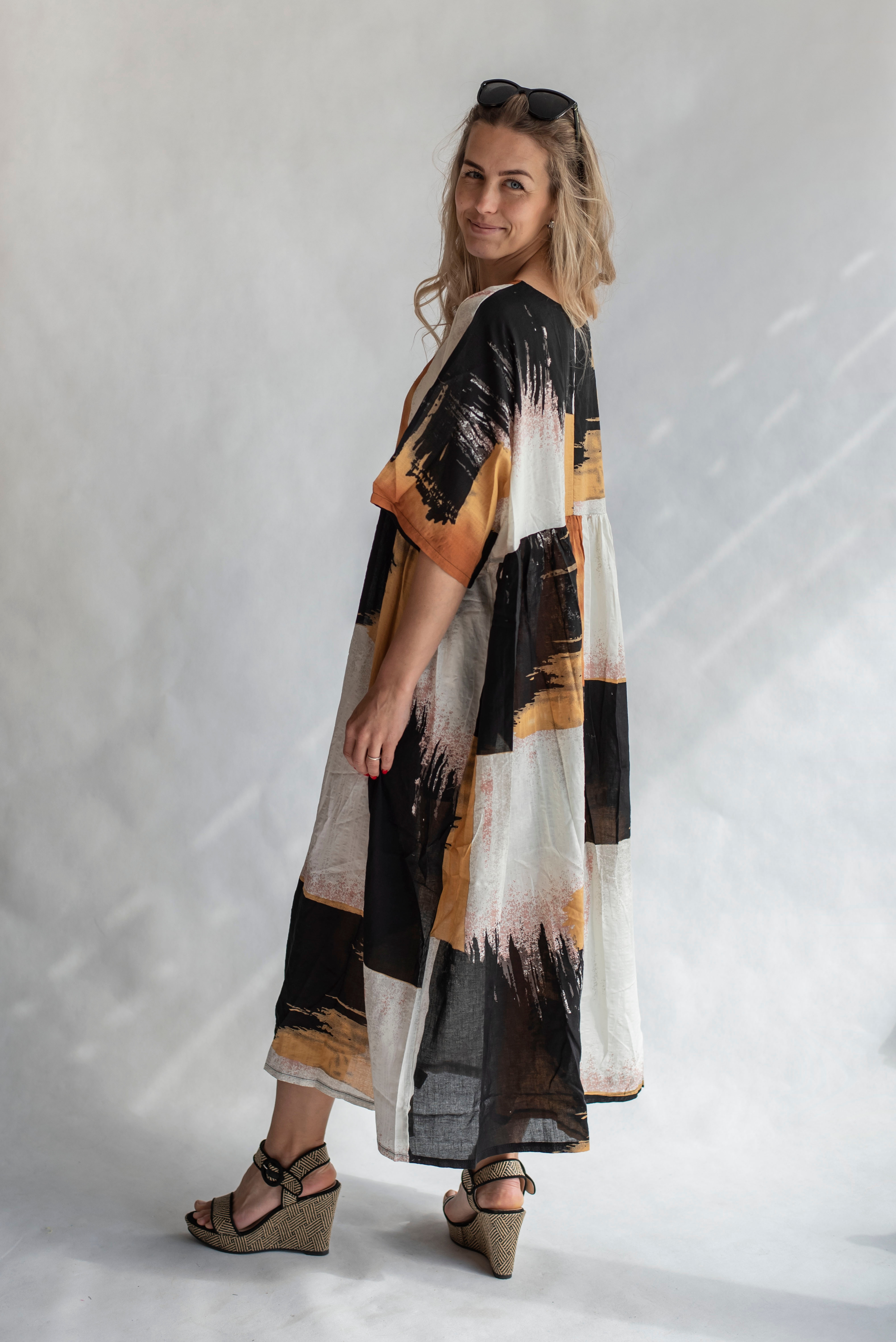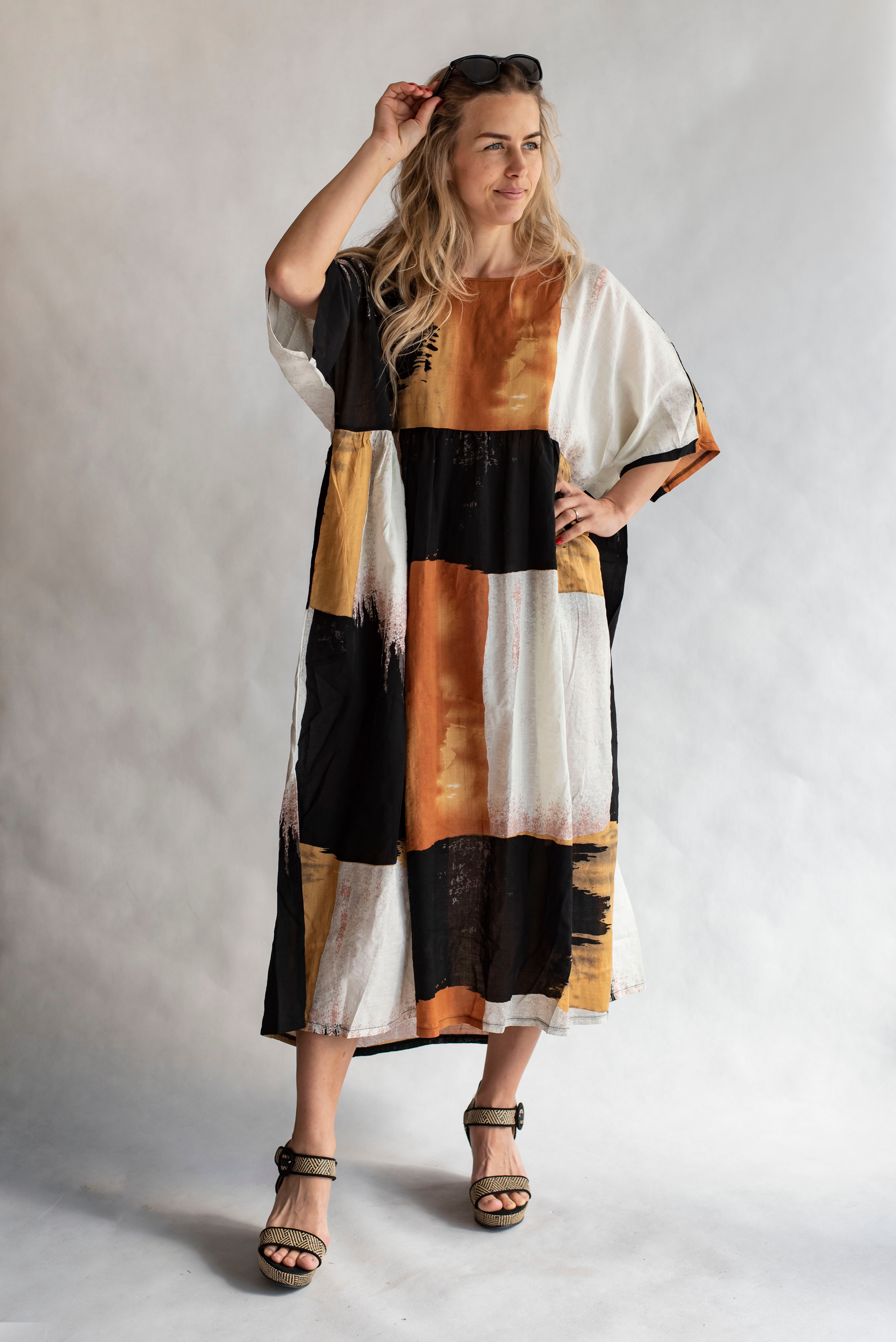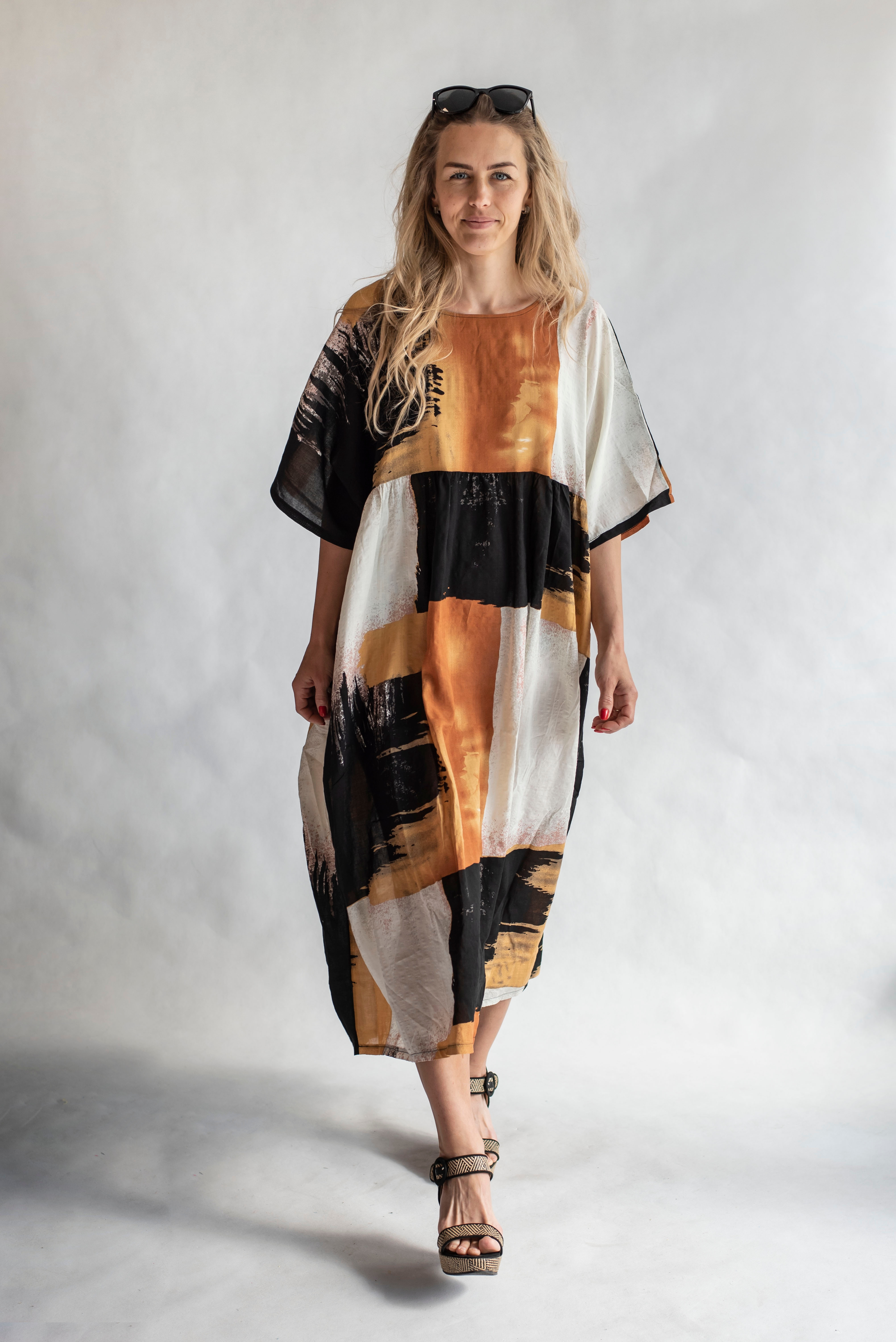 Letní dámské šaty oversize stylu s kulatým výstřihem, krátkým rukávem a všitými kapsami .