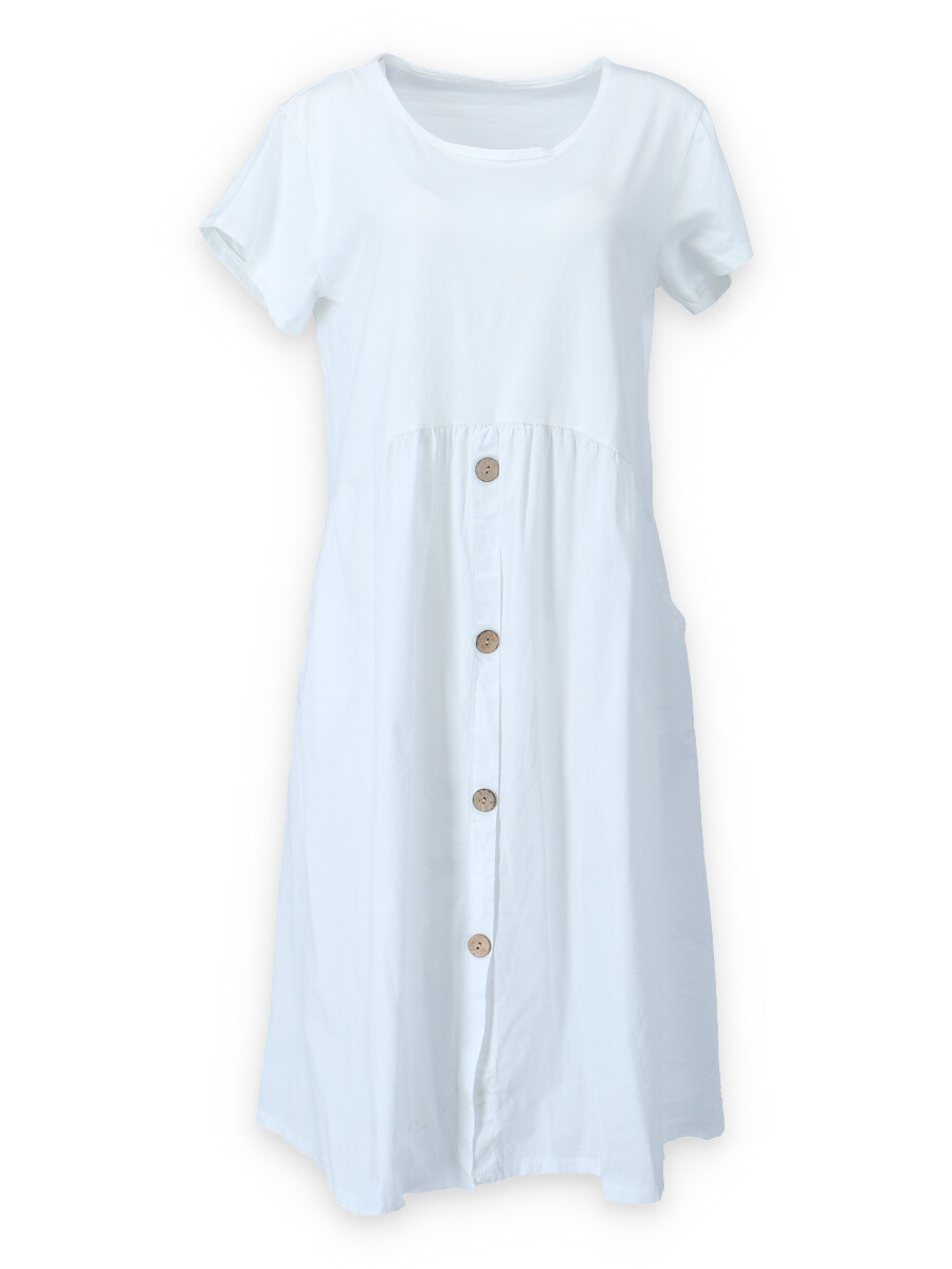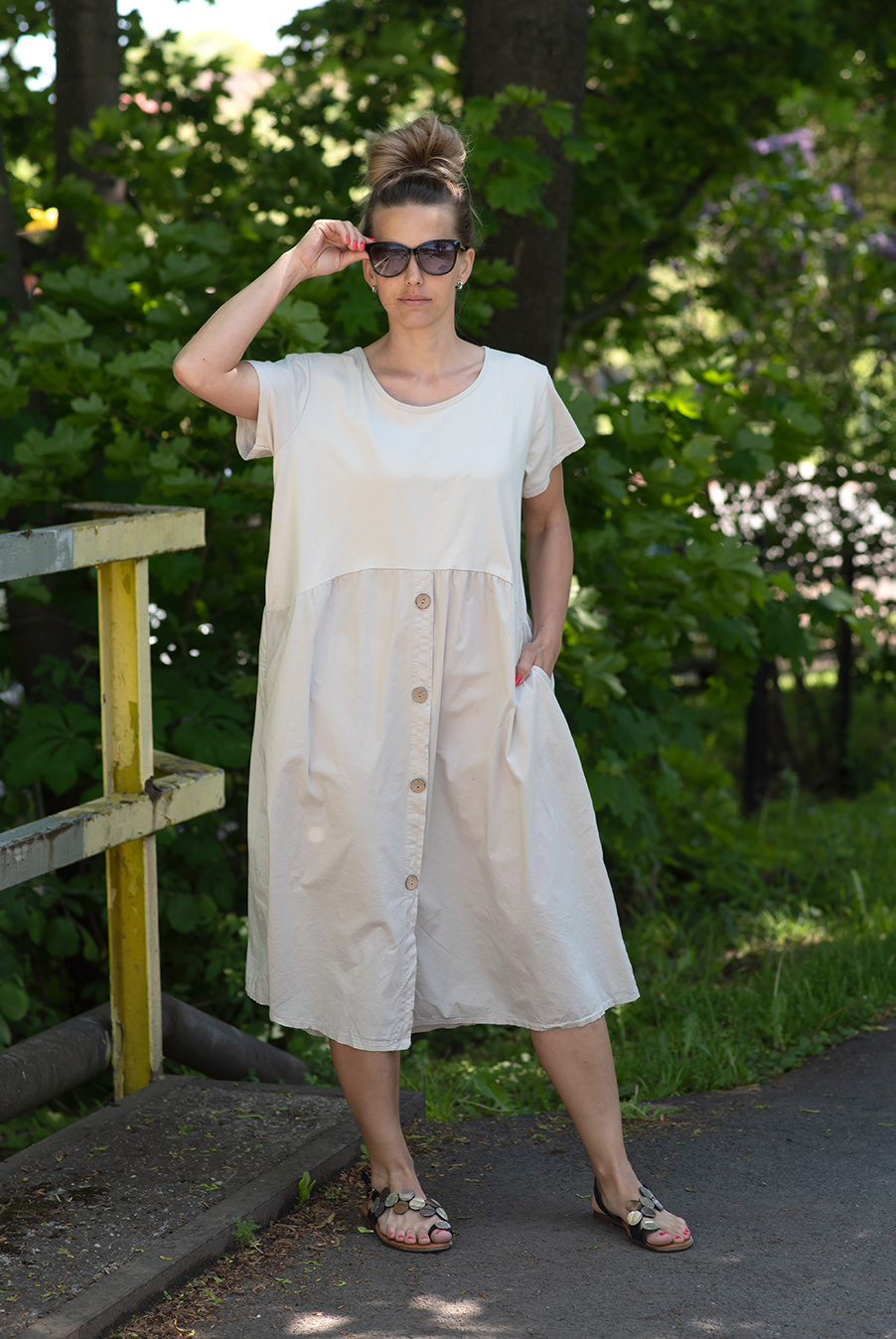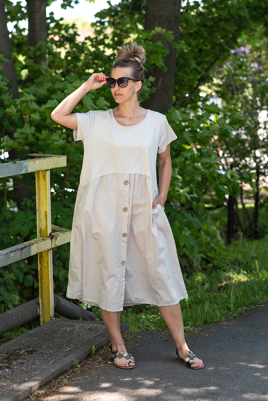 Letní šaty s krátkým rukávem a kapsami v bocích.