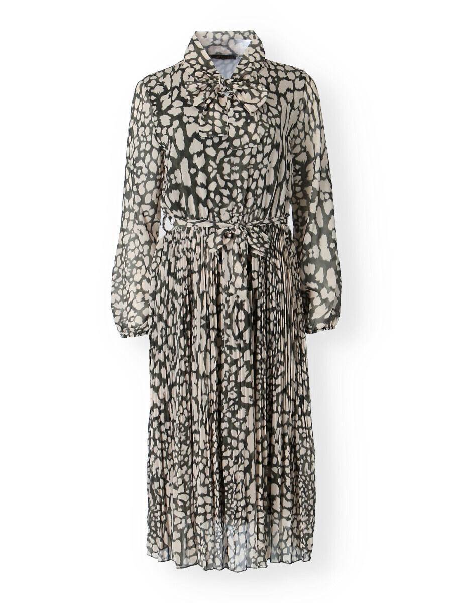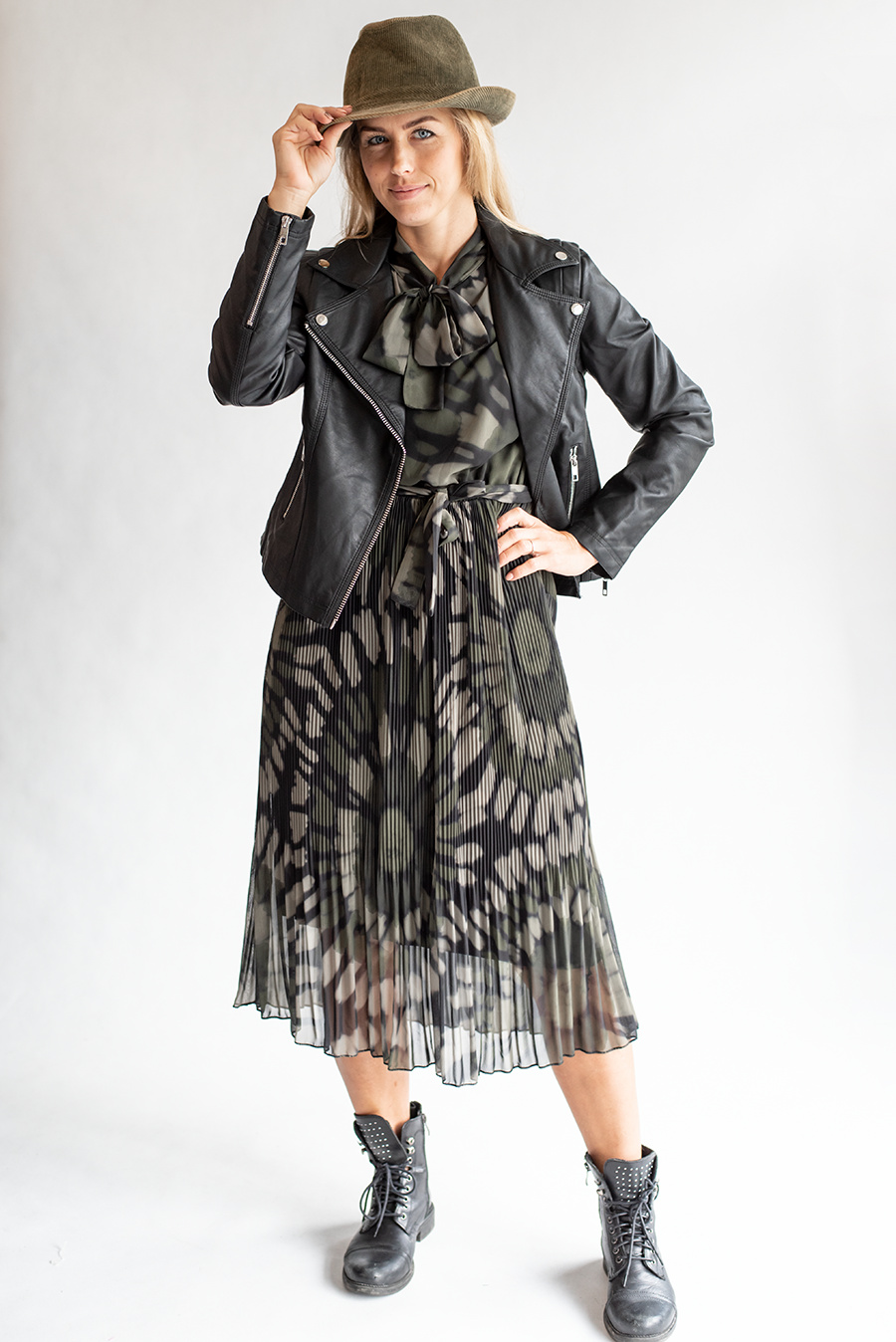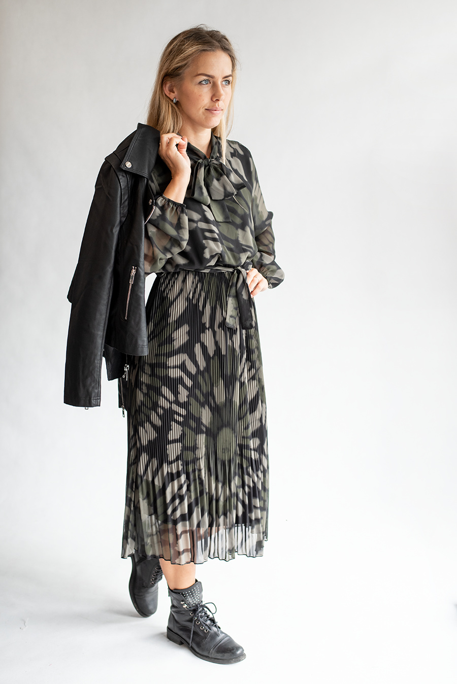Spodní část plisé, vázání okolo krku, v pase do gumy a s vázáním na látkový pásek.