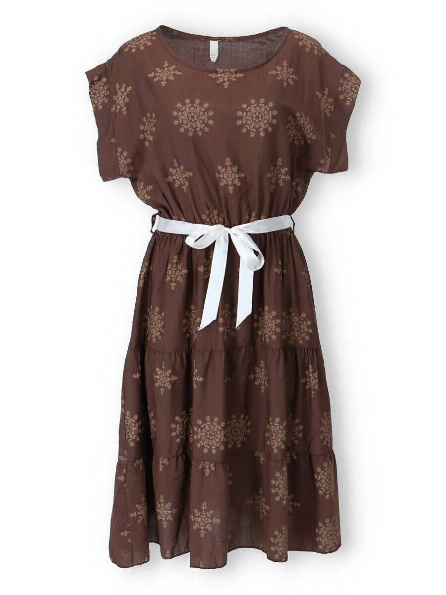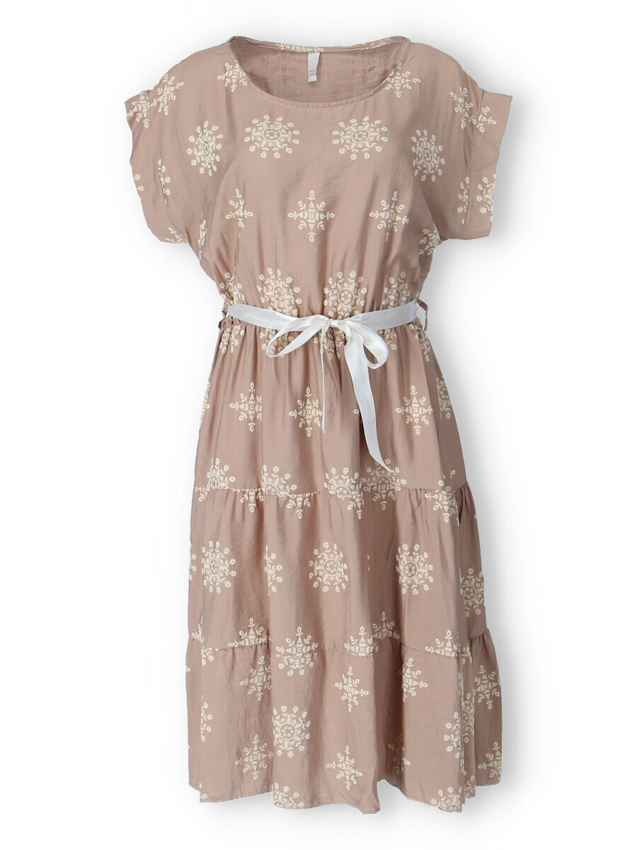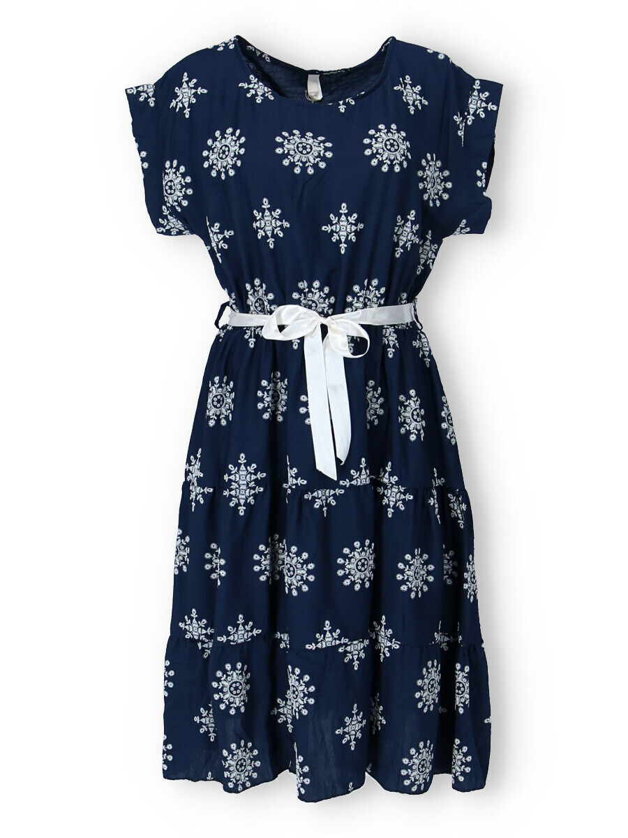 Dámské MIDI šaty - pod kolena,s potiskem. Šaty mají kulatý výstřih a v pase jsou na gumičku, doplněny stuhou na uvázání. Vyrobeno v Itálii.