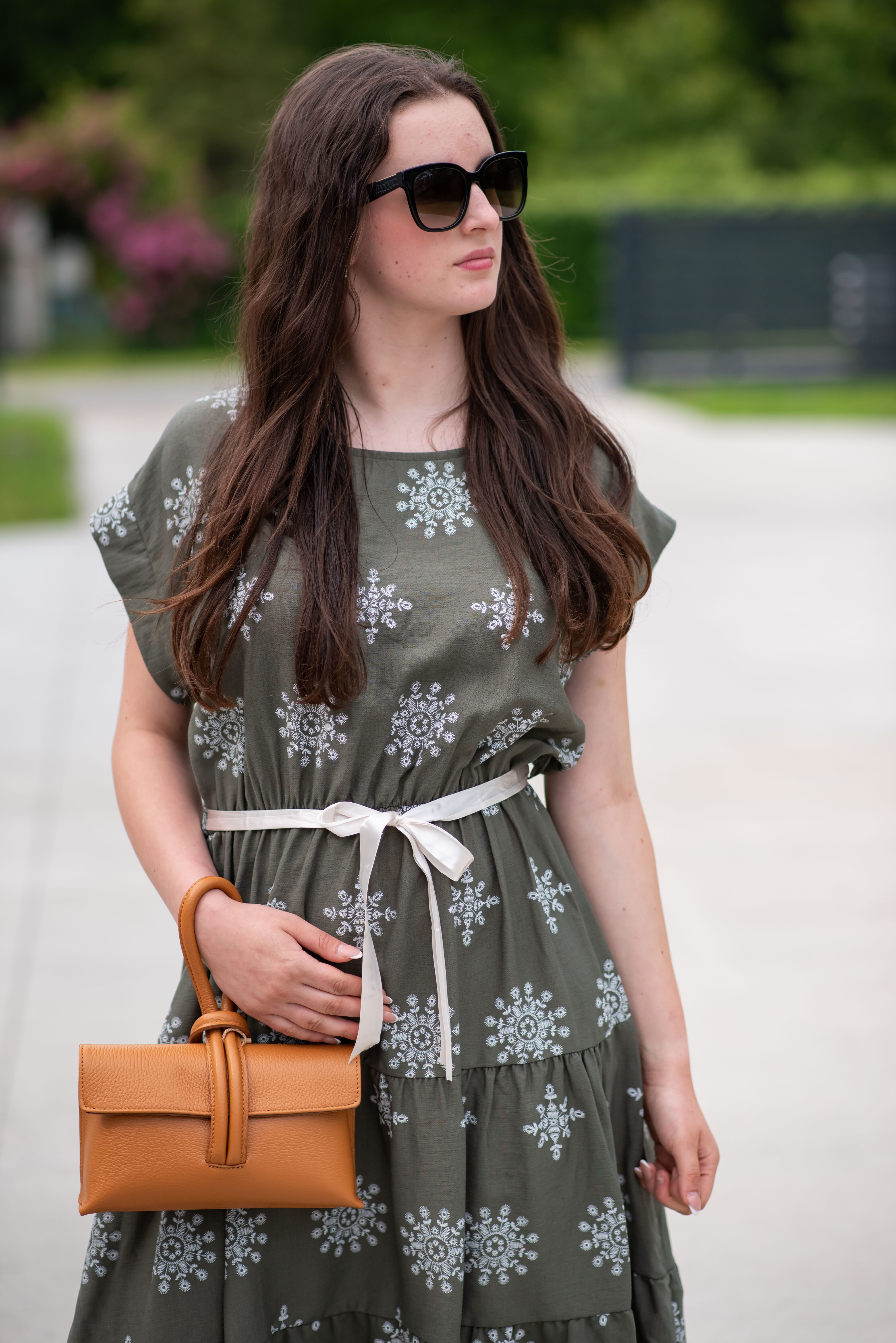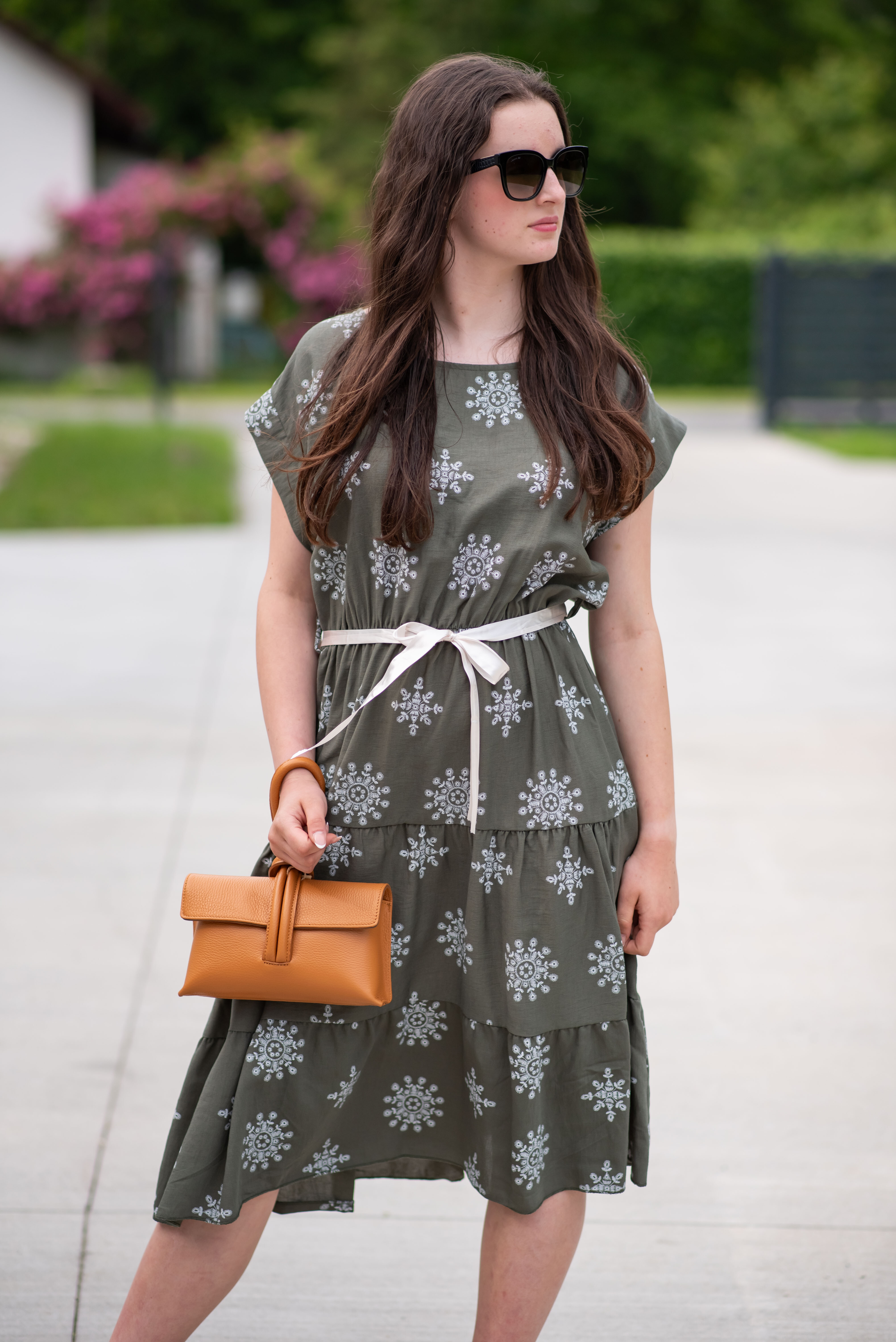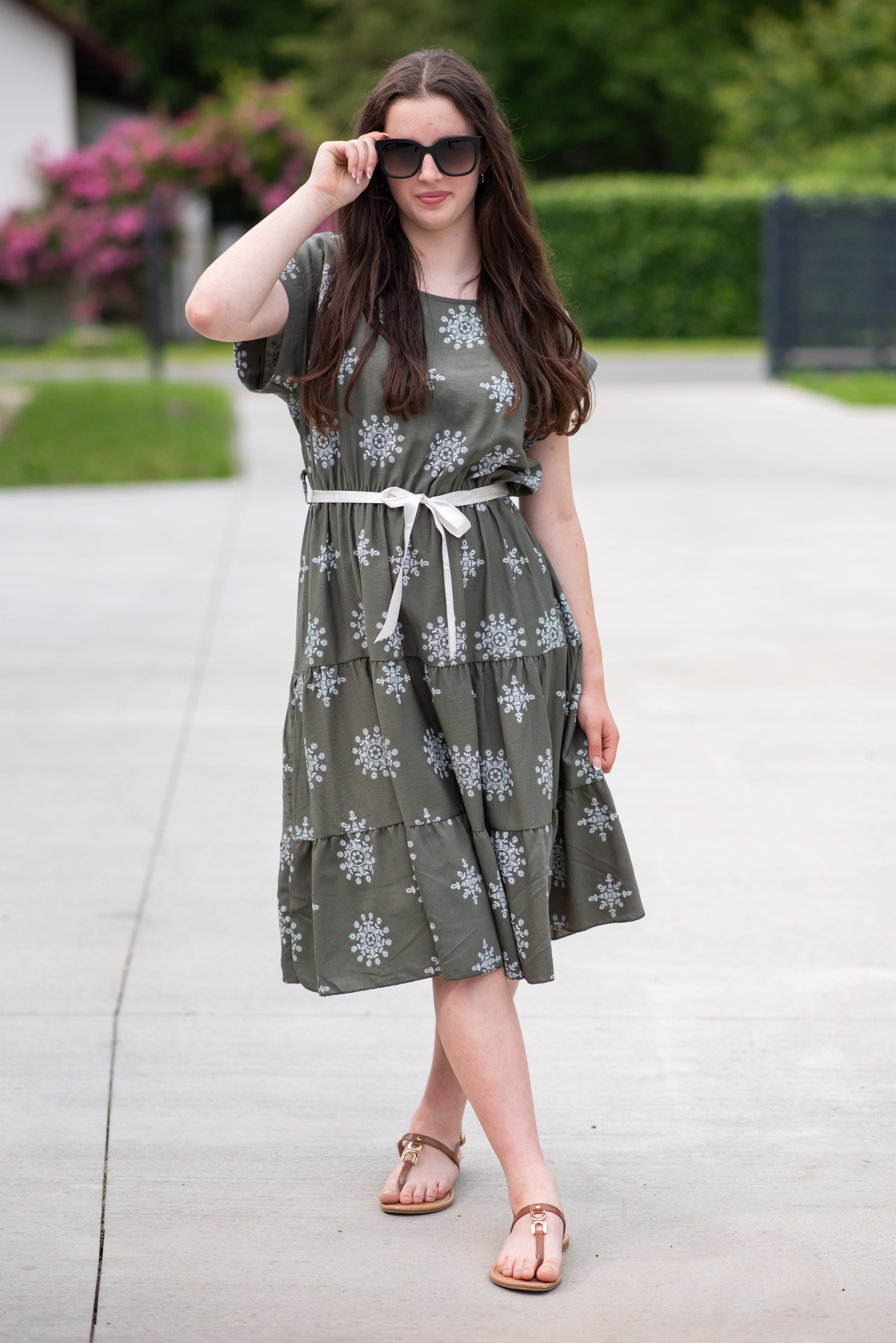 Dámské MIDI šaty - pod kolena,s potiskem. Šaty mají kulatý výstřih a v pase jsou na gumičku, doplněny stuhou na uvázání. Vyrobeno v Itálii.