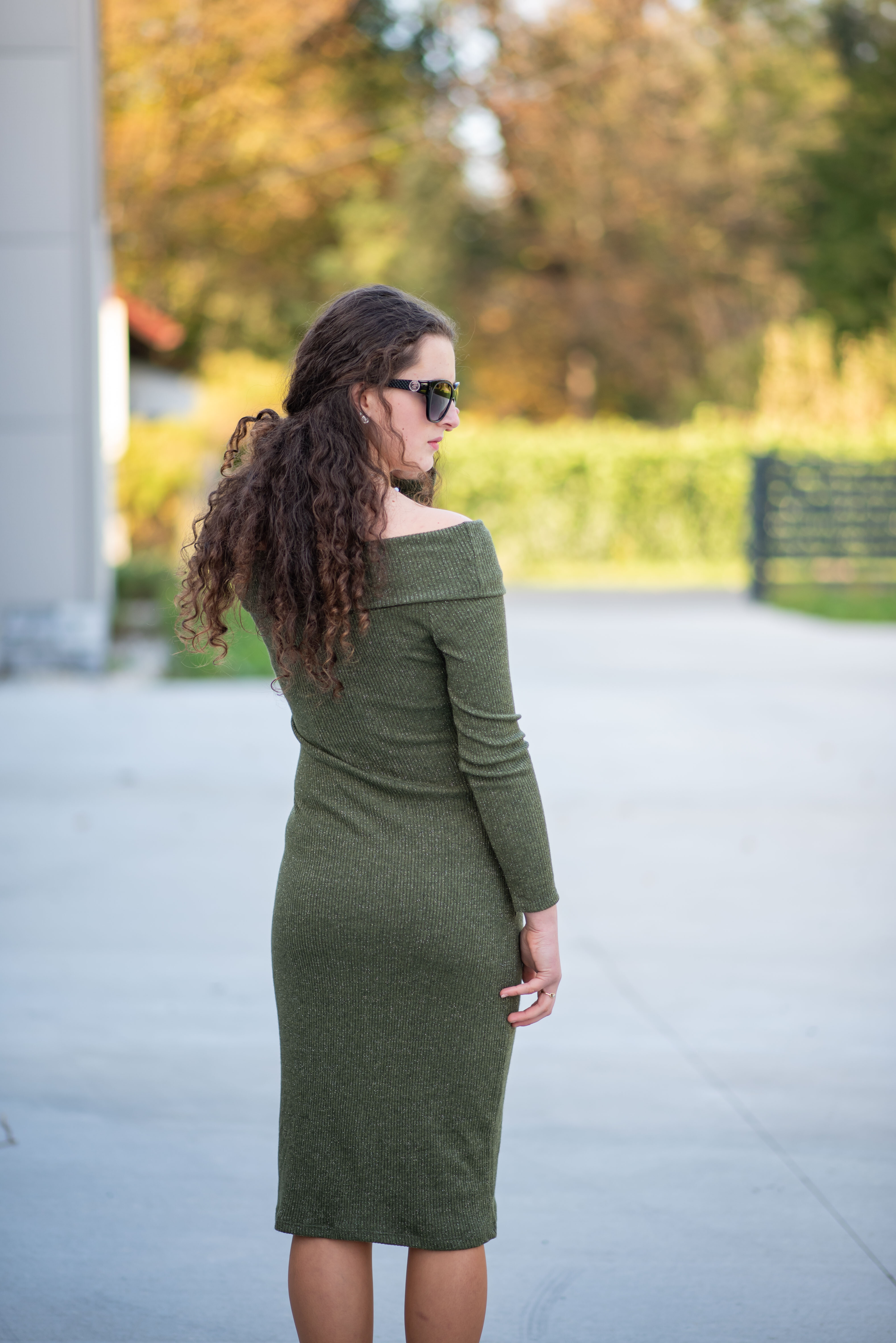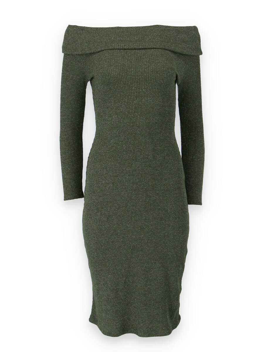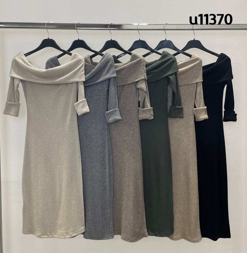 Elegantní šaty s dlouhým rukávem a šálovým límcem na stažení přes ramena. Šaty jsou z žebrovaného materiálu.