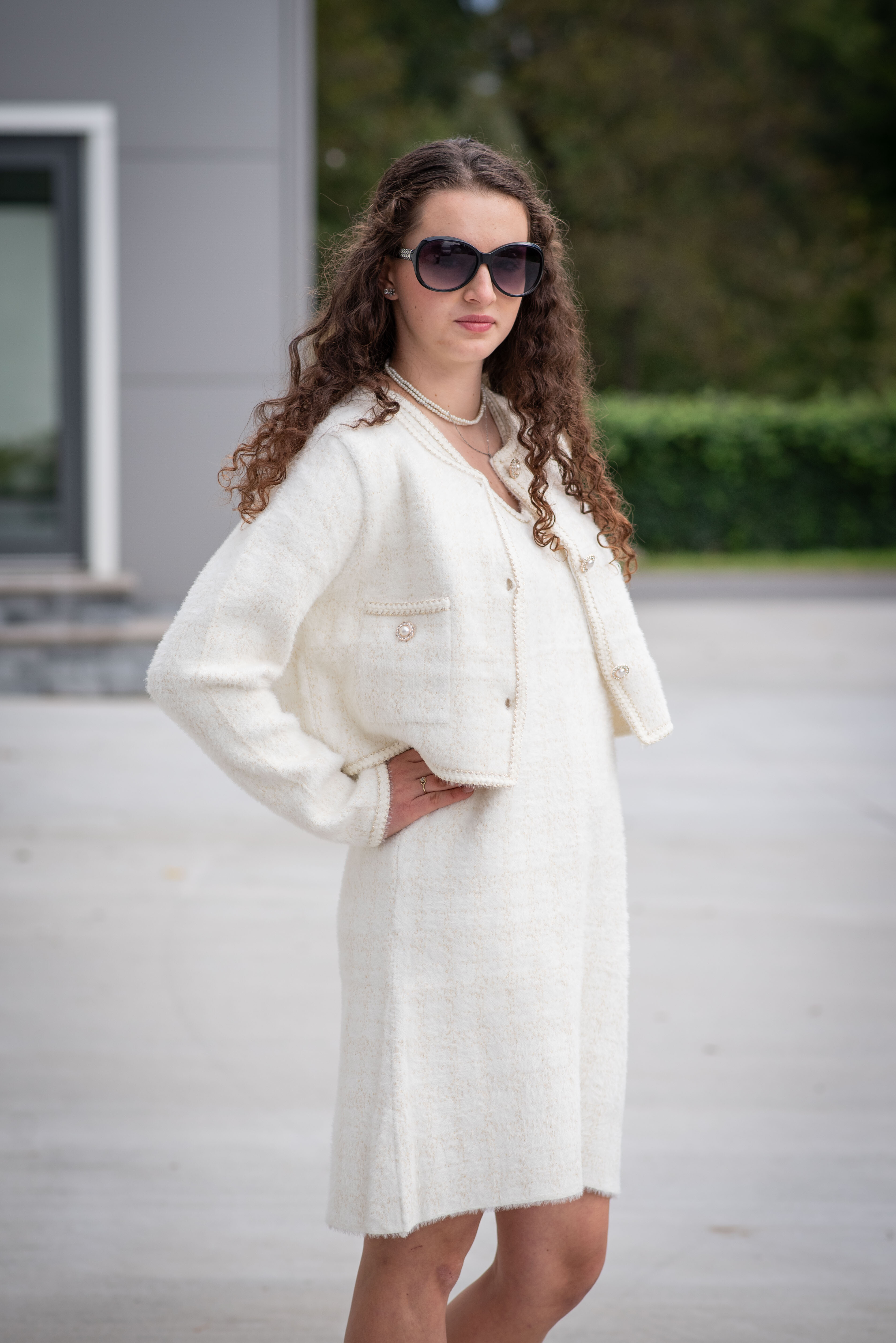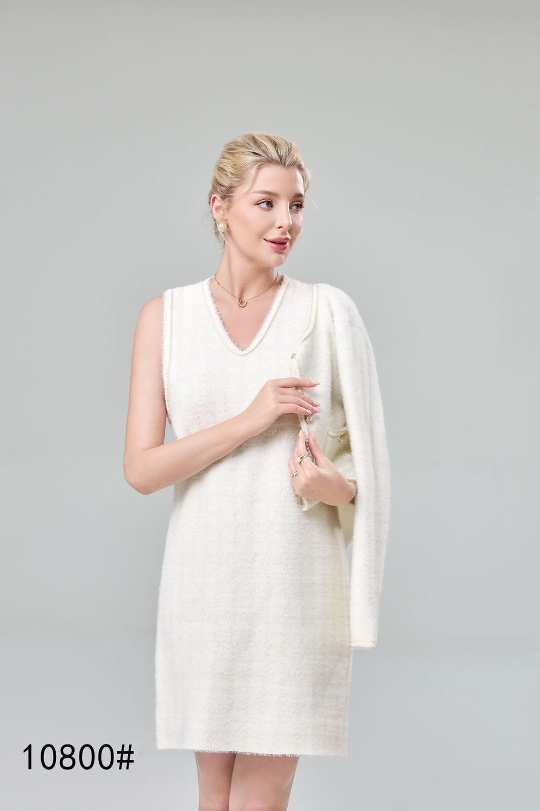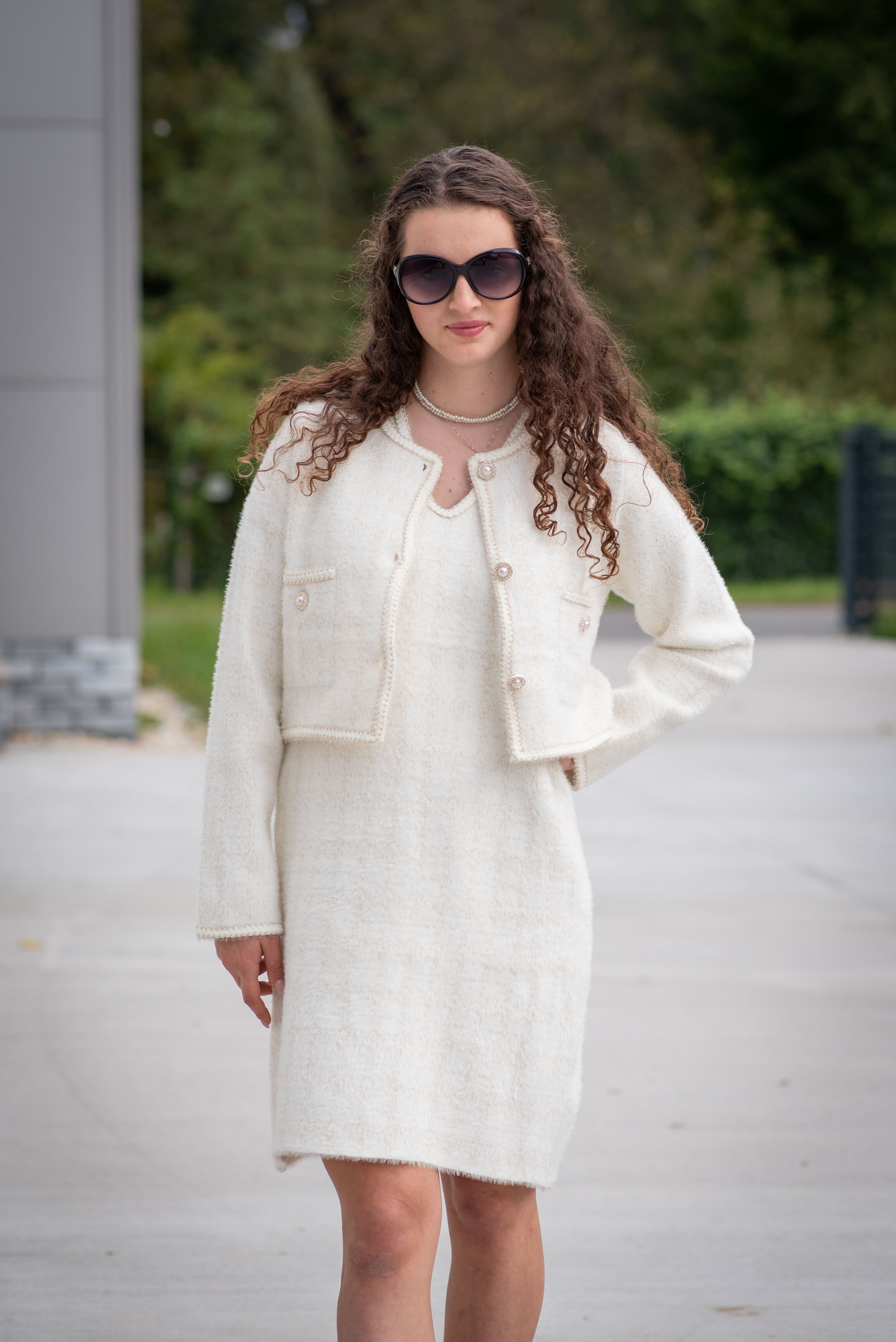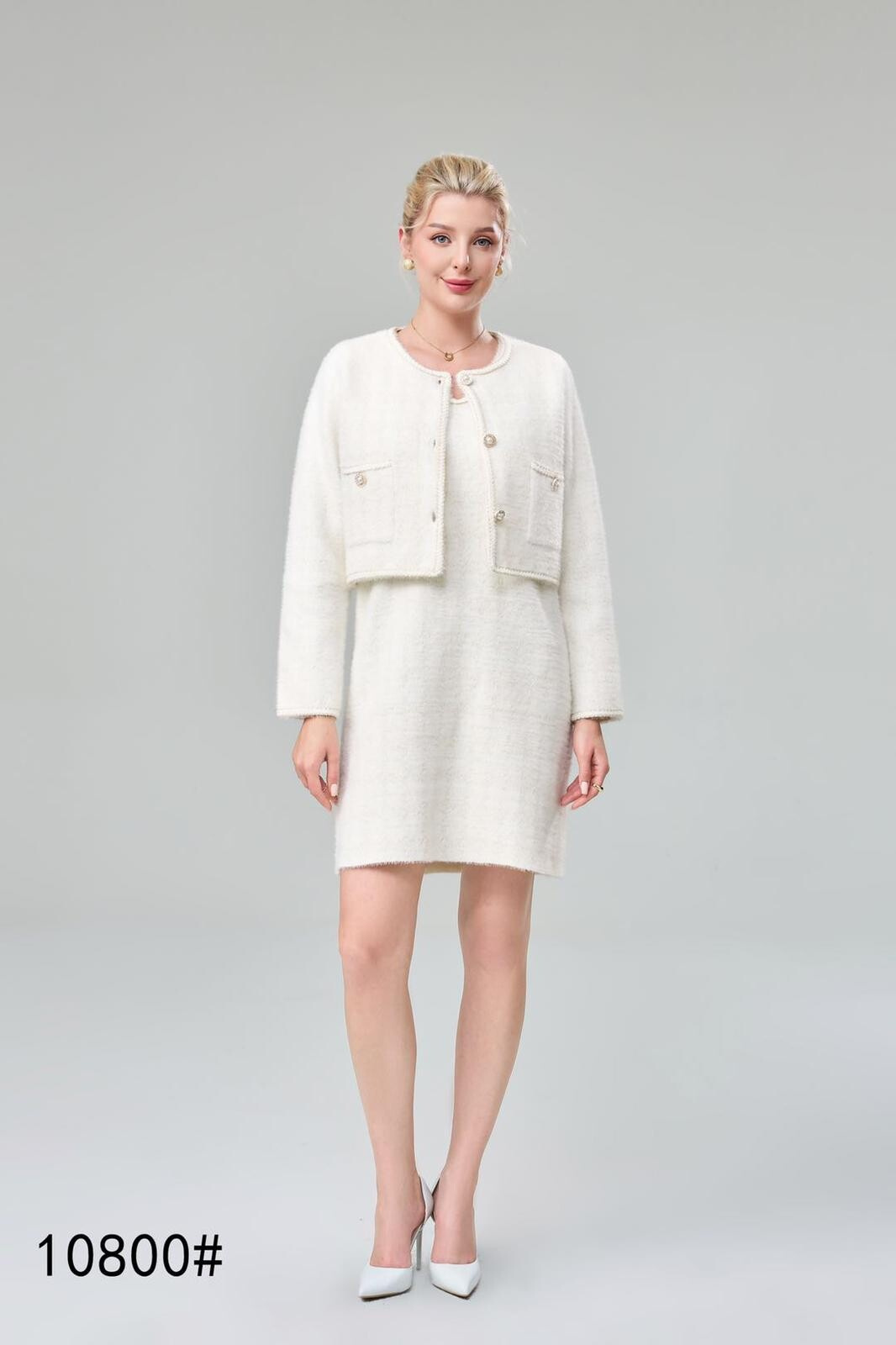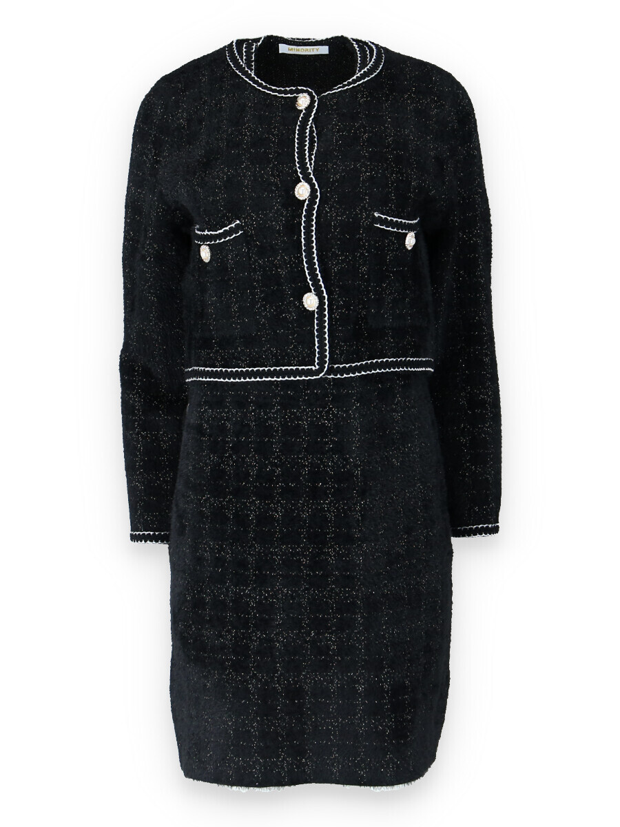Módní úpletový komplet šaty + propínací svetřík/sáčko (ala chanel)