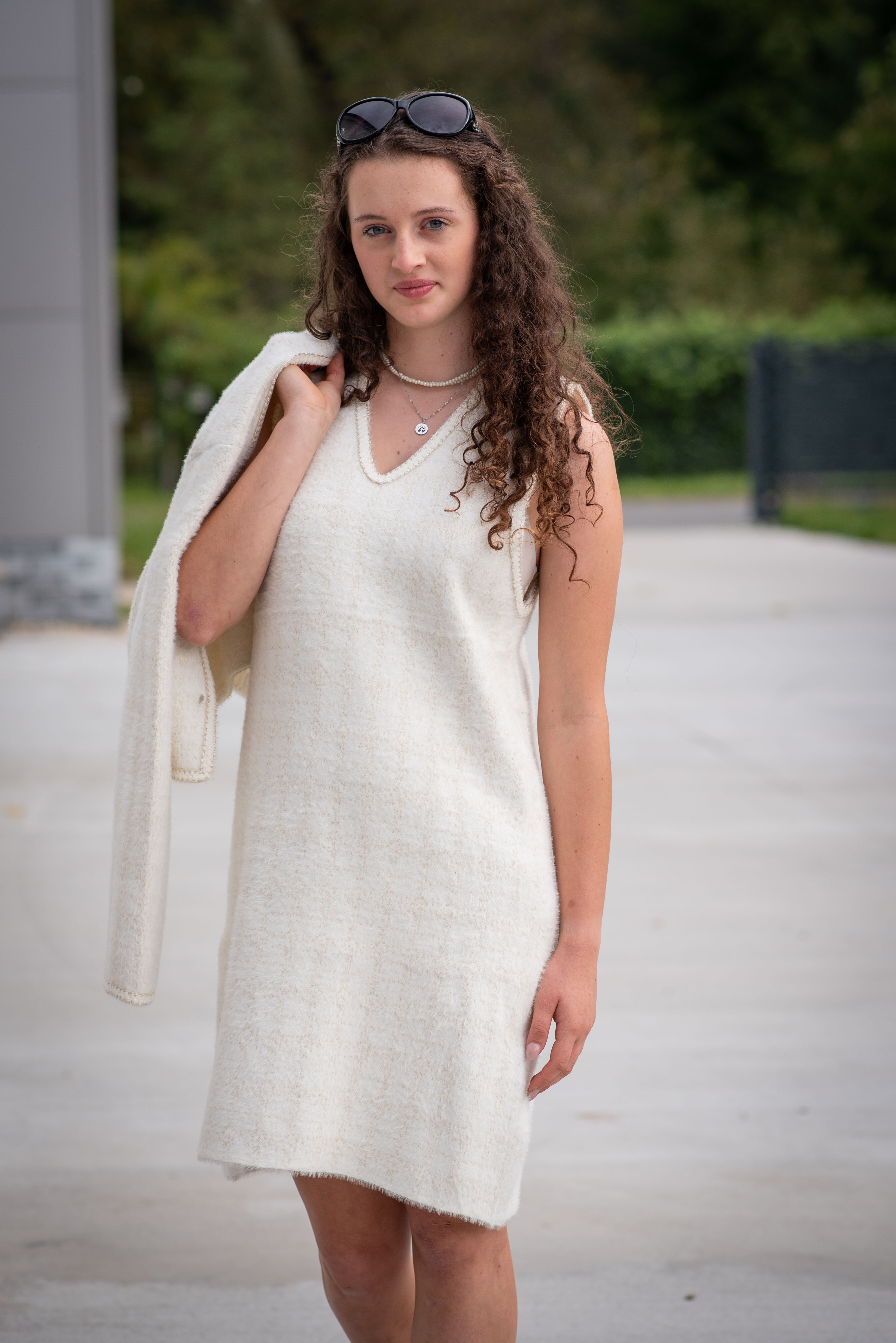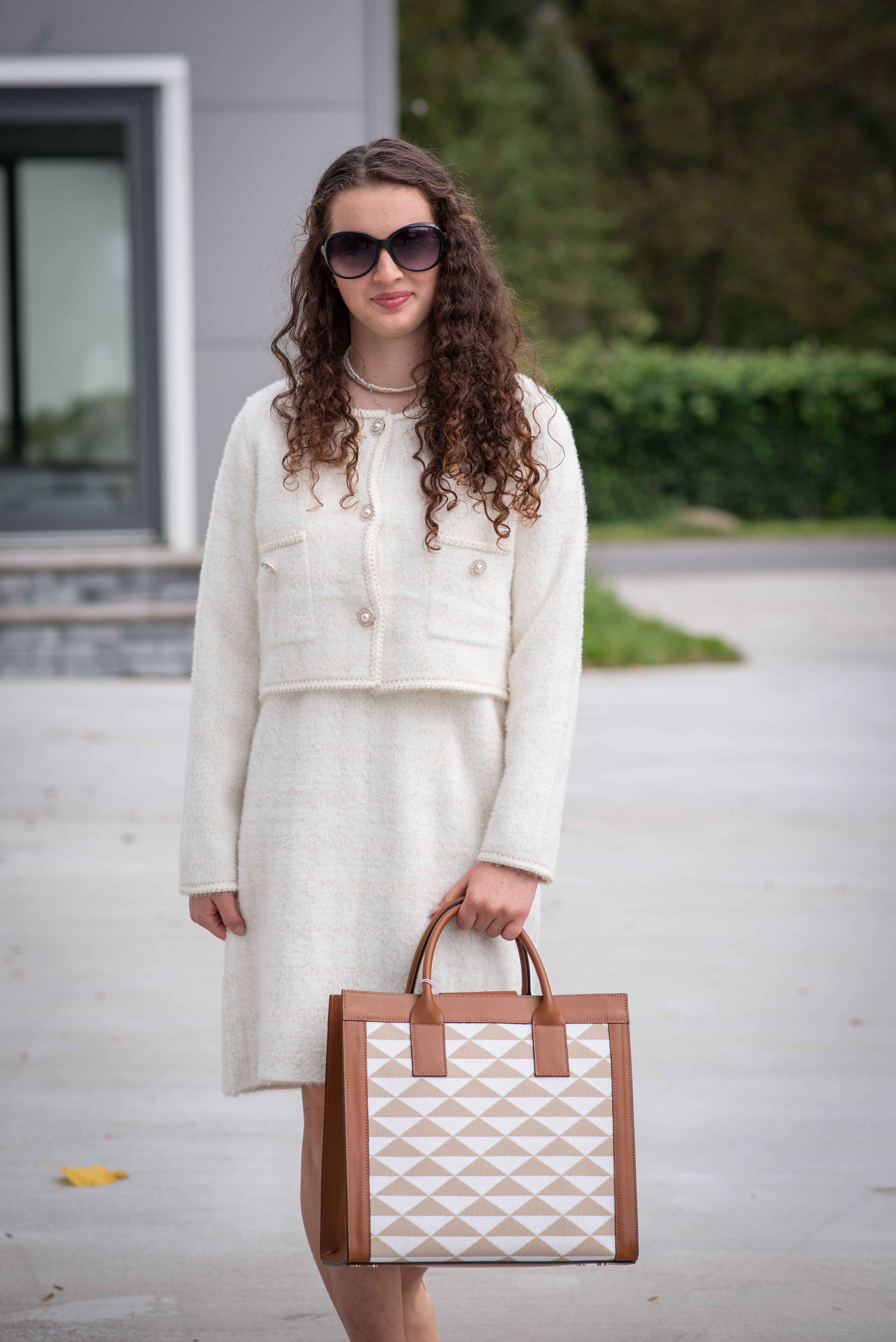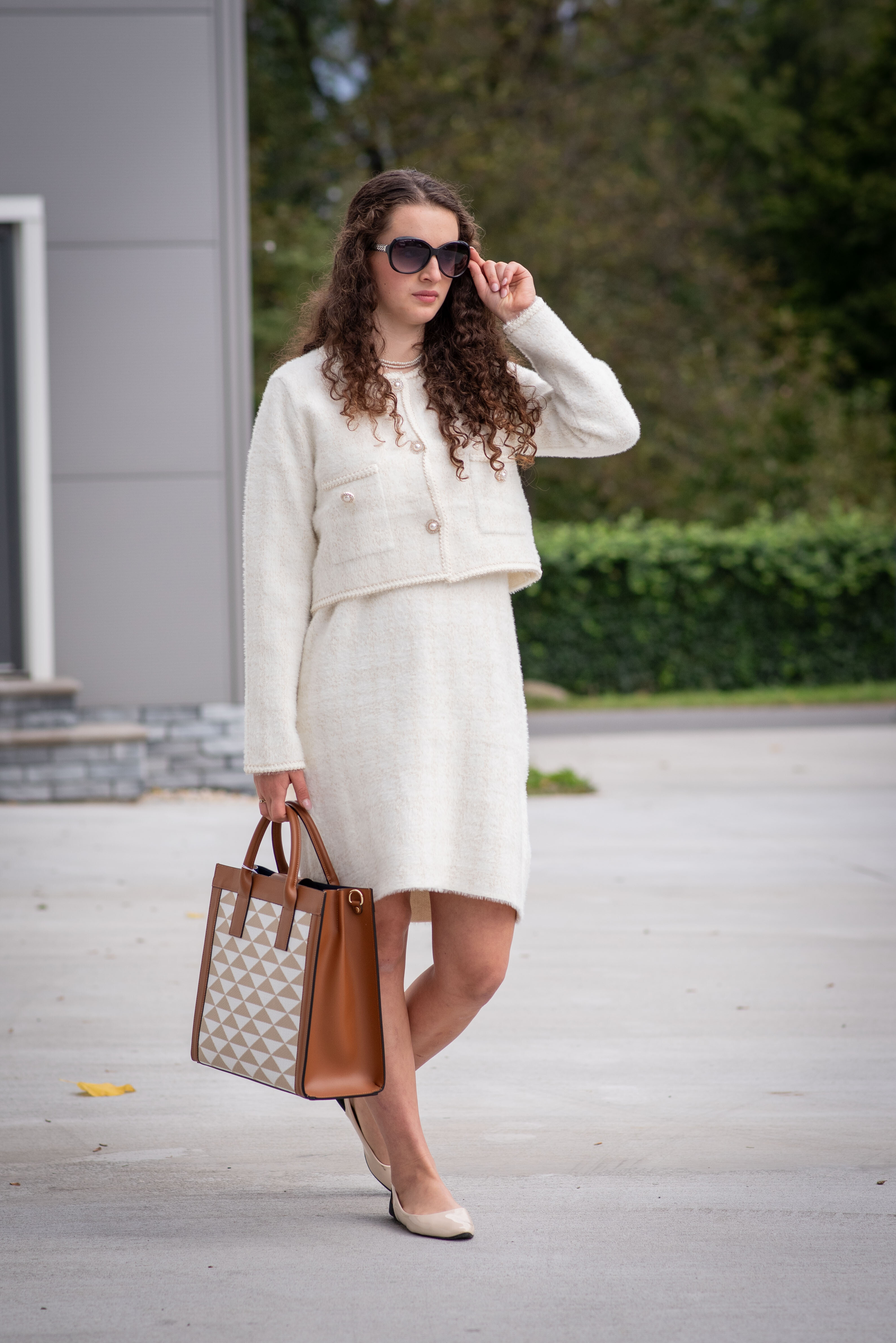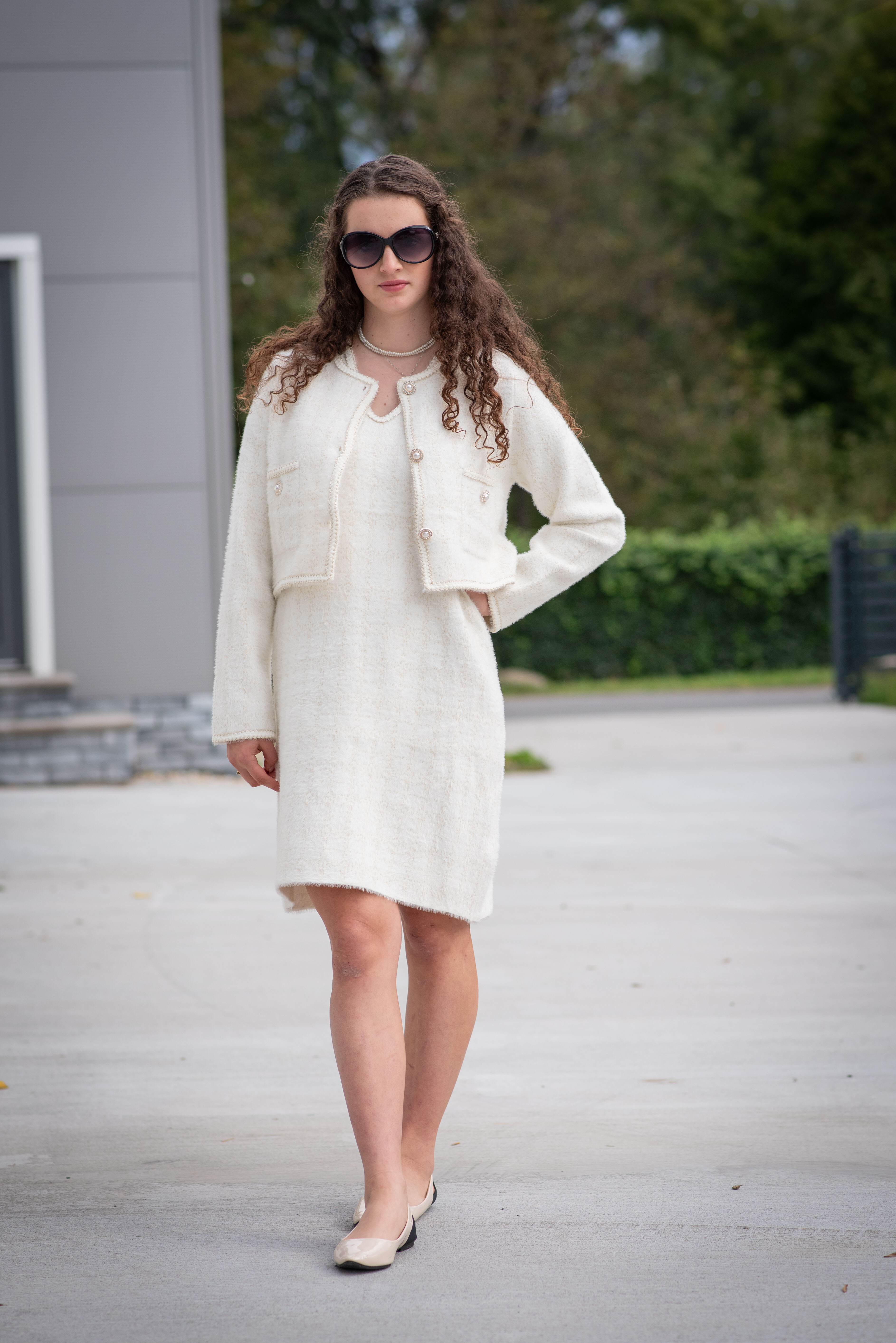 Módní úpletový komplet šaty + propínací svetřík/sáčko (ala chanel)