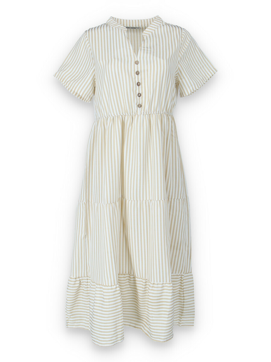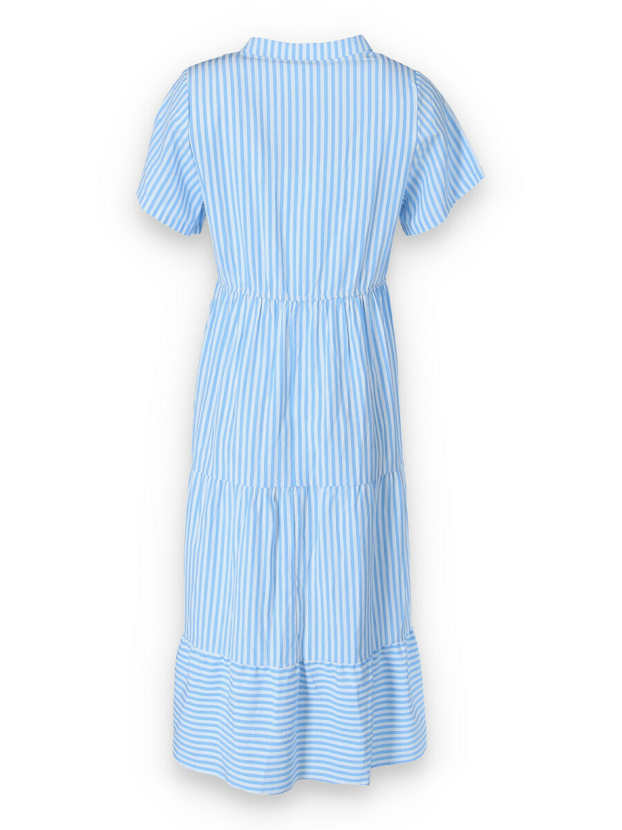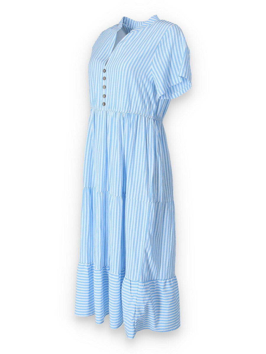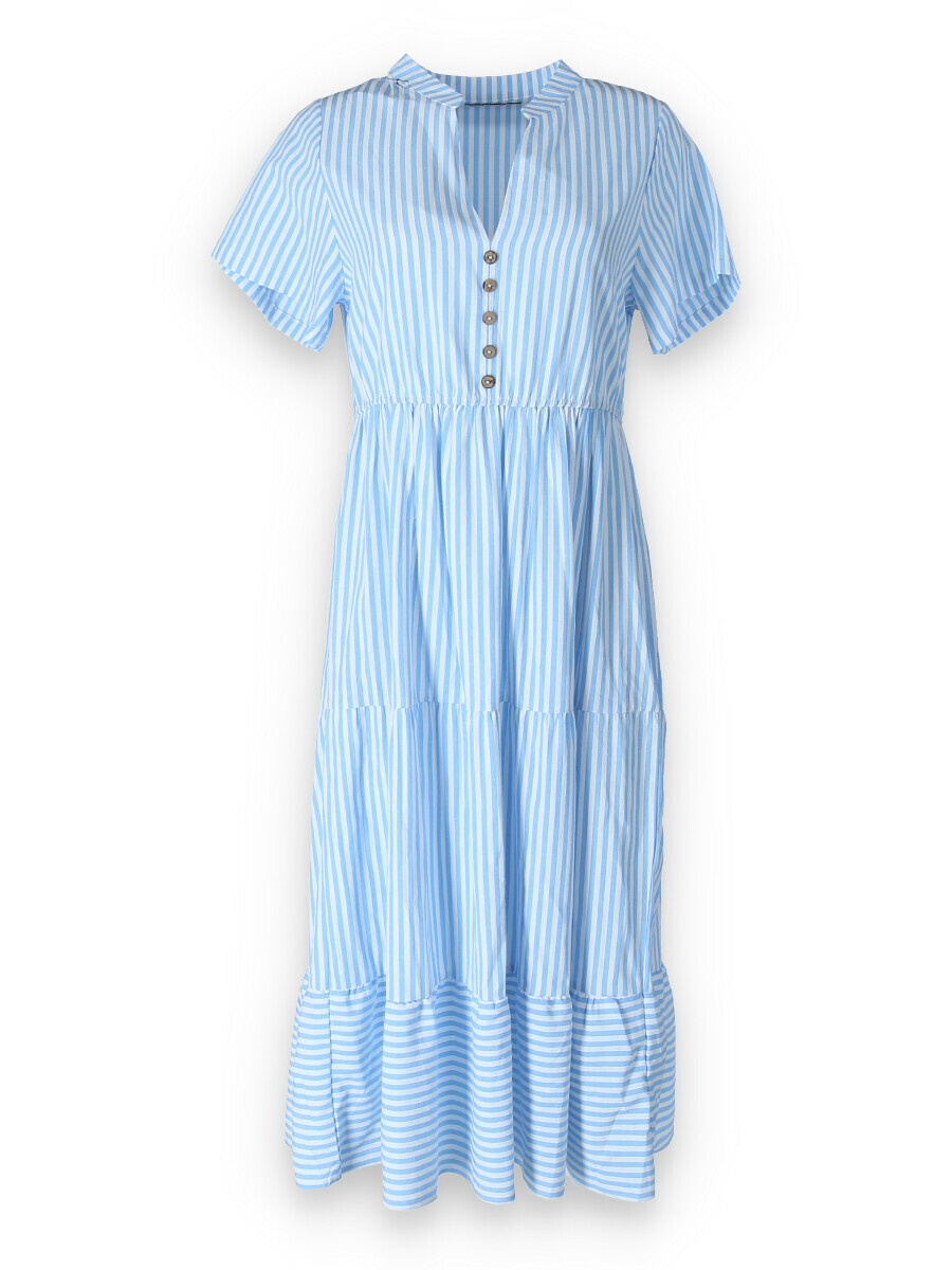 Letní pruhované šaty s krátkým rukávem, na přední straně doplněno o knoflíky v oblasti hrudníku. Šaty jsou volánové a v pase na gumu.