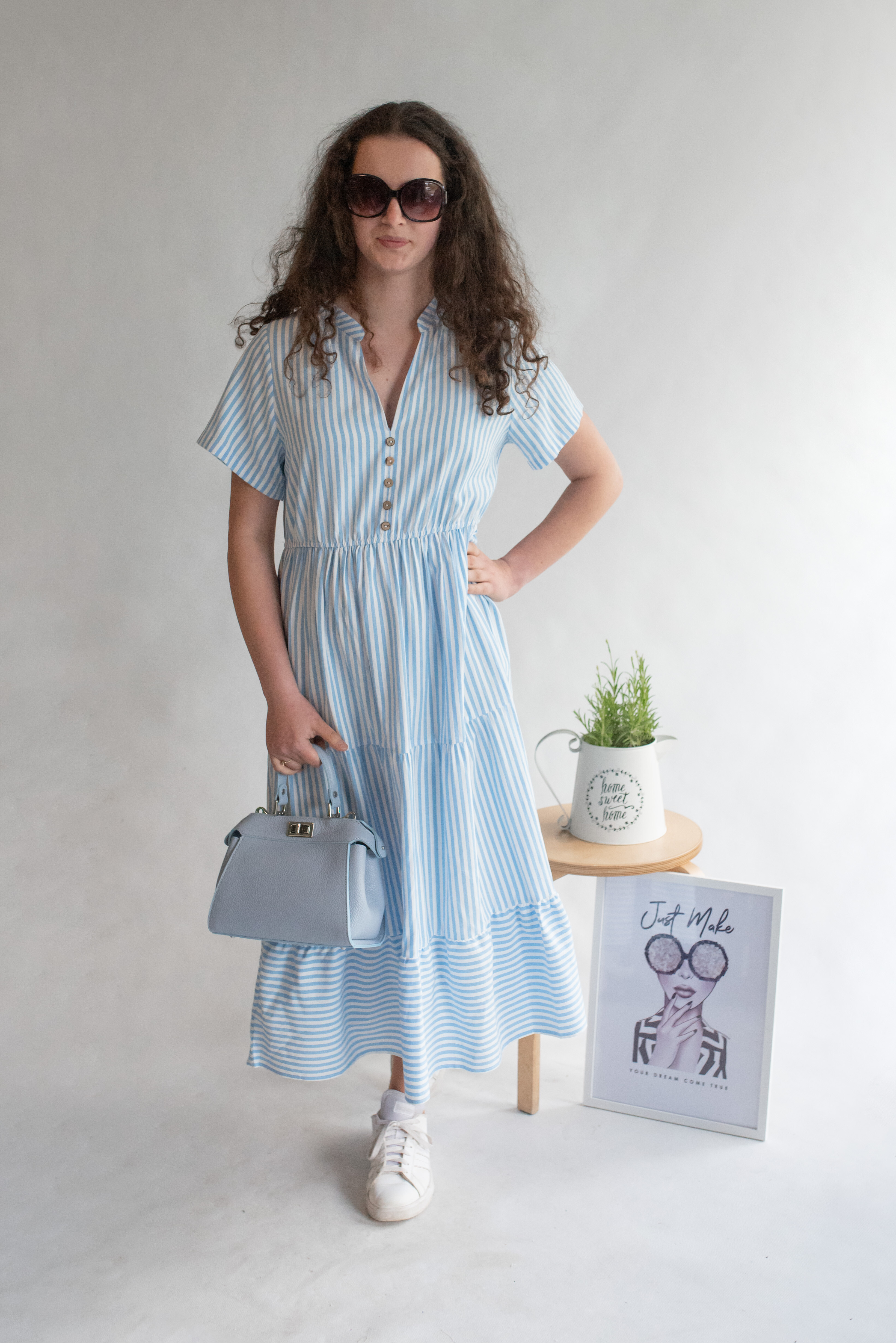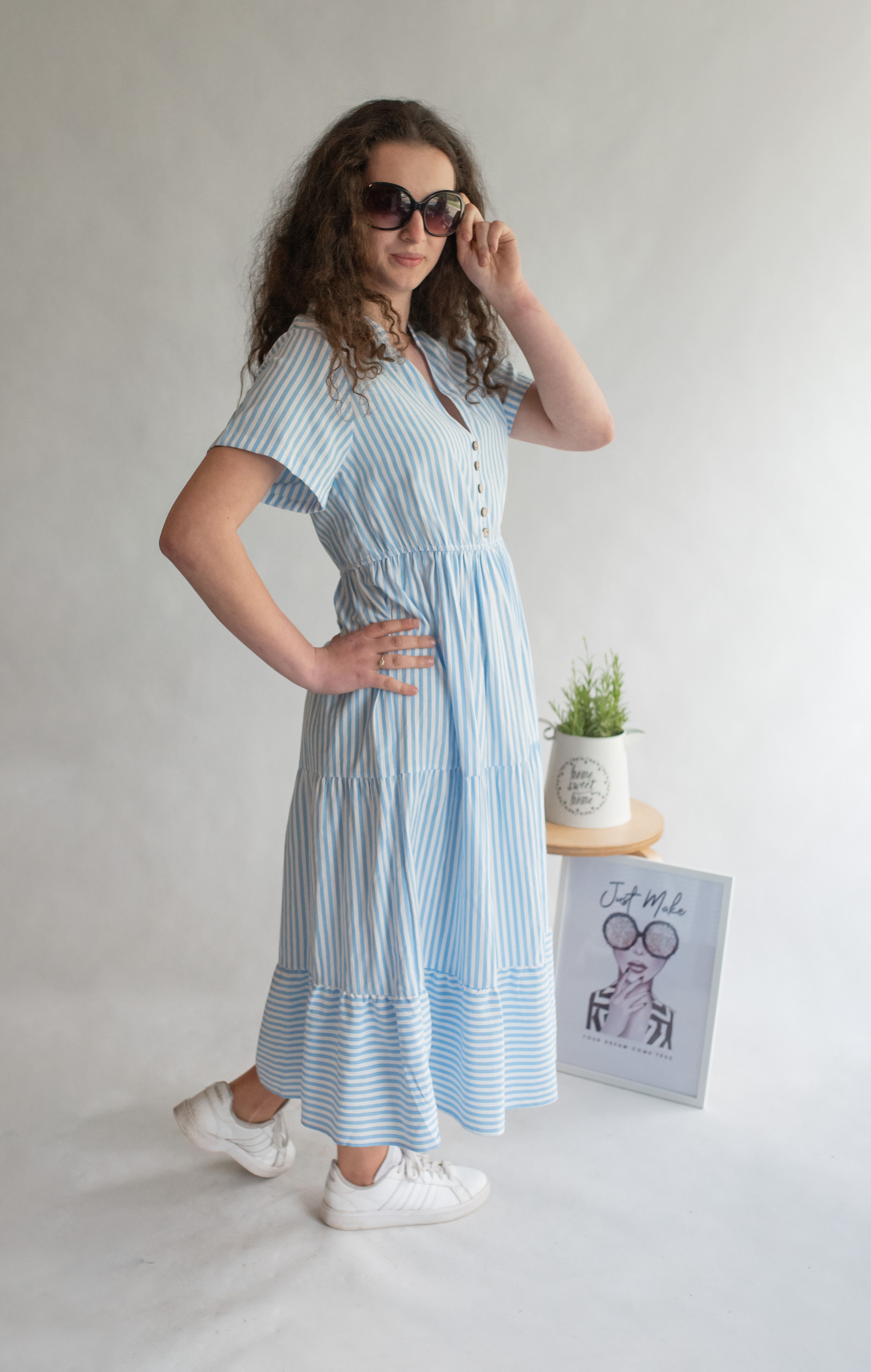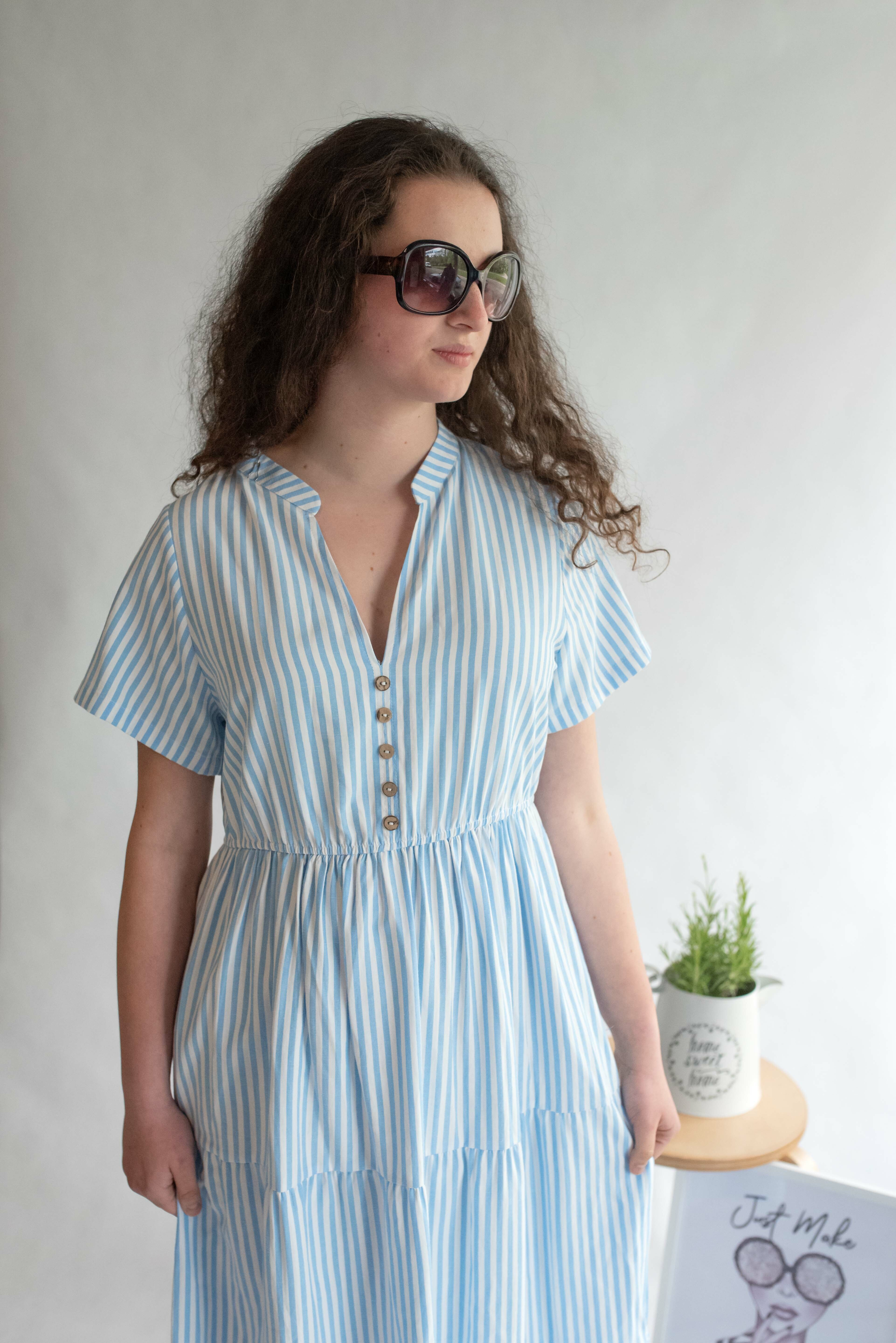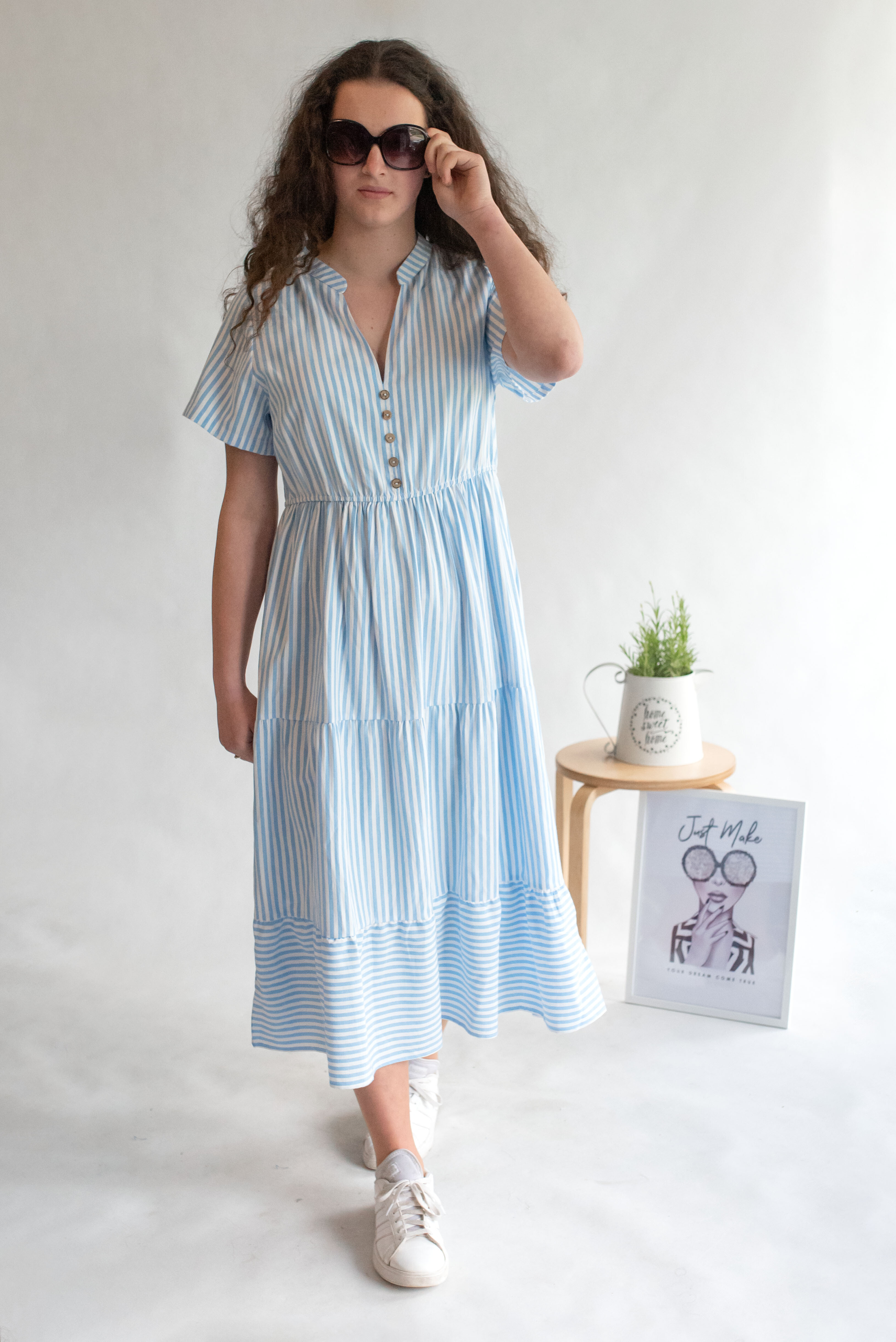 Letní pruhované šaty s krátkým rukávem, na přední straně doplněno o knoflíky v oblasti hrudníku. Šaty jsou volánové a v pase na gumu.