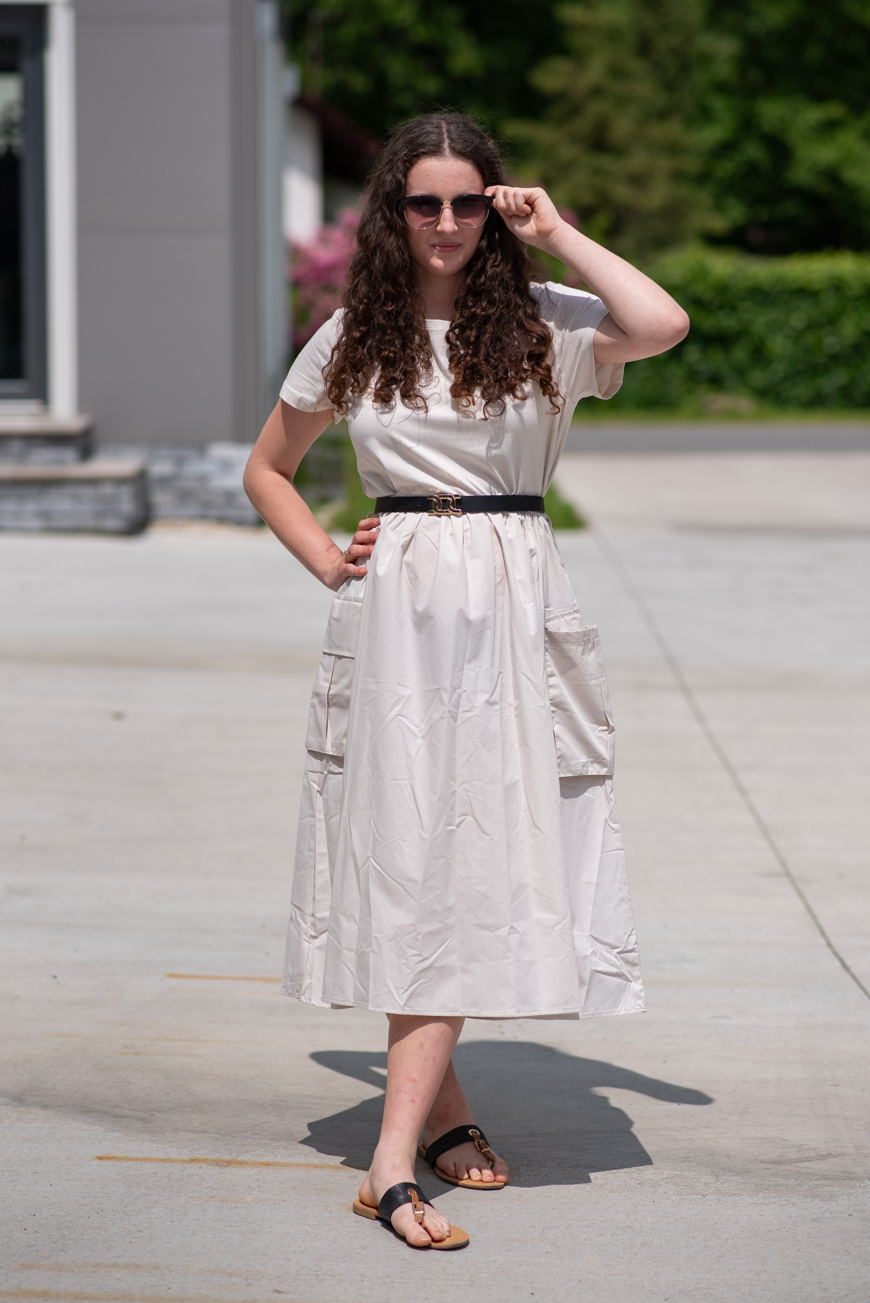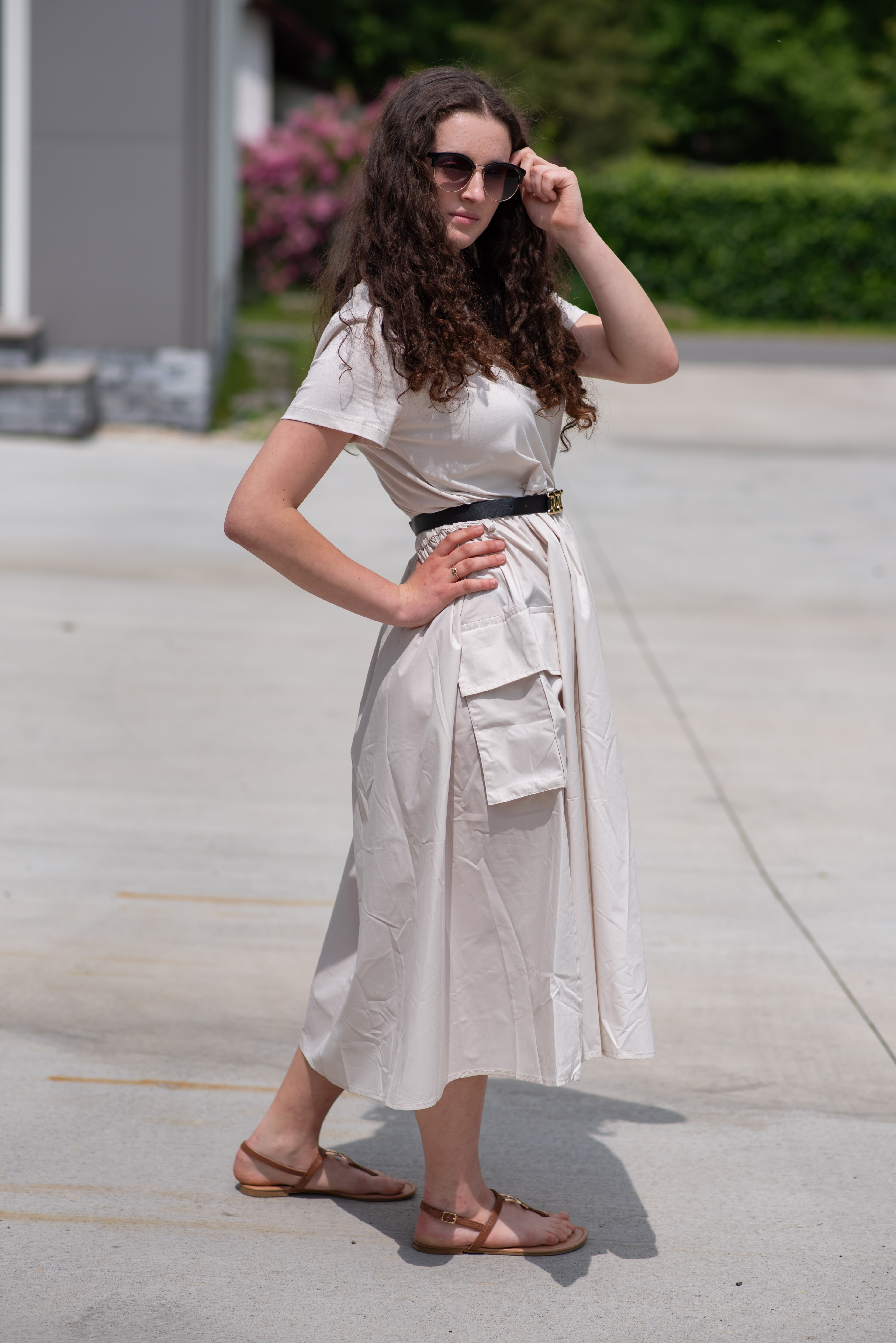 Trendy šaty s krátkým rukávem, doplněné páskem. Ve spodní části našité kapsy.