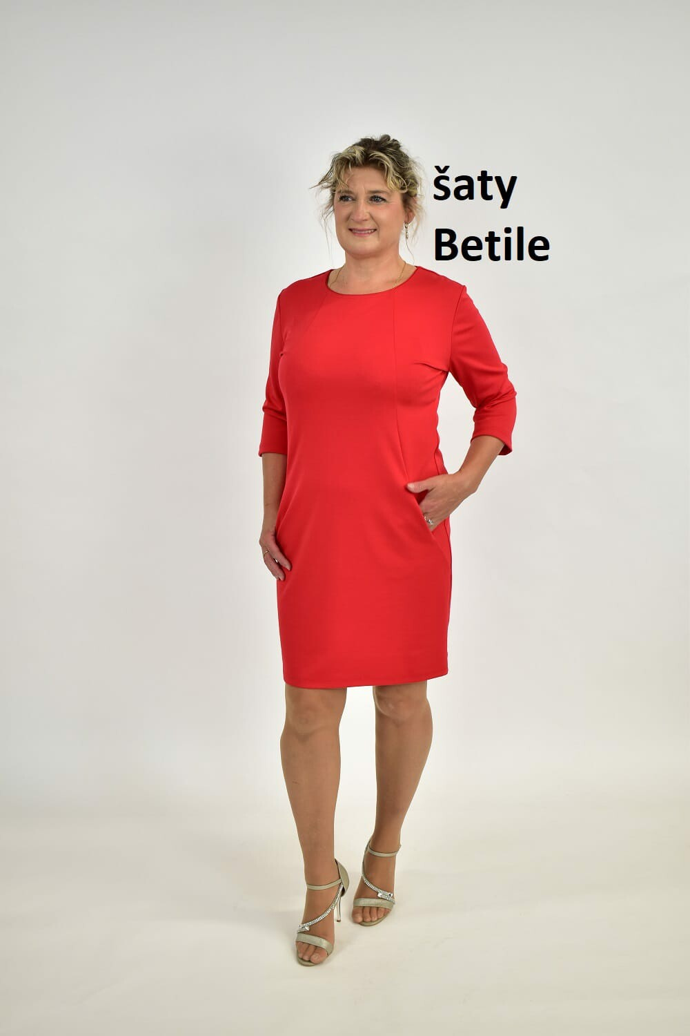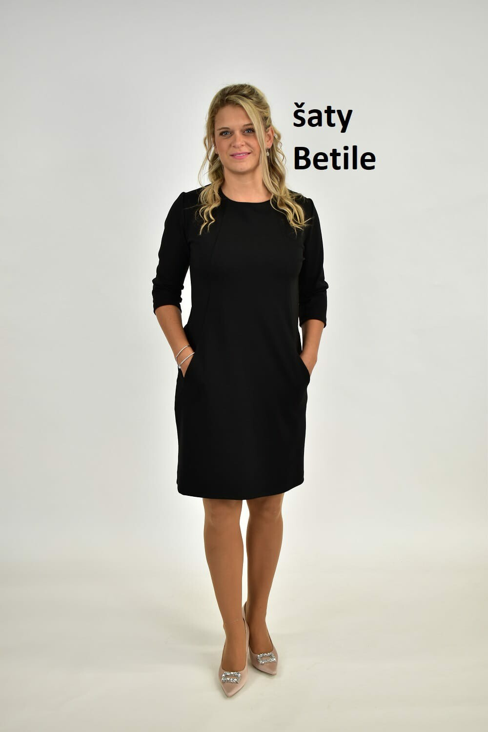 Denní šaty s 3/4 rukávem a elegantními kasami po stranách.