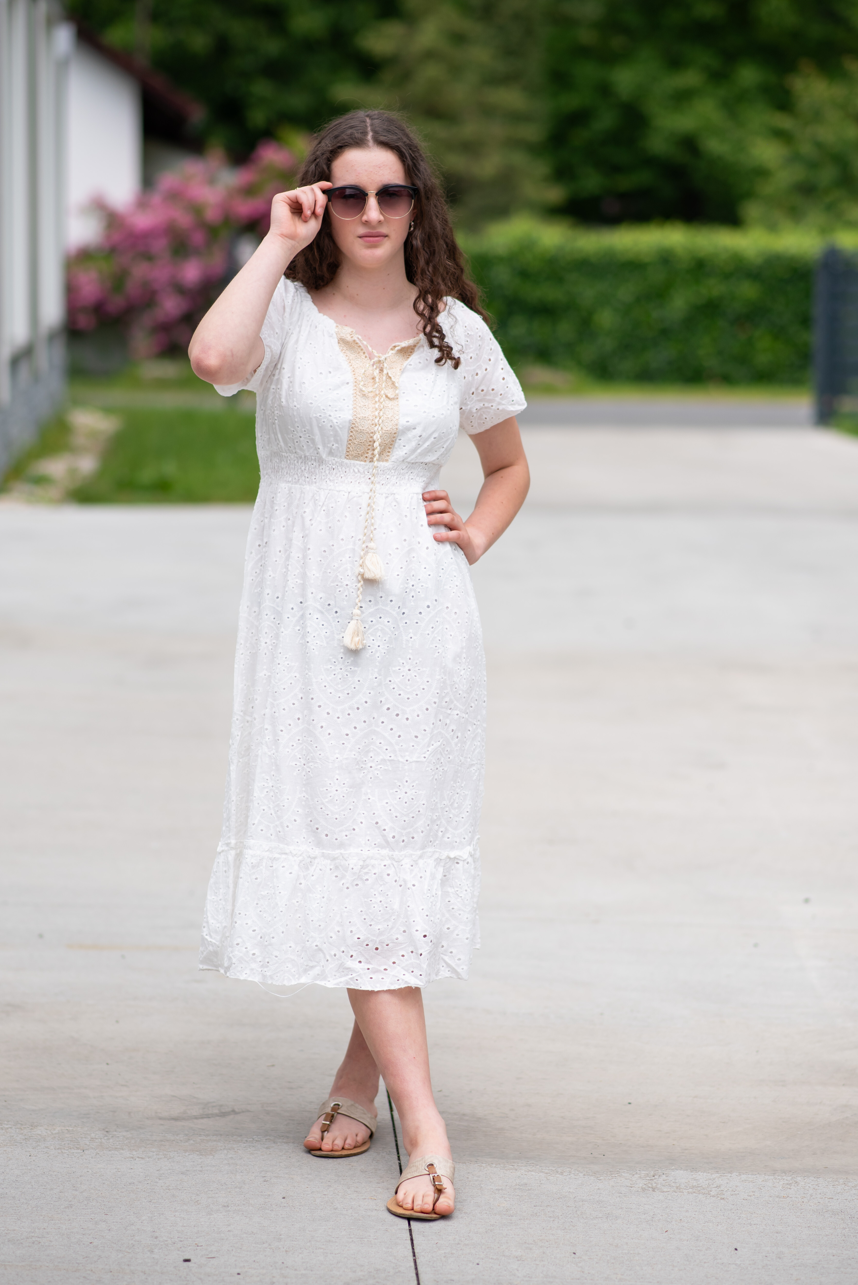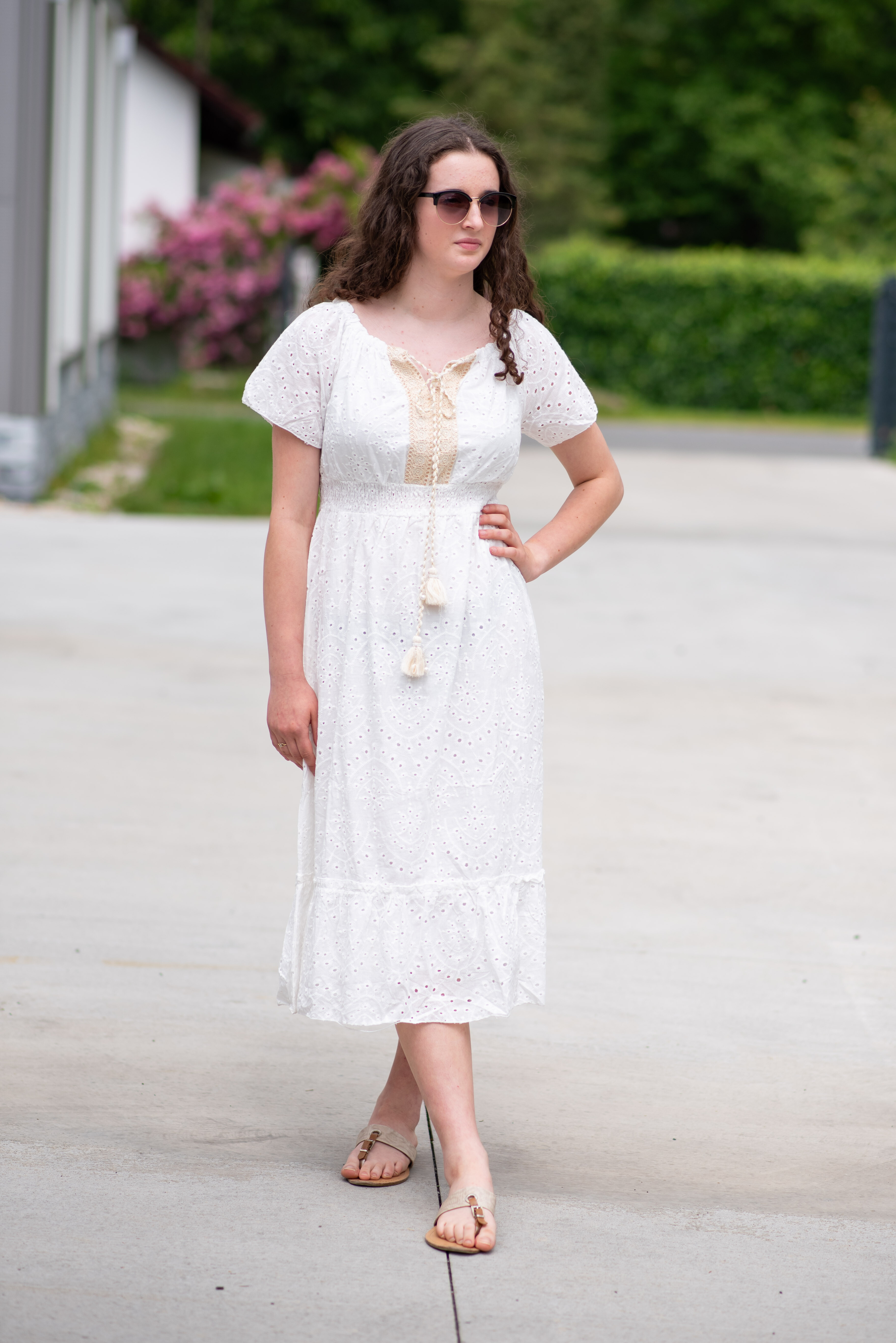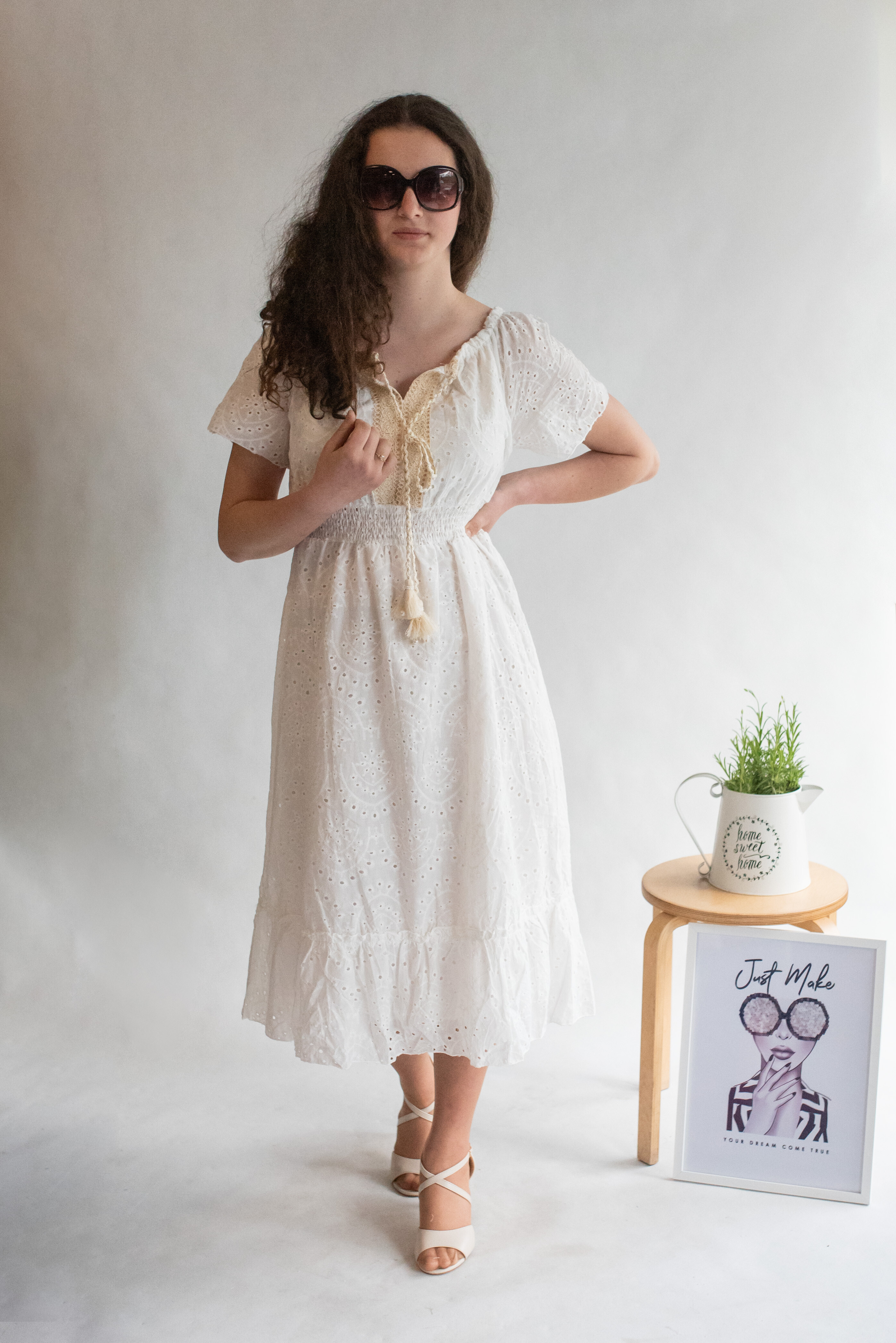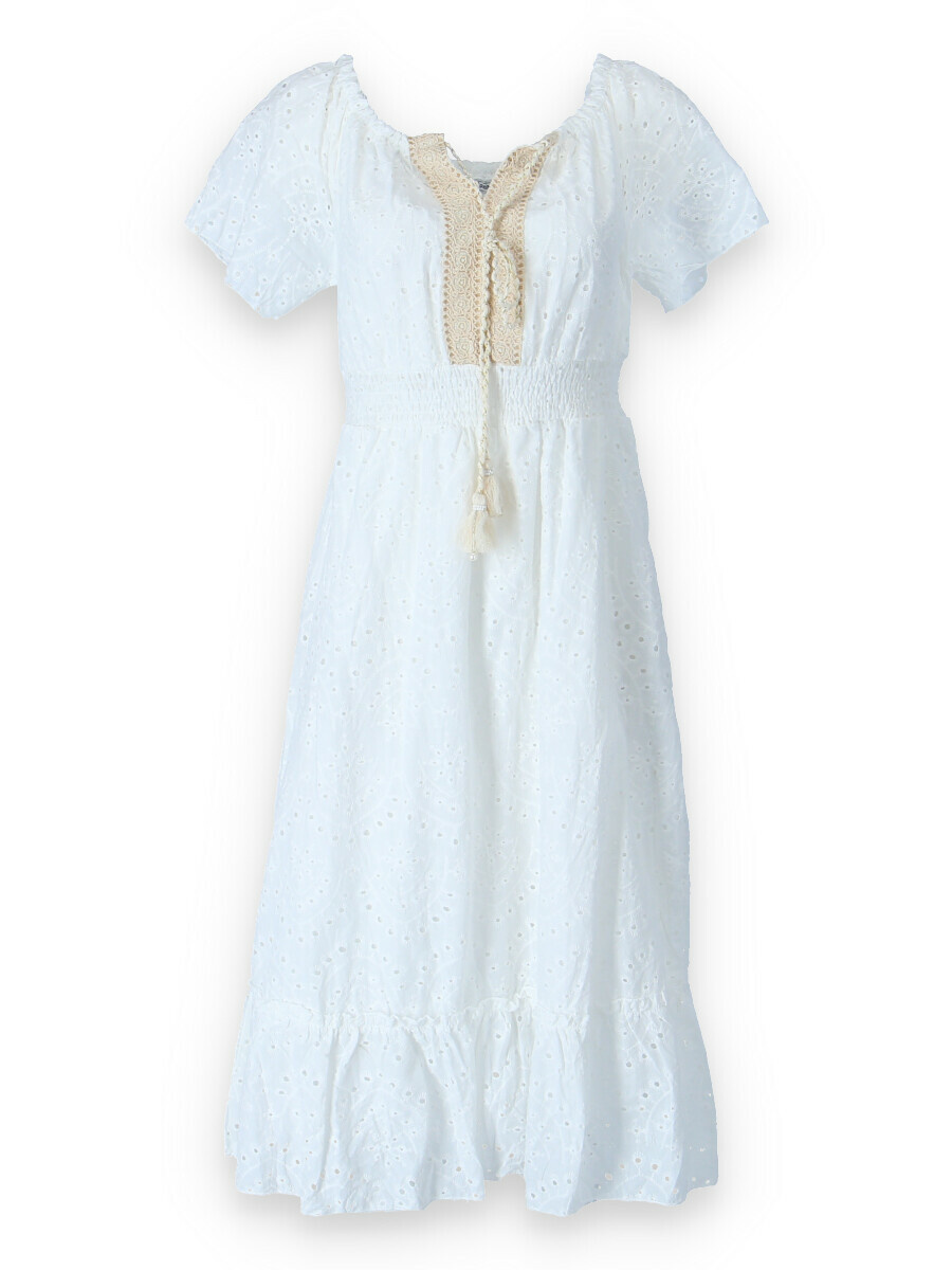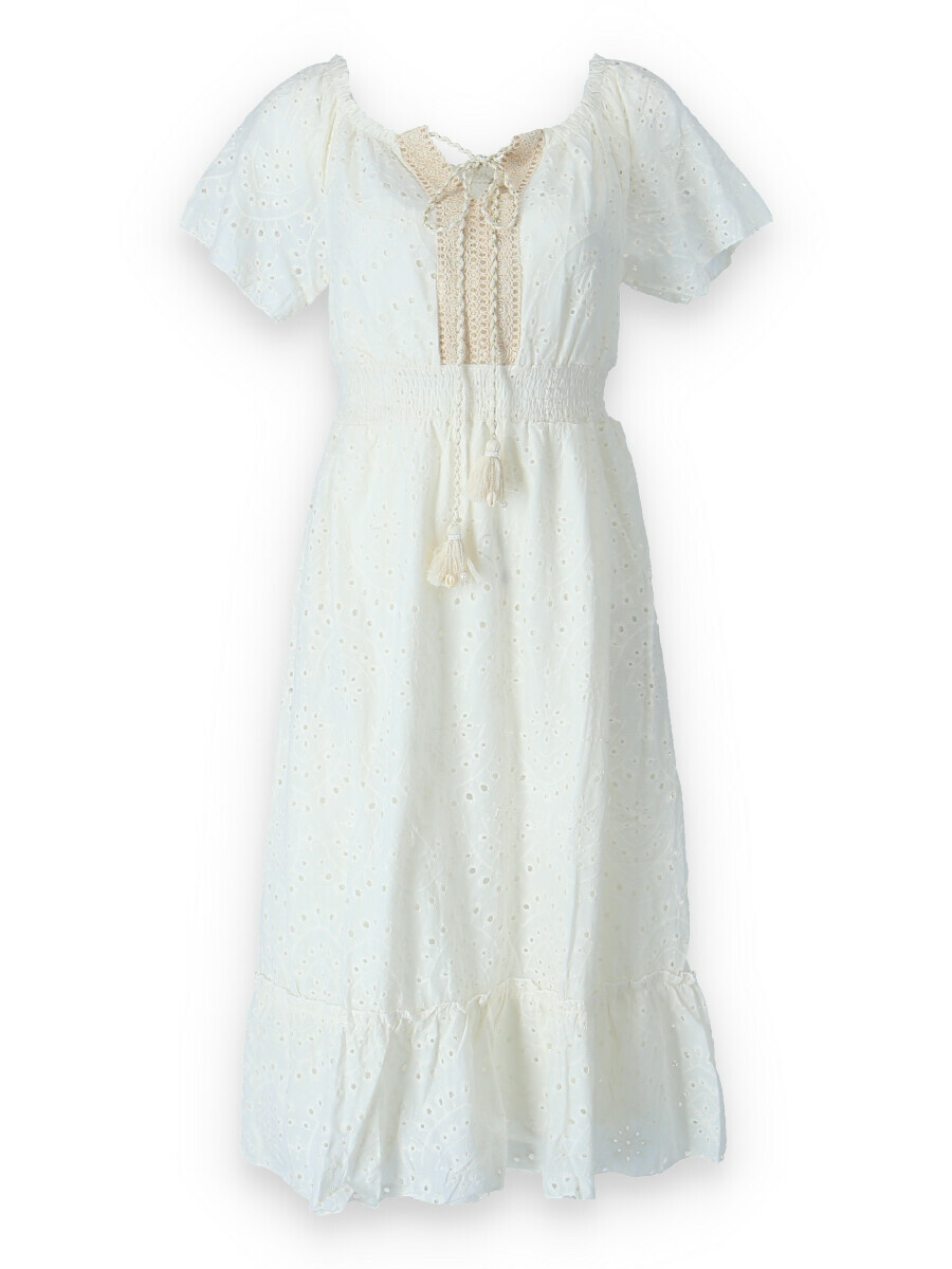 Dlouhé šaty s krátkým rukávem MADEIRA, na přední straně vázání ve výstřihu. Dlouhé letní šaty romantického stylu, s madeirovou krajkou, v pase do gumy a zakončeny jsou volánem ve spodní části.
