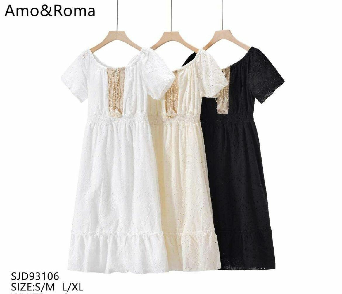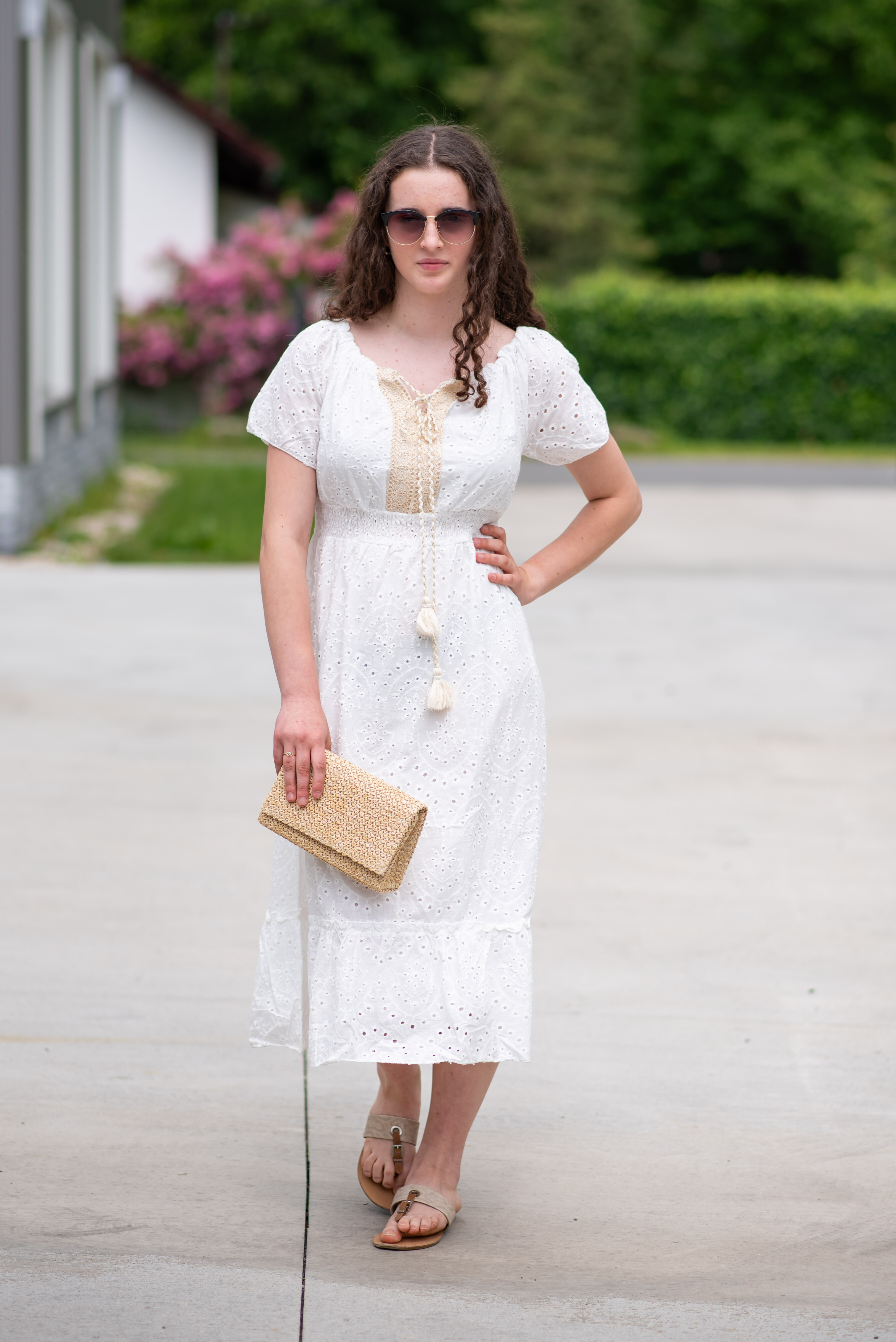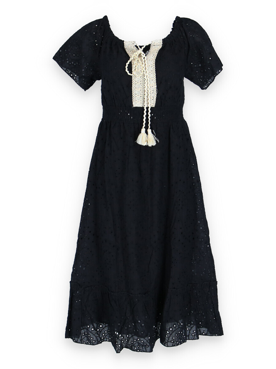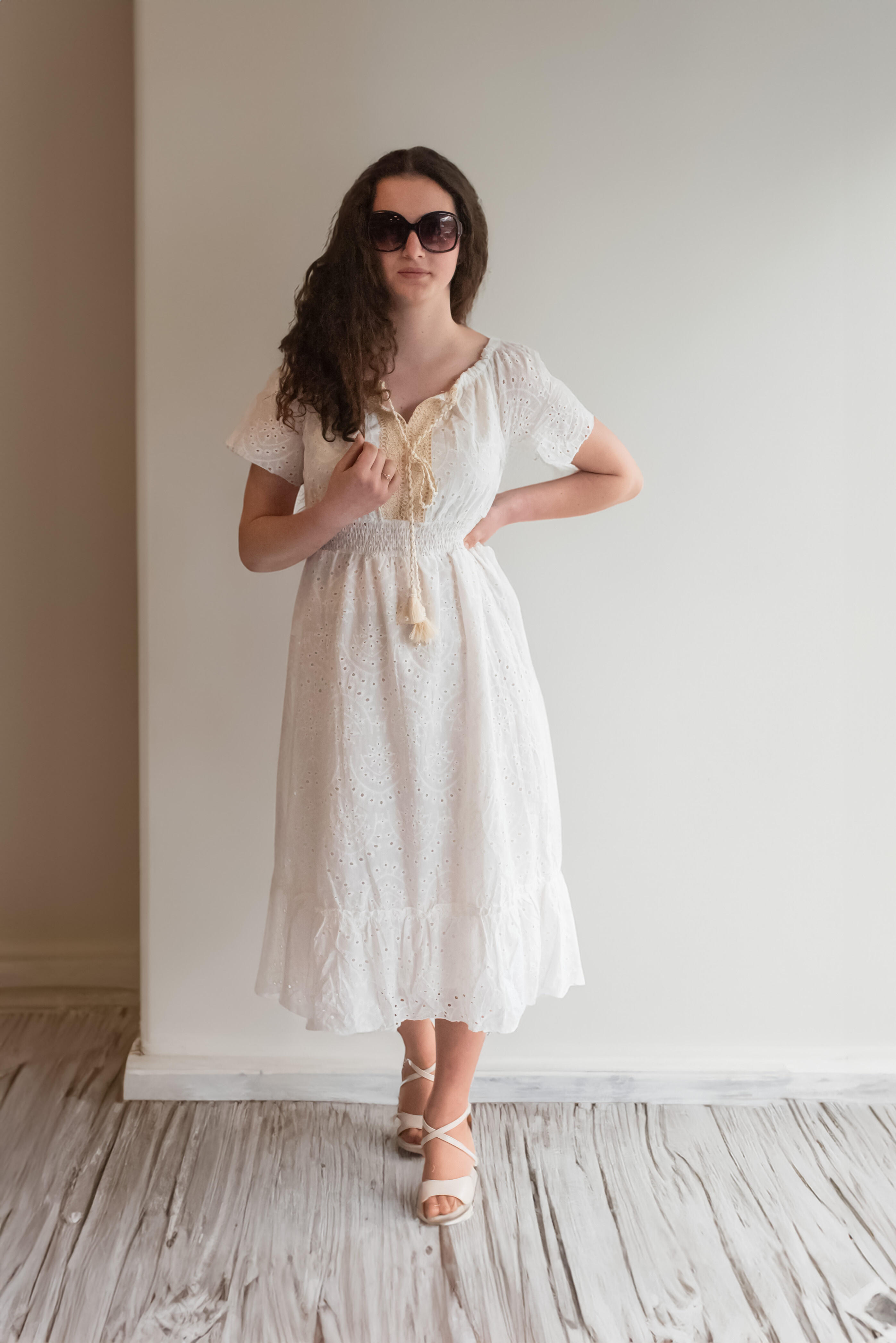 Dlouhé šaty s krátkým rukávem MADEIRA, na přední straně vázání ve výstřihu. Dlouhé letní šaty romantického stylu, s madeirovou krajkou, v pase do gumy a zakončeny jsou volánem ve spodní části.