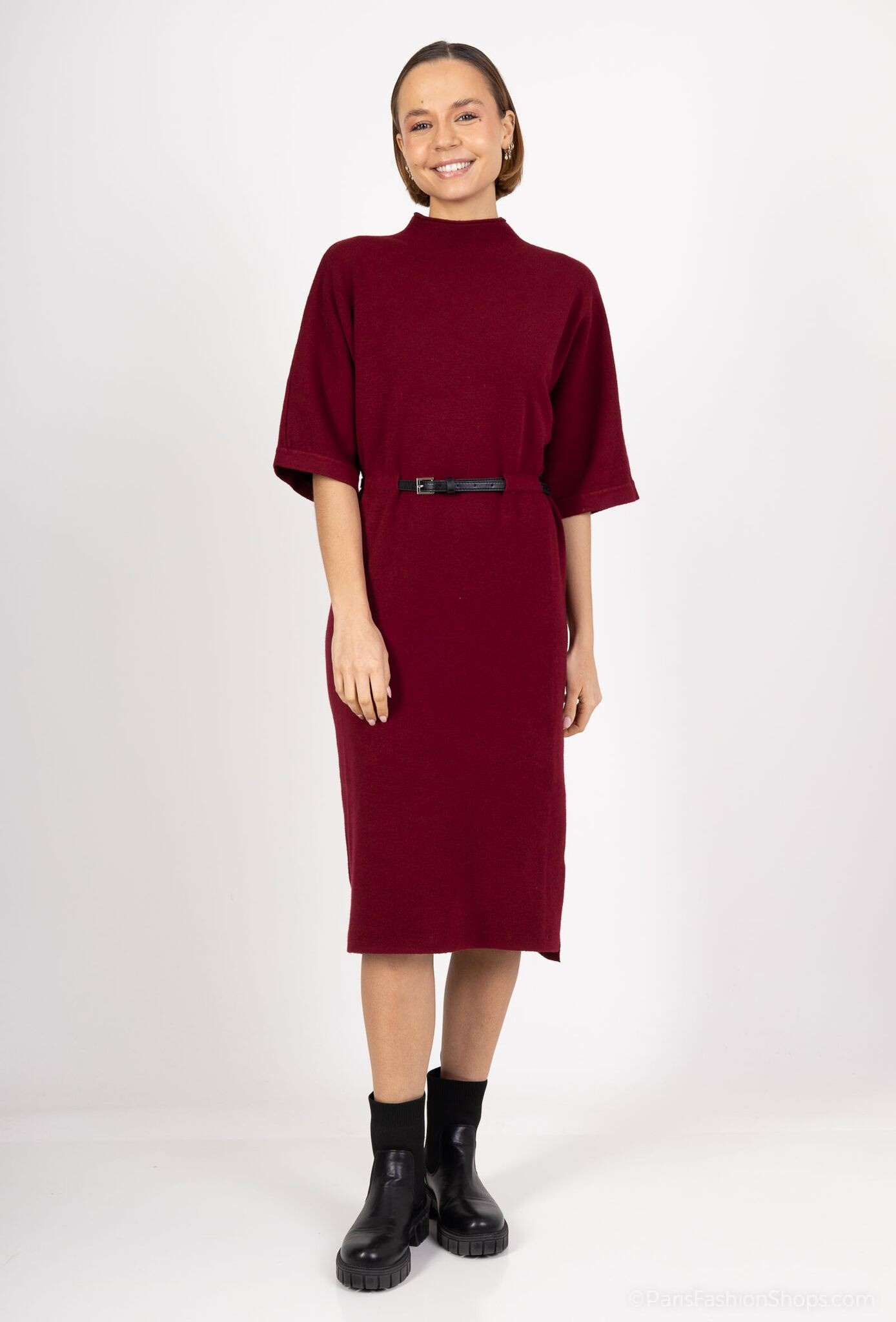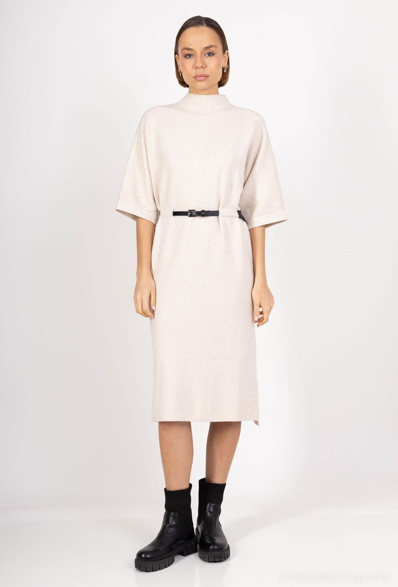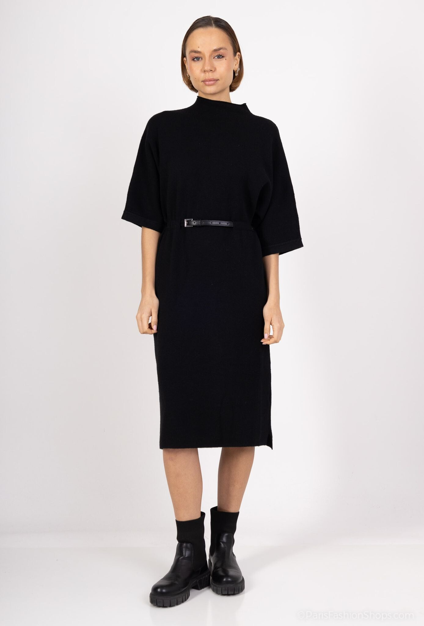 Elegantní šaty úpletové s krátkým rukávem. Šaty jsou v MIDI délce, doplněny syntetickým černým páskem.