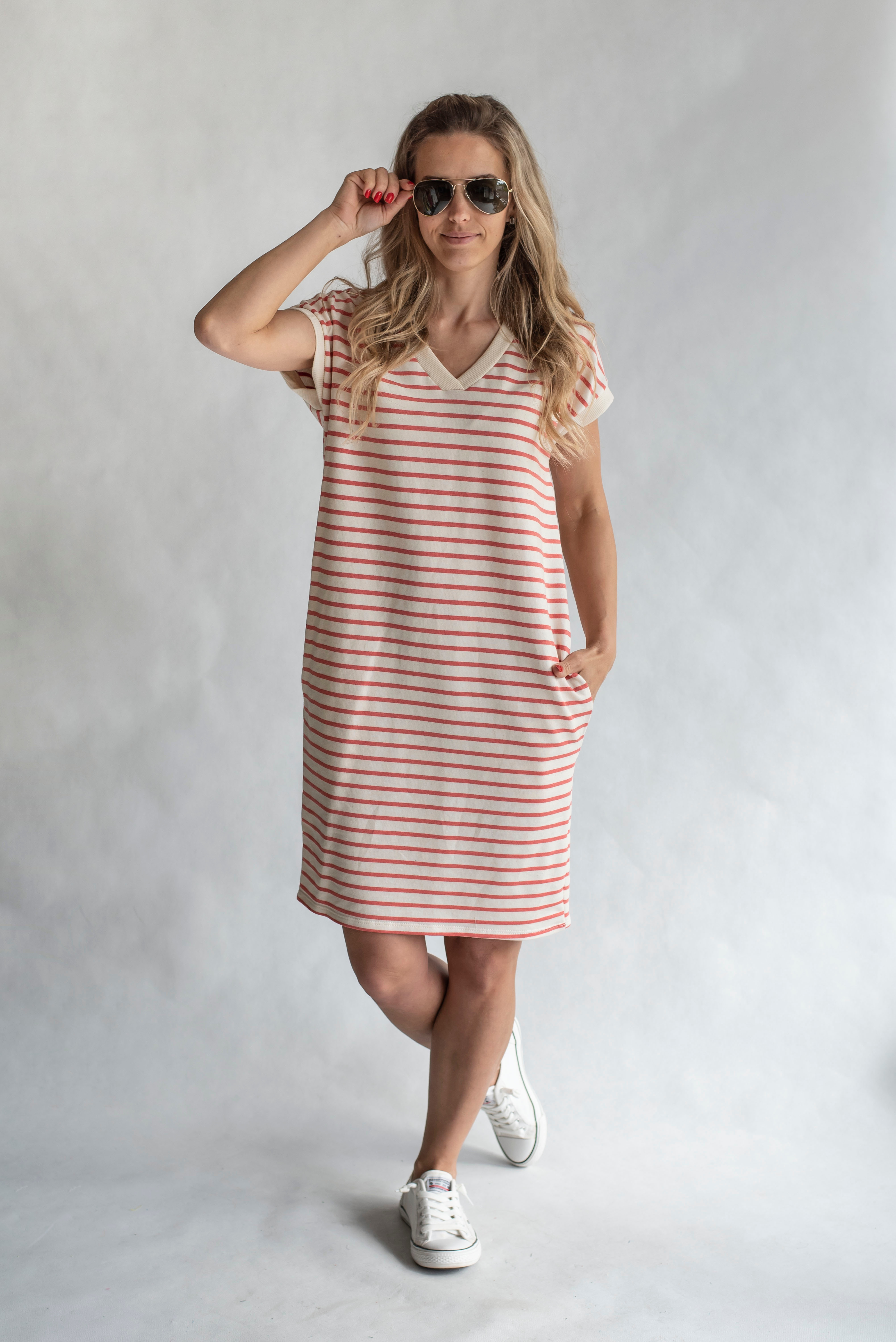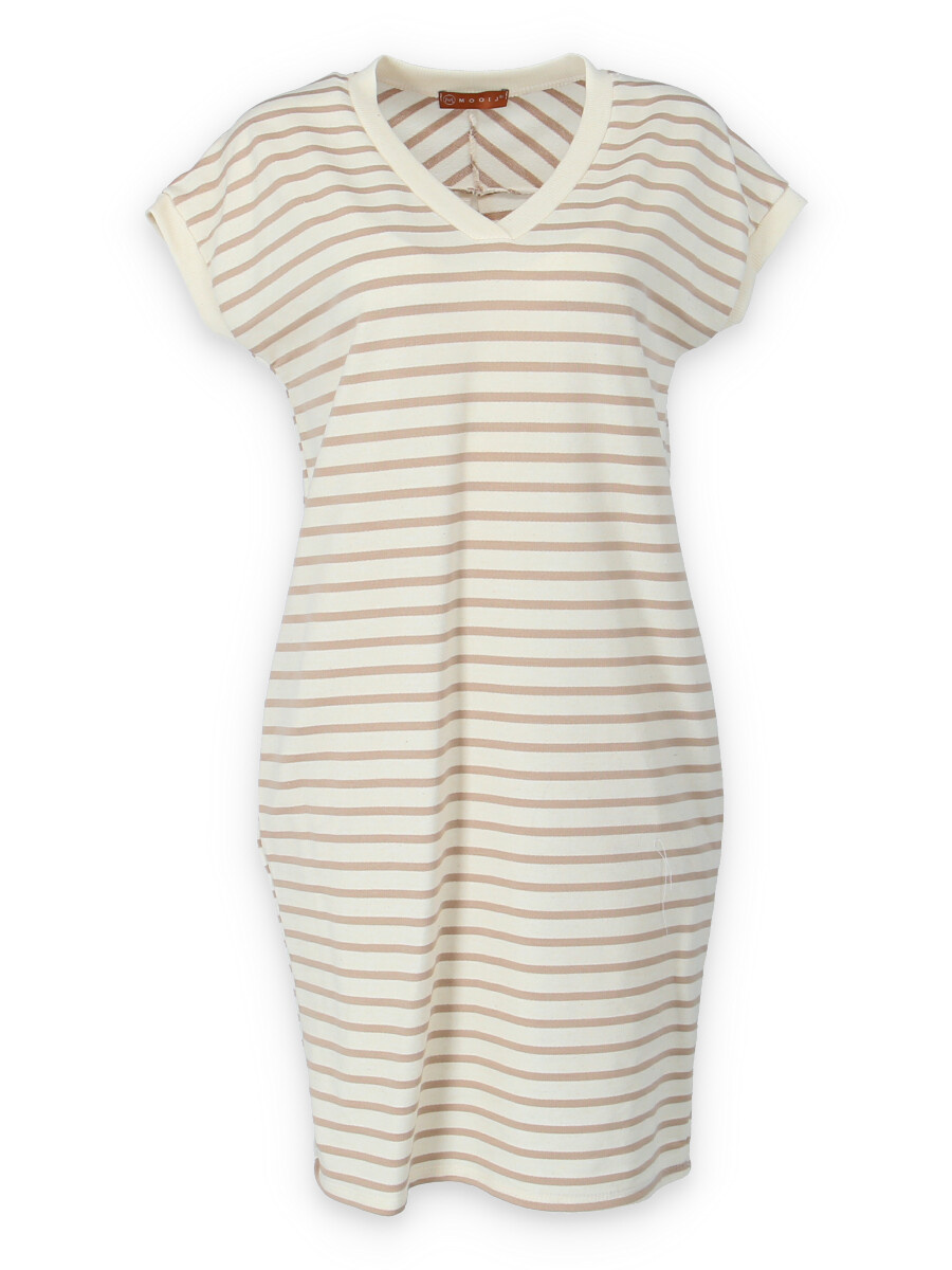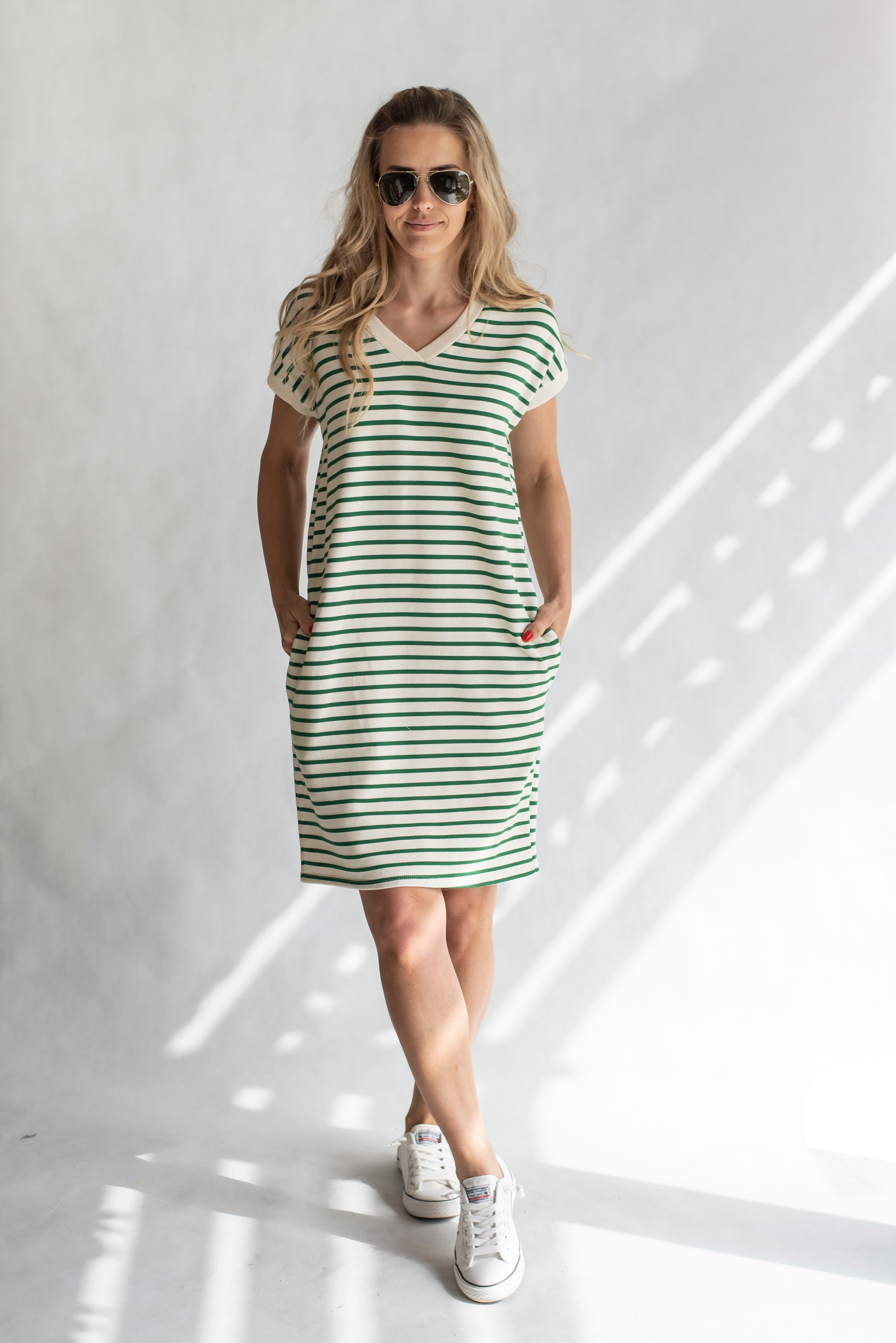 Dámské trendy šaty s proužkem, výstřihem do "V", všité kapsy, Italské značky Mooij