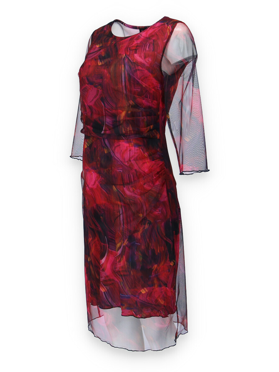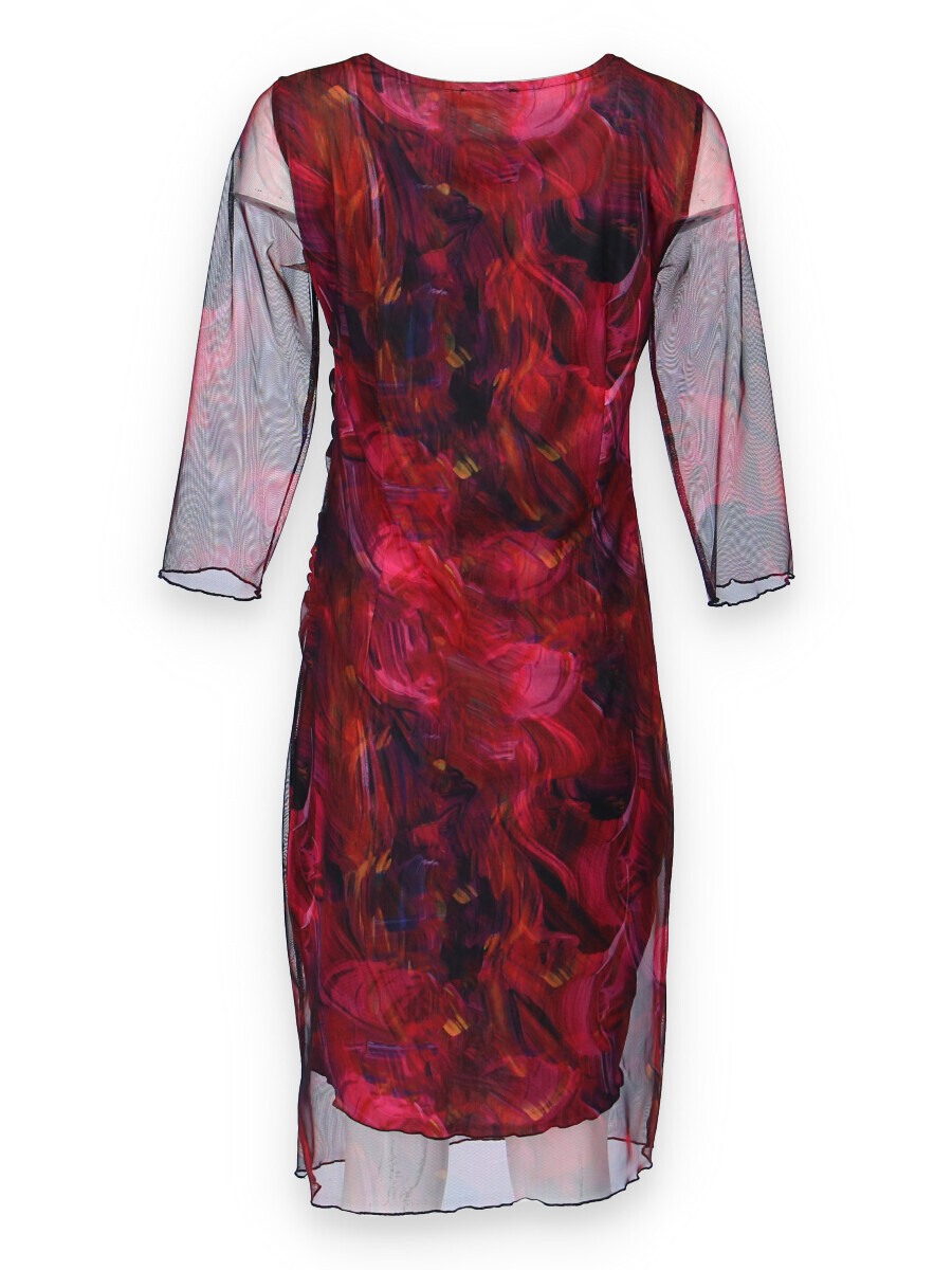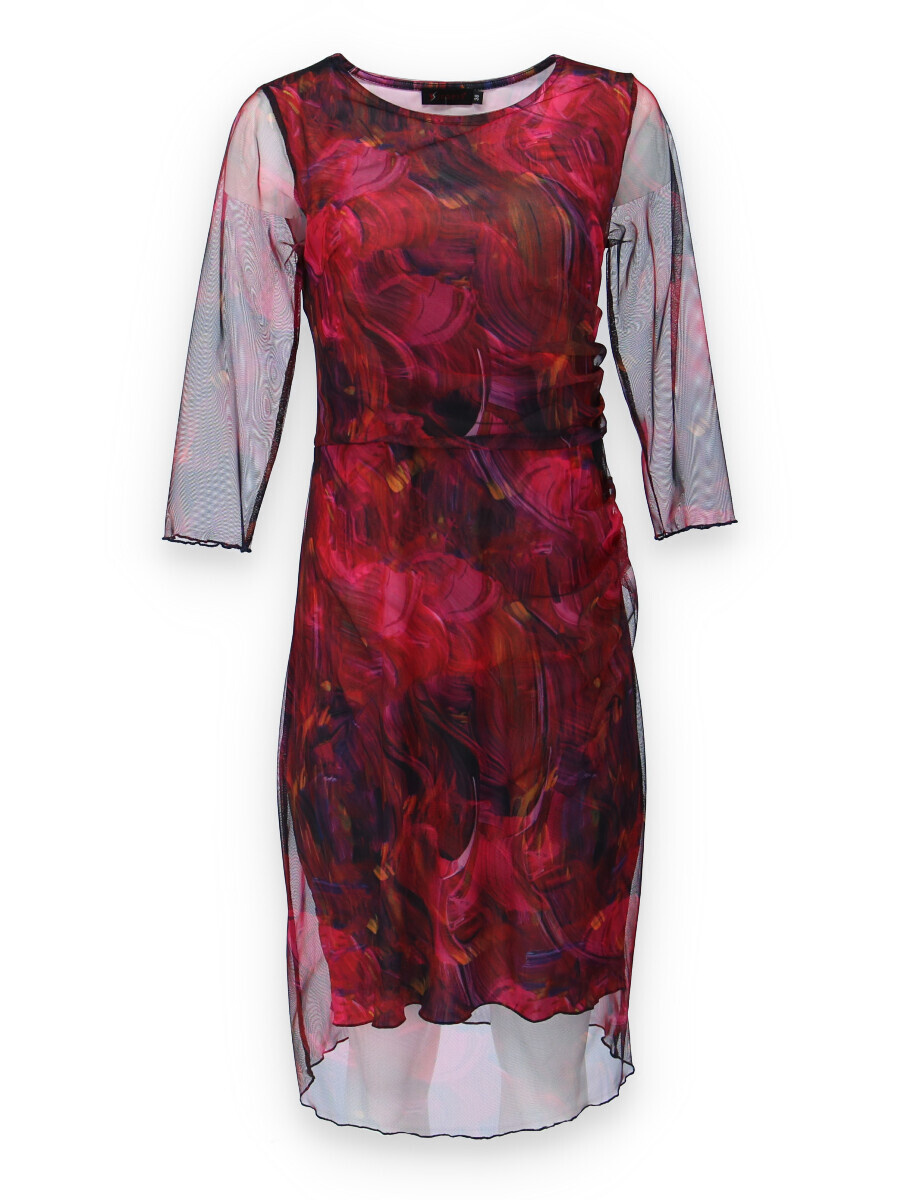 Elegantní společenské šaty s 3/4 rukávem ve červené až bordó barvě s délkou ke kolenům vhodné i na denní nošení, řasená sukně